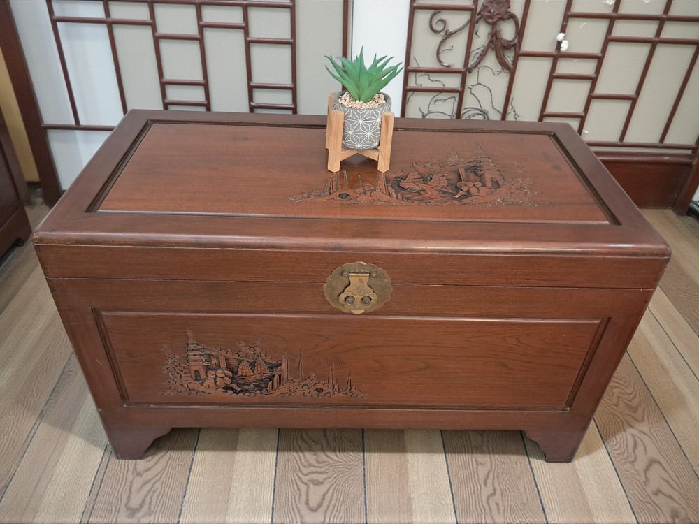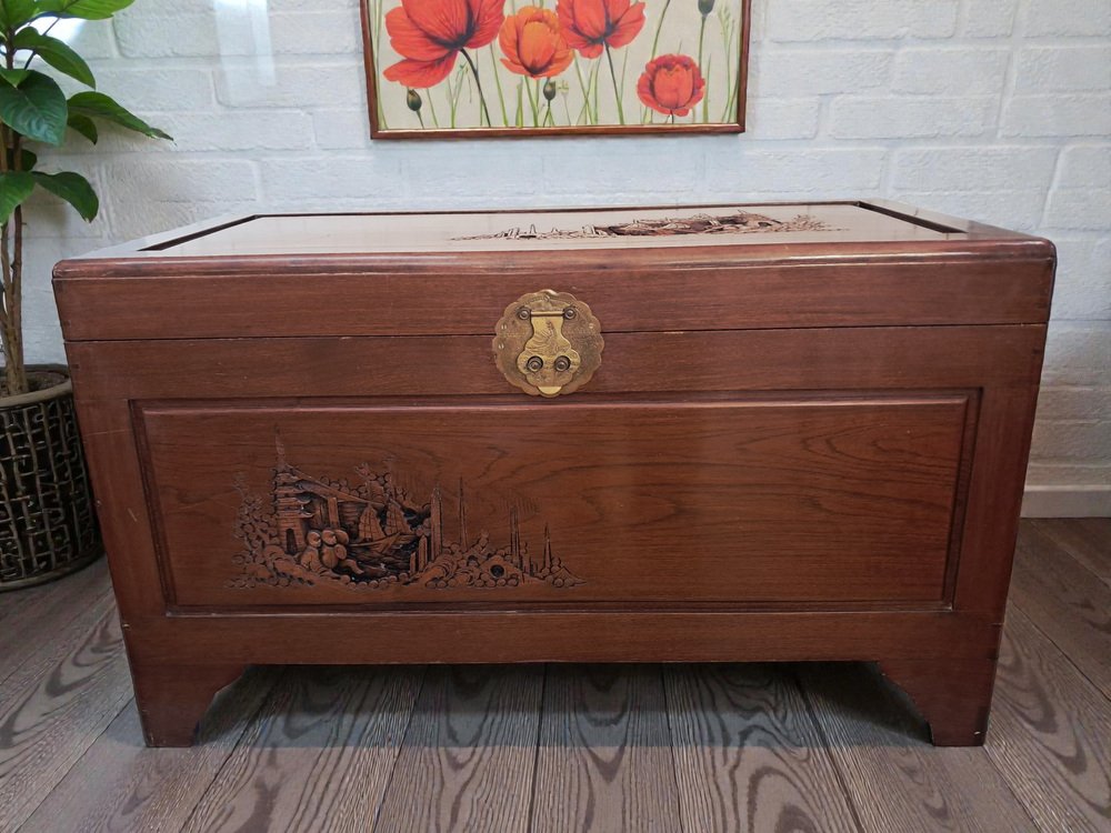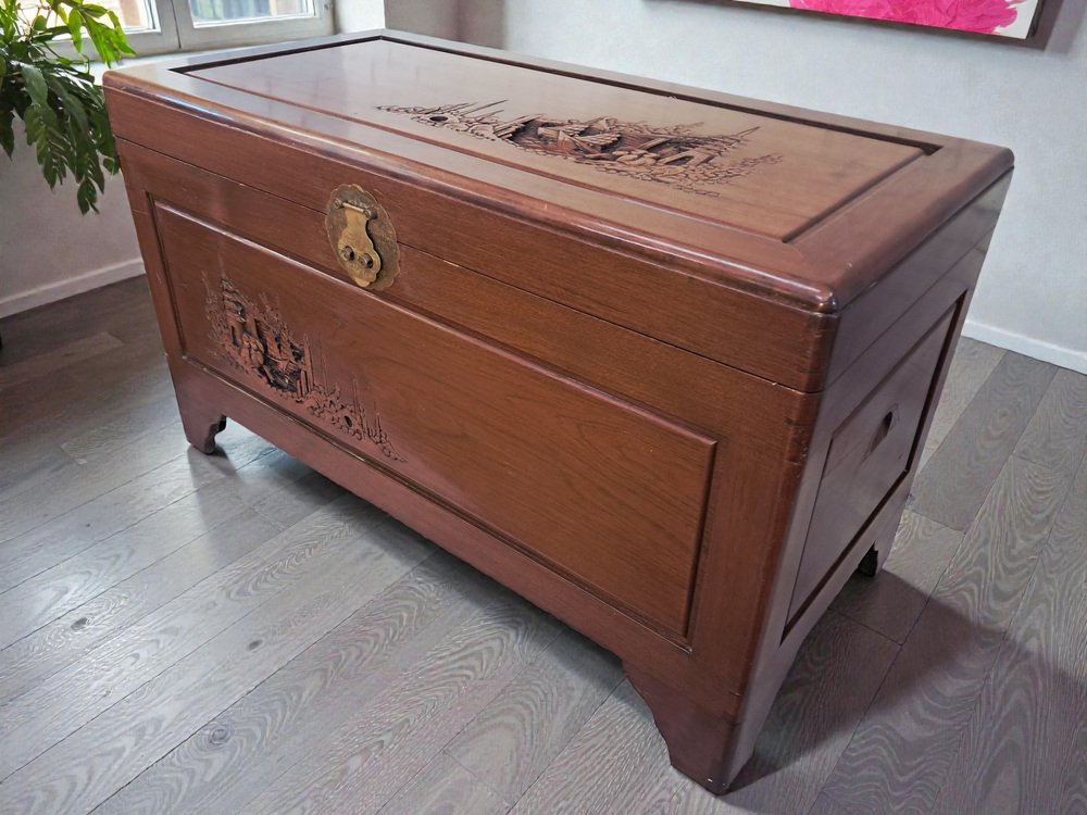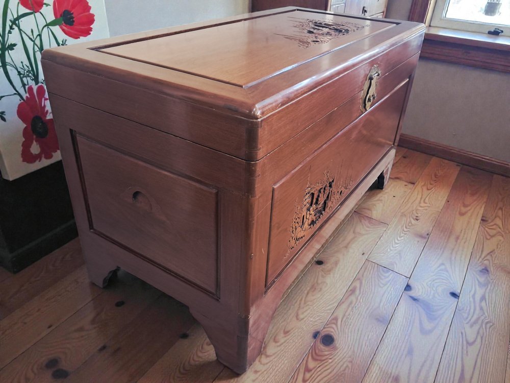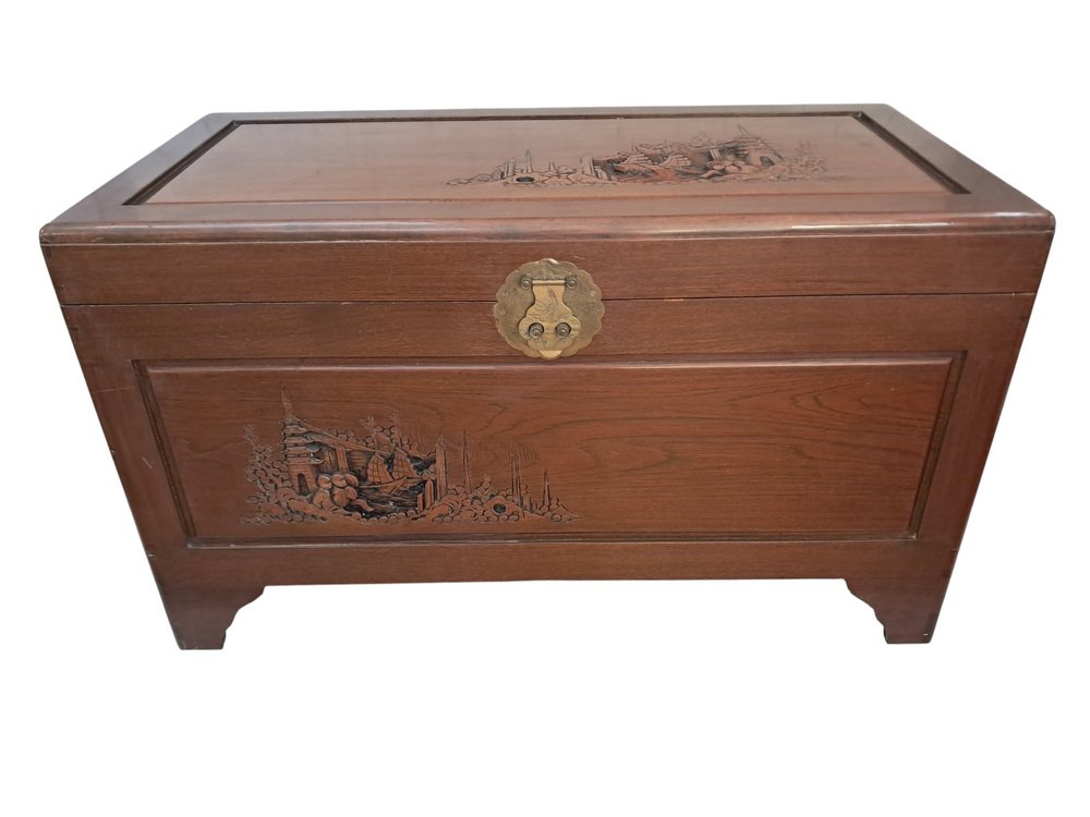 Vintage Oriental Carved Camphor Wood Trunk 1940