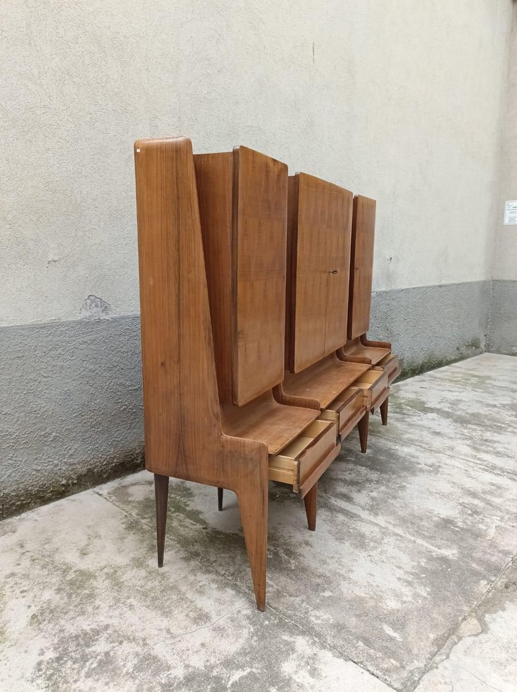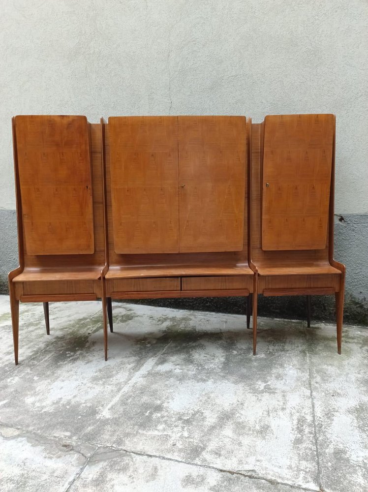 An important wall unit made in Cantù (Italy, ca. 1955), consisting of a bench with drawer fronts and three wall units with walnut doors with a geometric design. The right compartment houses a bar with a mirrored interior, glass shelves, and a functioning lighting system (restored). The design, due to its proportions, tapered legs, and refined veneers, is attributed to the circle of Paolo Buffa / Vittorio Dassi for the La Permanente Mobili Cantù school. The piece has been recently restored: the finish has been checked, the mechanisms have been overhauled, and the lighting system in the bar has been brought up to standard. A piece of high-quality workmanship and a strong visual impact, it is ideal as a living room/bar unit for mid-century and contemporary interiors. La Permanente Mobili Cantù is a historic consortium of woodworking and furniture craftsmen and companies founded in Cantù at the end of the 19th century (roots in 1893) to promote and market quality local craftsmanship. In the 1950s it became a point of reference for mid-century Italian design, collaborating with designers and architects such as Paolo Buffa, Vittorio Dassi, Ico Parisi and others, and supporting cultural initiatives such as the Selettiva del Mobile (from 1955), which helped to project “Cantù furniture” onto the international scene.