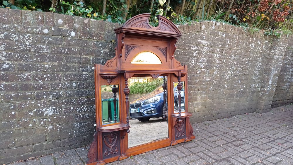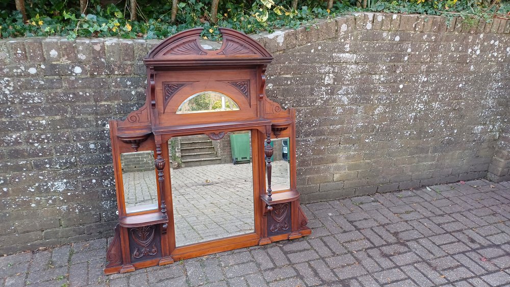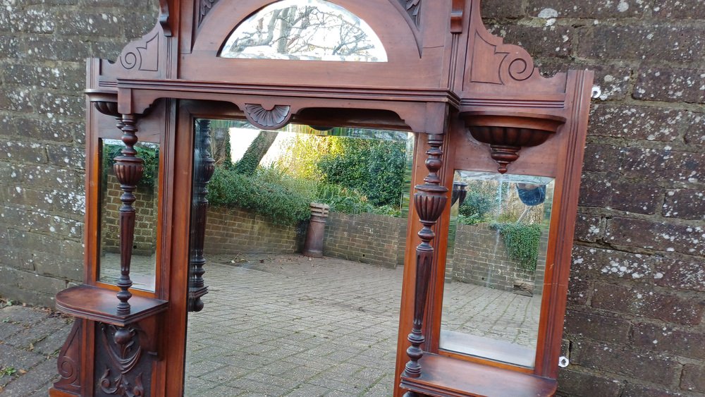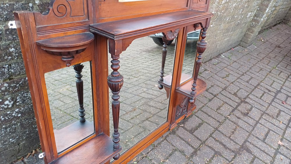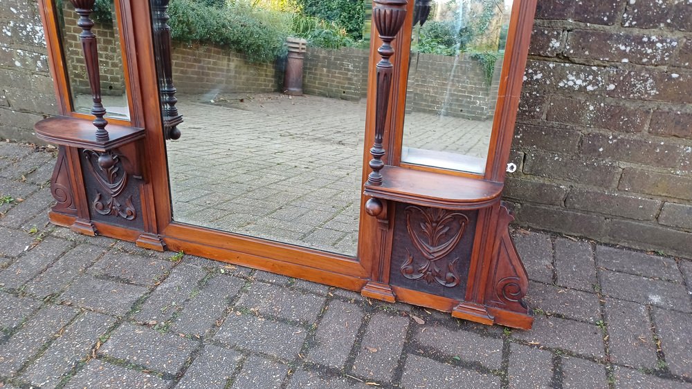Make a bold statement in your home with this massive, imposing mahogany overmantel mirror that exudes a touch of class and timeless elegance. Crafted with exceptional attention to detail, this piece features four bevelled mirrors surrounded by intricate decorative elements, making it the perfect centrepiece for any mantel or large wall space.