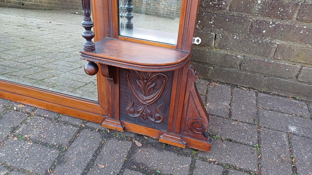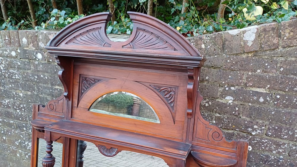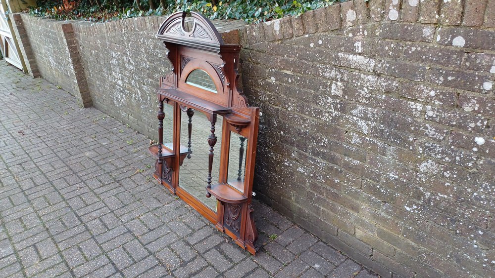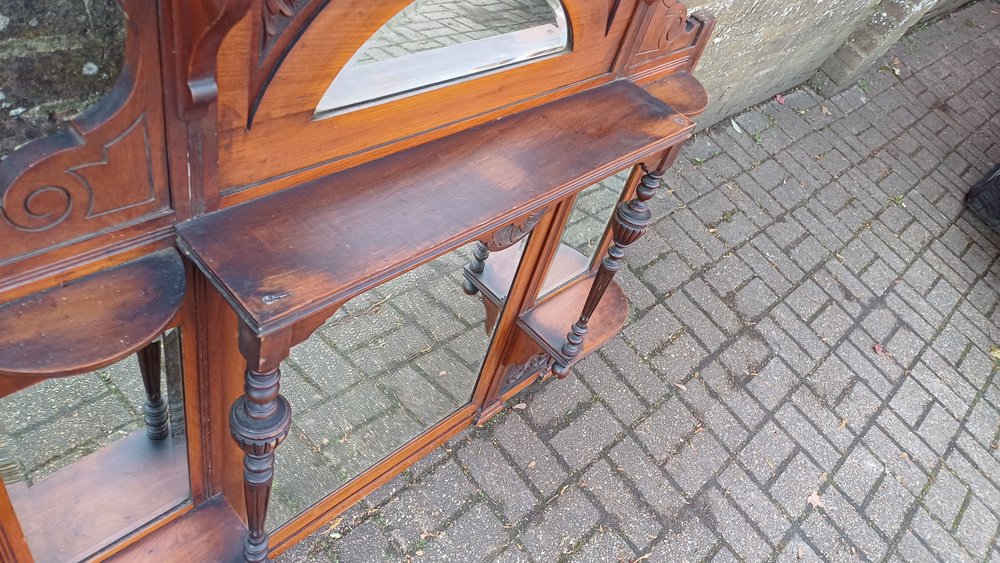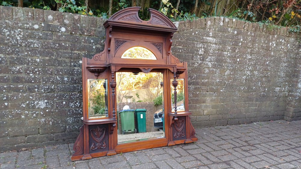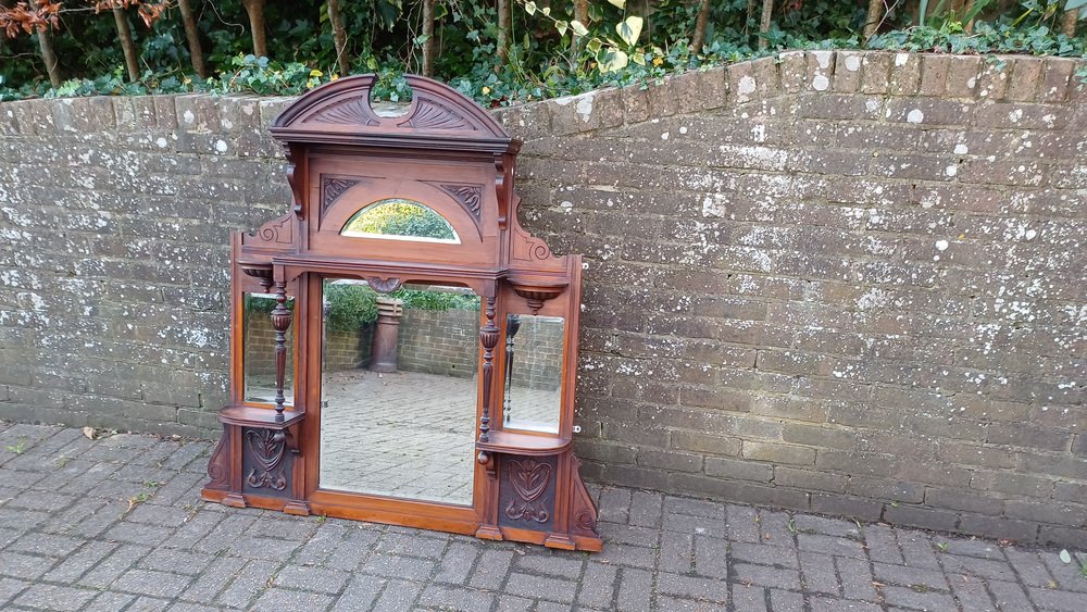 Make a bold statement in your home with this massive, imposing mahogany overmantel mirror that exudes a touch of class and timeless elegance. Crafted with exceptional attention to detail, this piece features four bevelled mirrors surrounded by intricate decorative elements, making it the perfect centrepiece for any mantel or large wall space.
