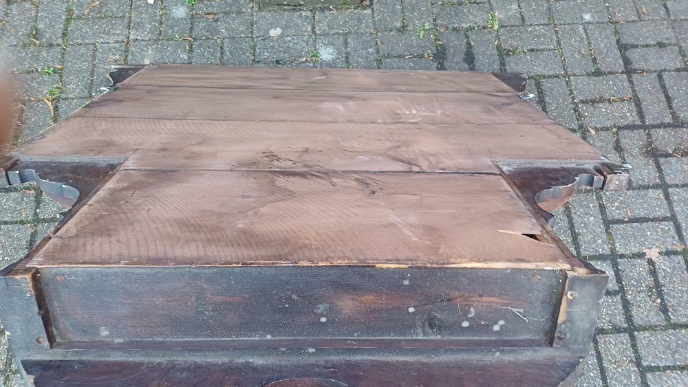Comme vous pouvez le voir sur les images, il est en très bon état. À l'origine, il devait avoir des fleurons au sommet, où l'on peut voir des trous rebouchés. Sur les miroirs principaux, il y a quelques marques de surface mineures qui ne se remarquent que lors d'une inspection minutieuse. Mais wow, quatre beaux verres biseautés individuels et épais.