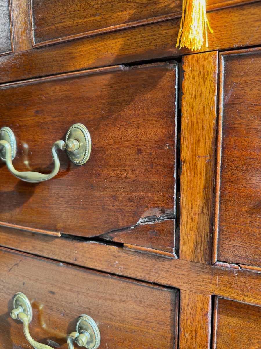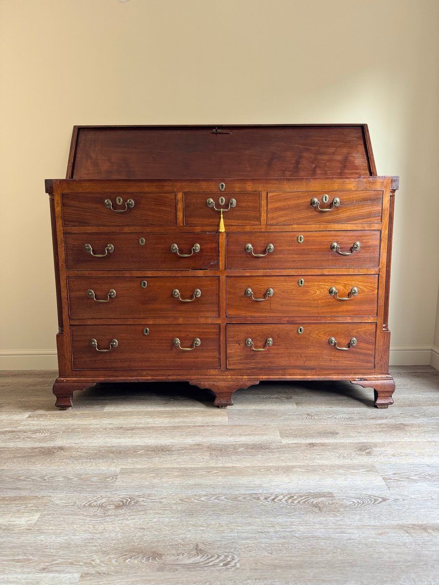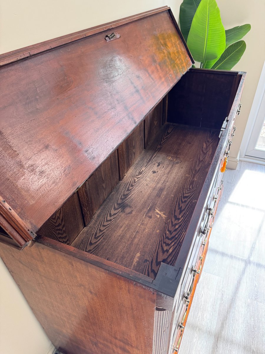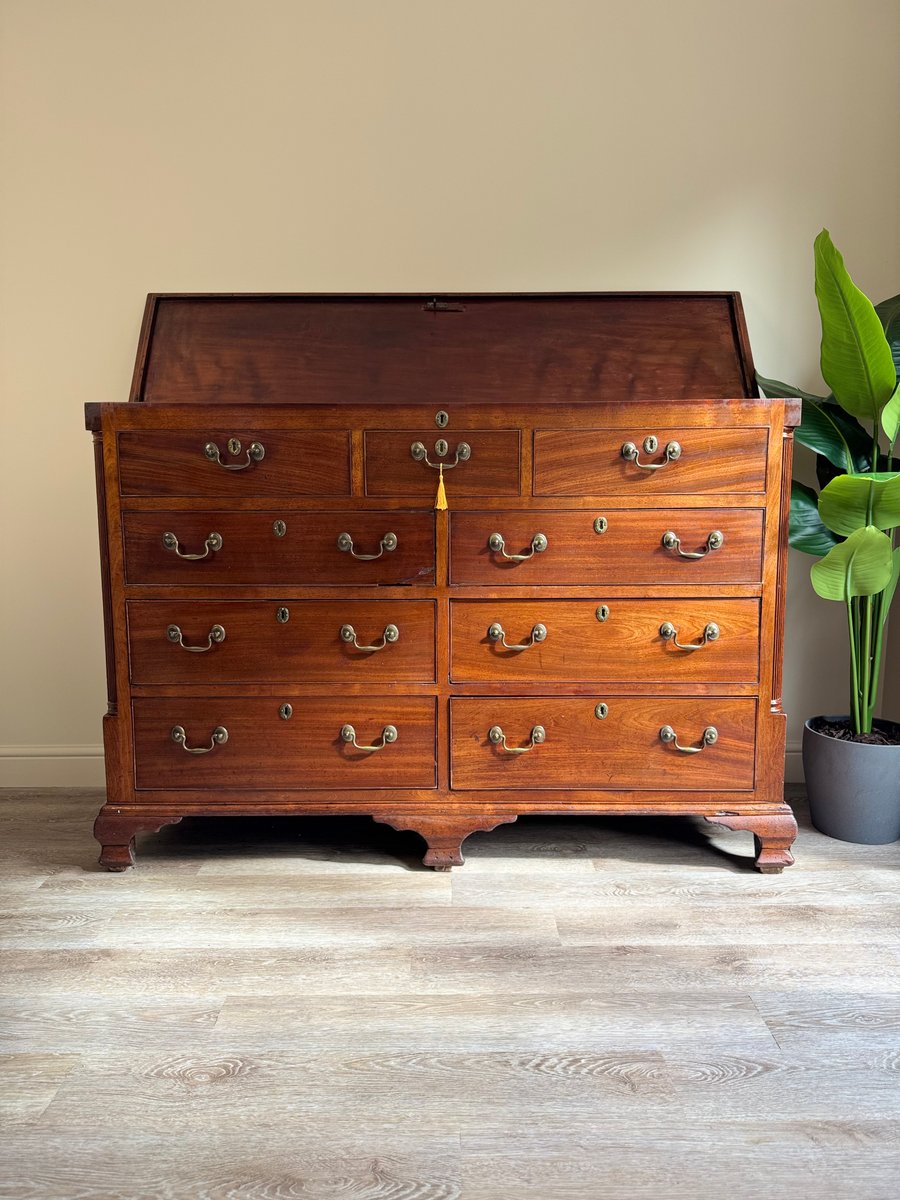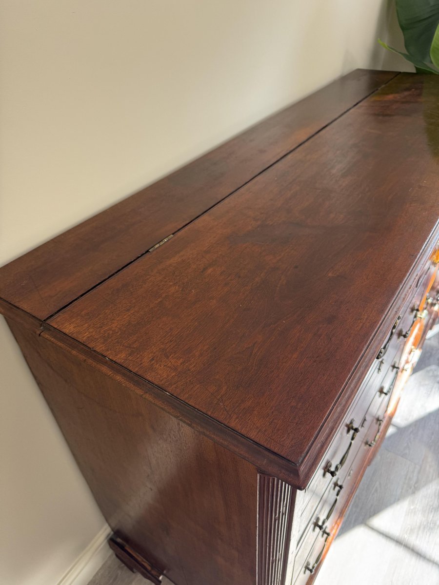 The warm patina of the mahogany showcases its rich grain, while the bracket feet and clean lines are true to the timeless Georgian style. Both practical and decorative, this chest provides ample storage and would make a striking addition to a living room, hallway, study, or bedroom.
