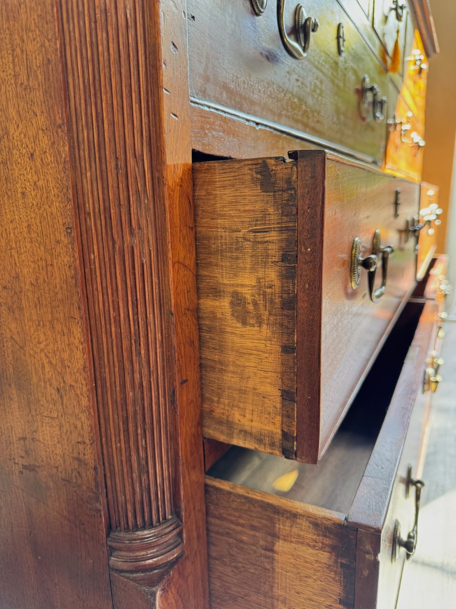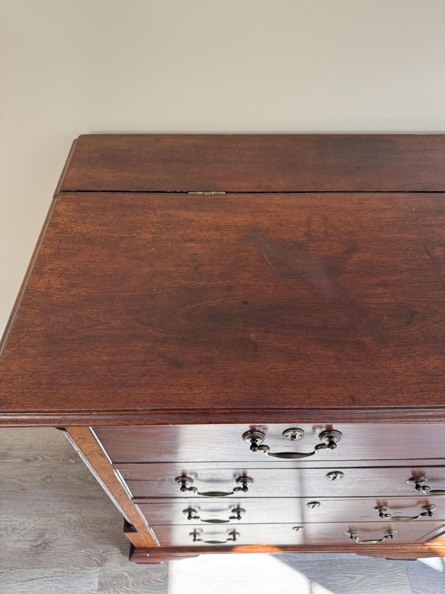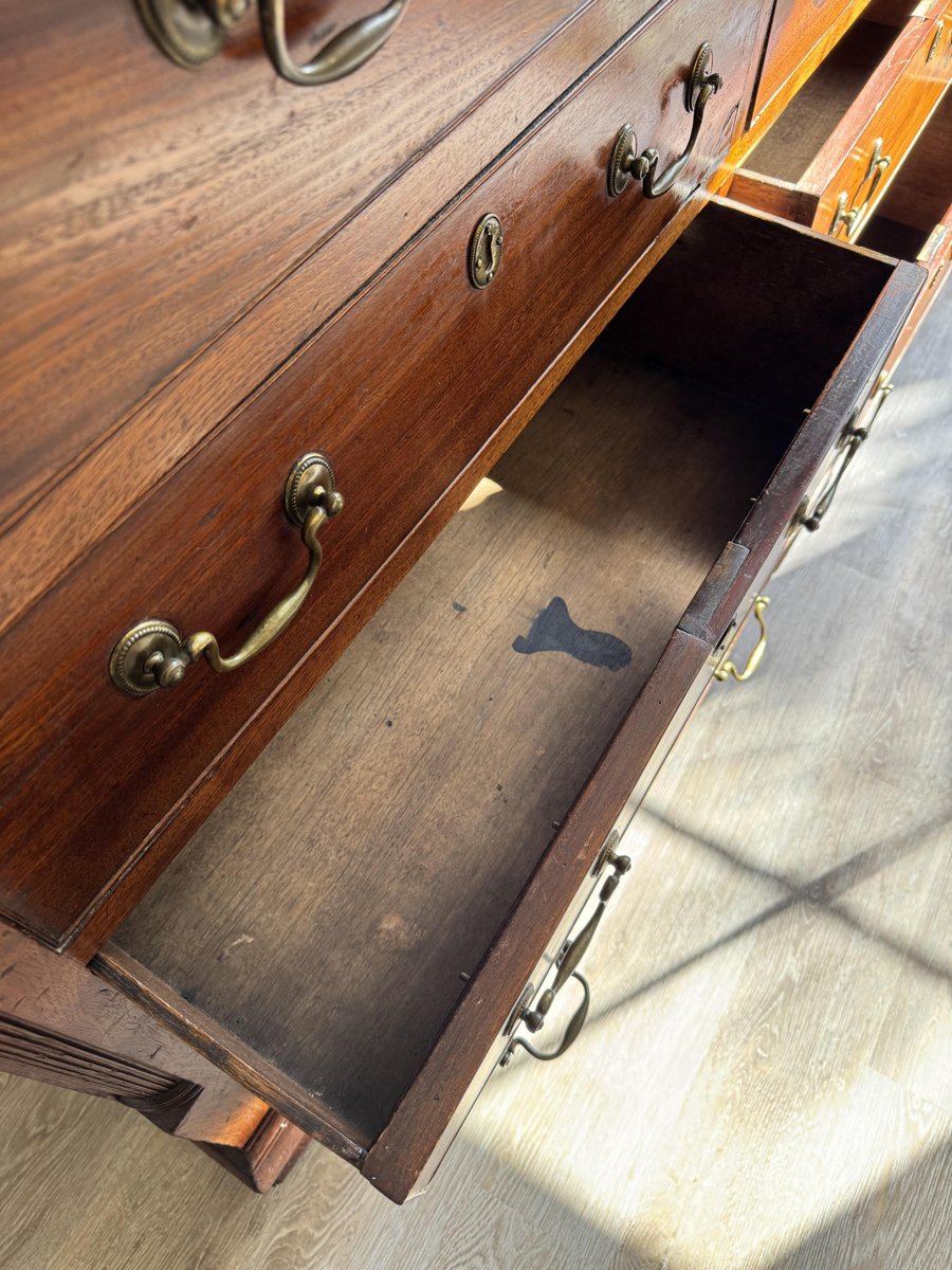 La patine chaude de l'acajou met en valeur la richesse de son grain, tandis que les pieds en équerre et les lignes épurées sont fidèles au style géorgien intemporel. À la fois pratique et décorative, cette commode offre un grand espace de rangement et serait un ajout remarquable dans un salon, un couloir, un bureau ou une chambre à coucher.