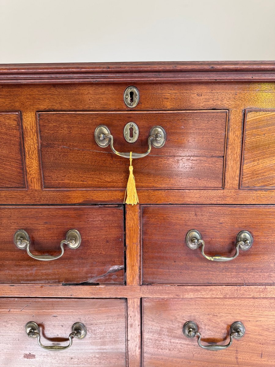 A stunning late 18th century Georgian (George III) mahogany chest, beautifully crafted and full of period character. This elegant piece features a lift-up chest at the top, complemented by four fully functioning drawers below, each fitted with original keyholes and handles.