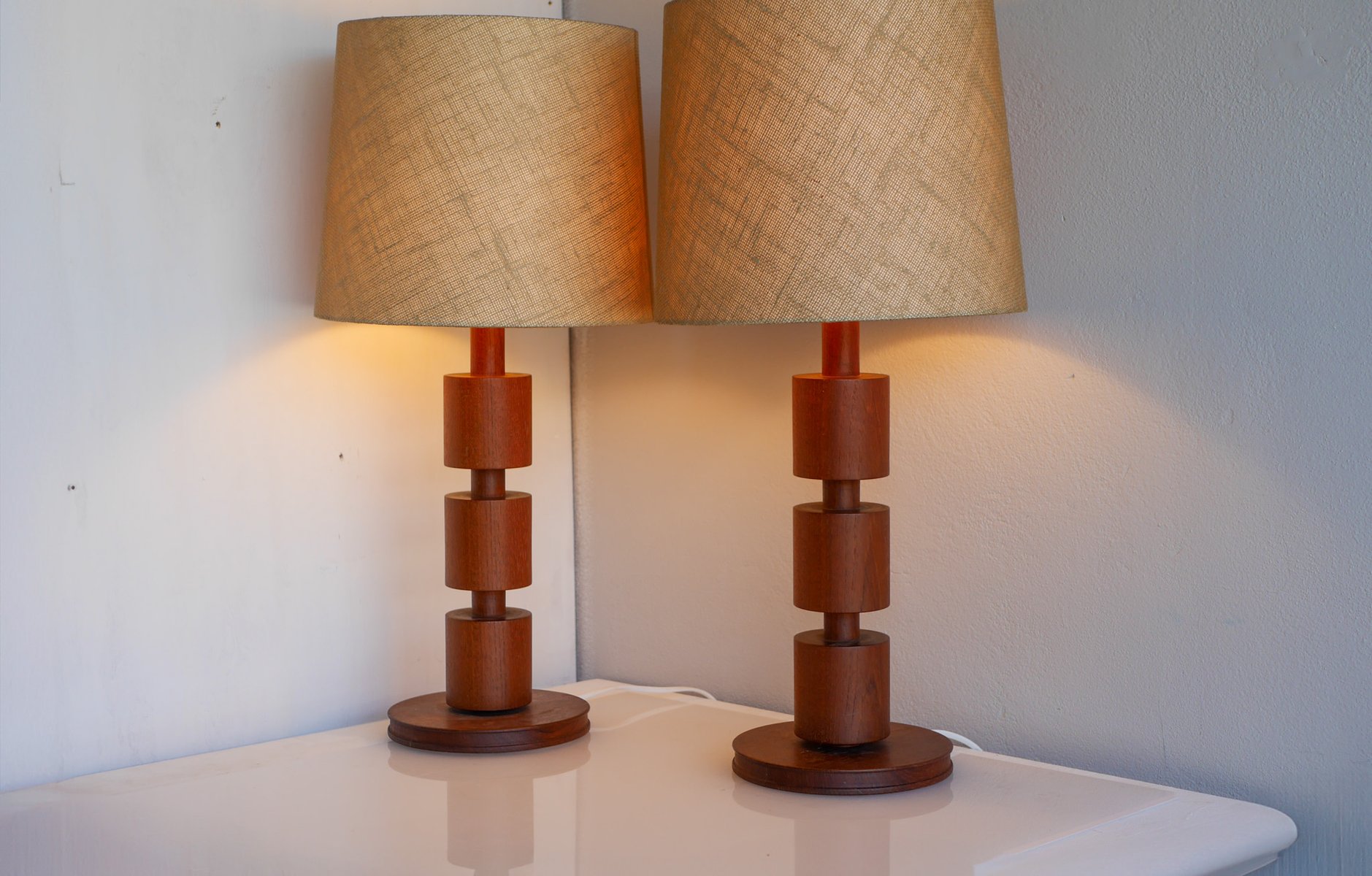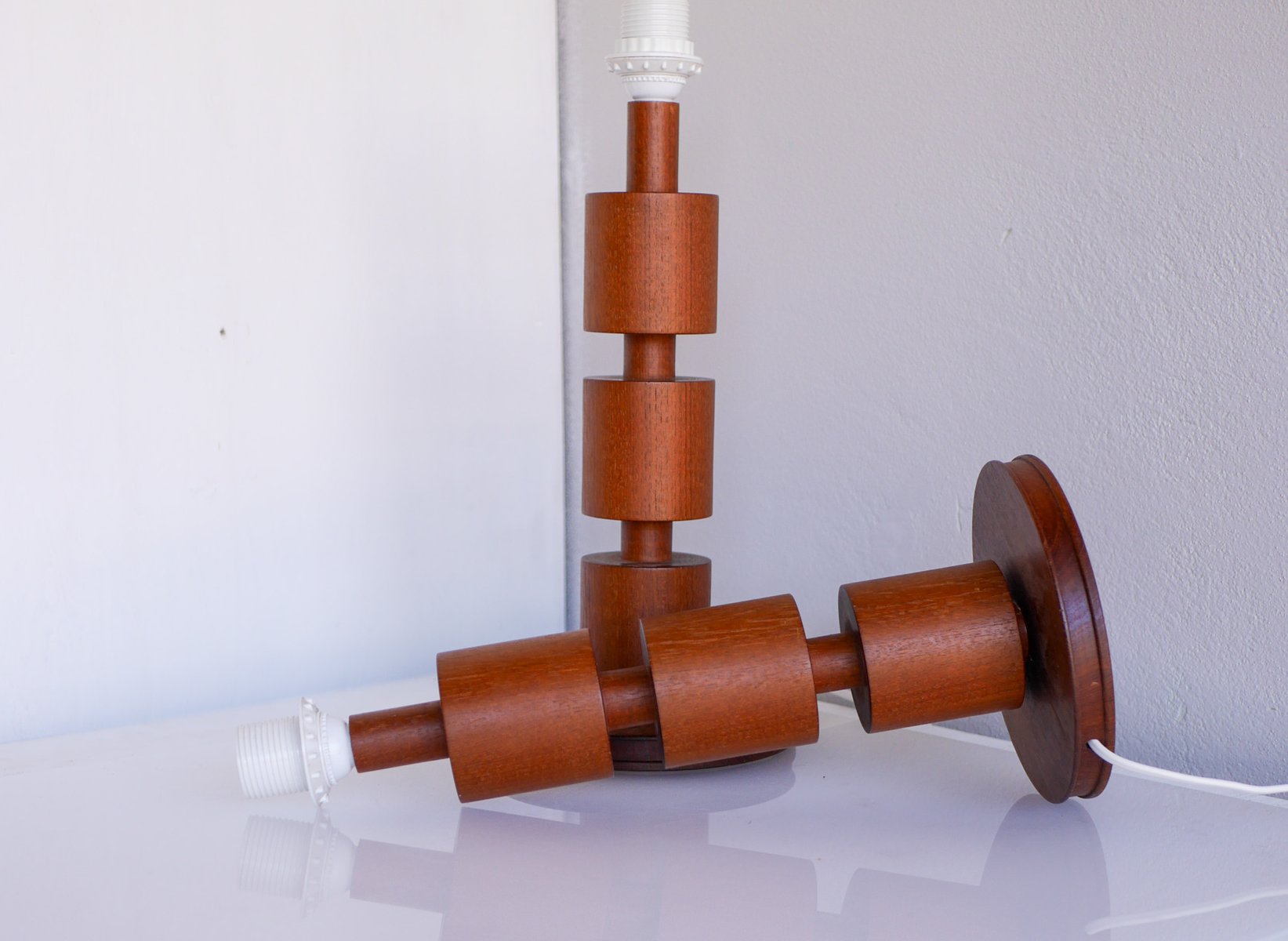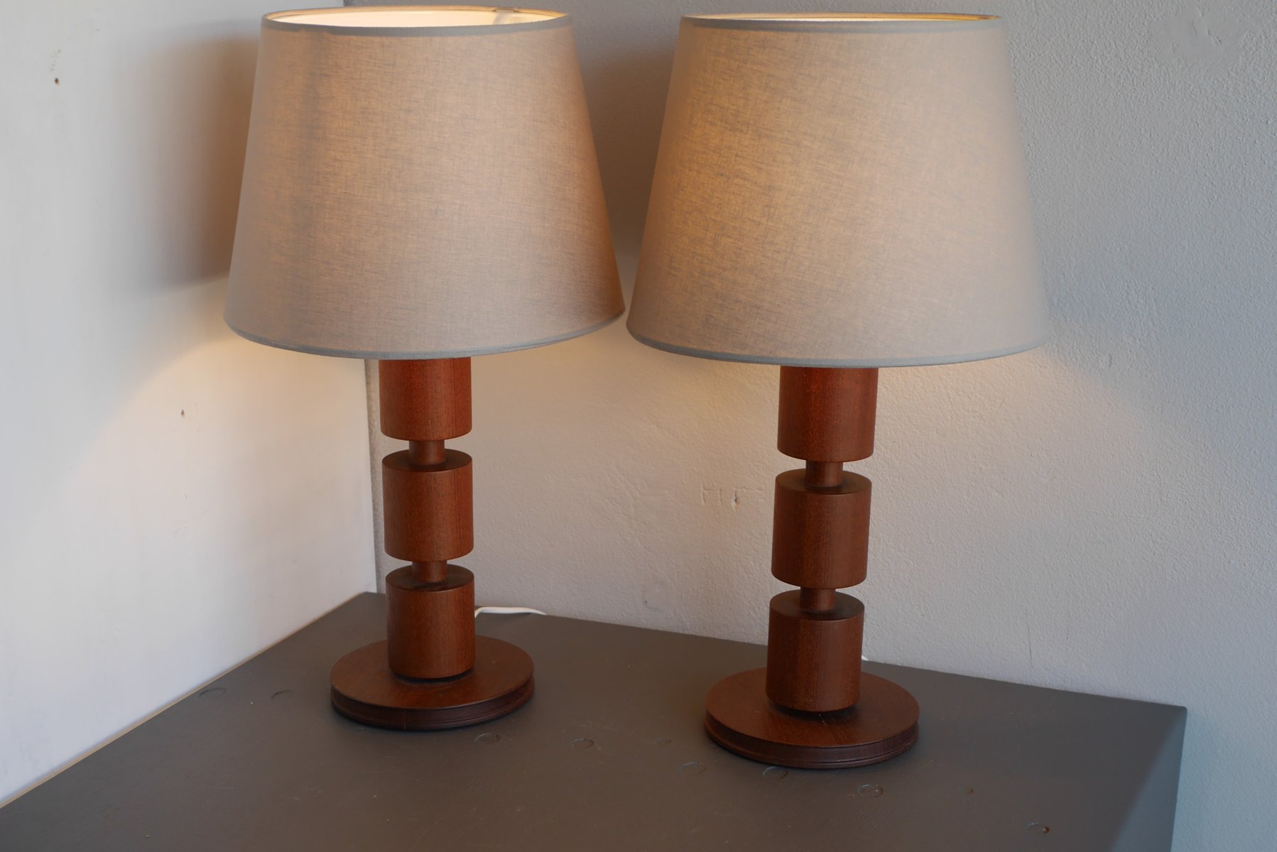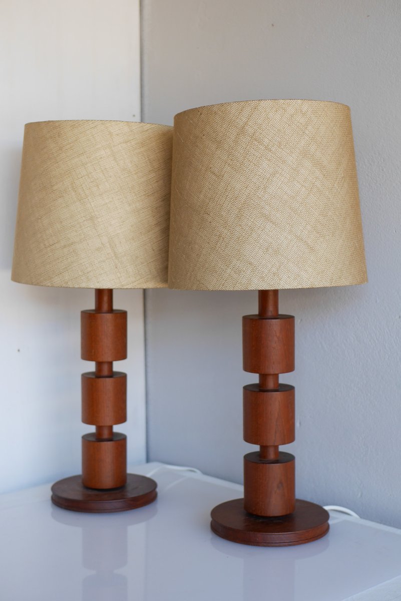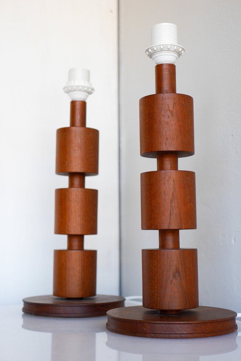 - They are 44cm (17.32") high with the lamp fitting and around 18cm (7.08") in diameter at the base. NOTE that these lamps have been newly rewired with electric plugs currently suitable for Sweden and most EU countries. There are some minor shallow dents and a very faint mark, yet overall, of a fantastic condition. The lampshades are not included. Note that we are not able to sell teak pruducts to Australia nor New Zealand due to import regulations, all orders will be canceled.
