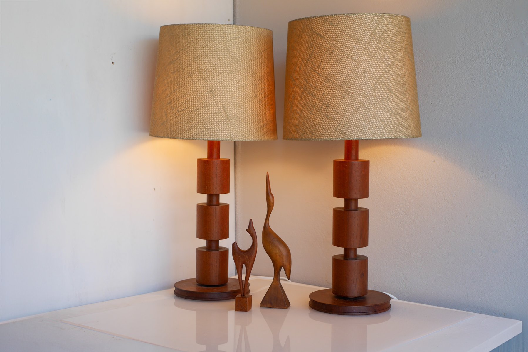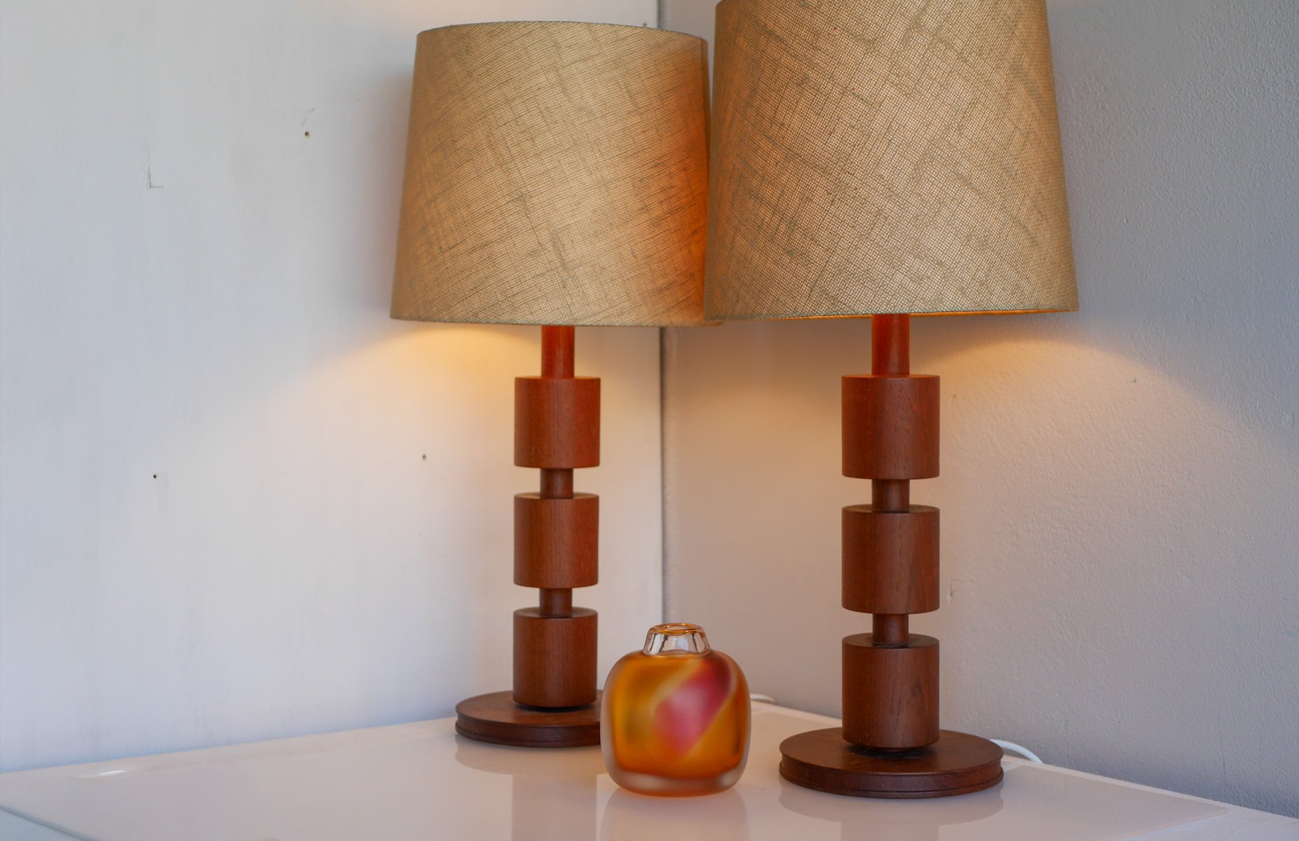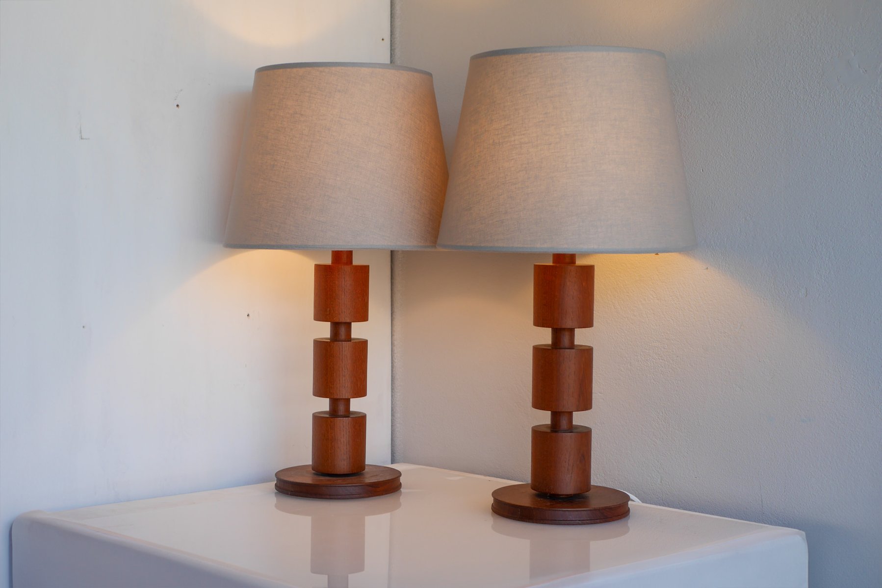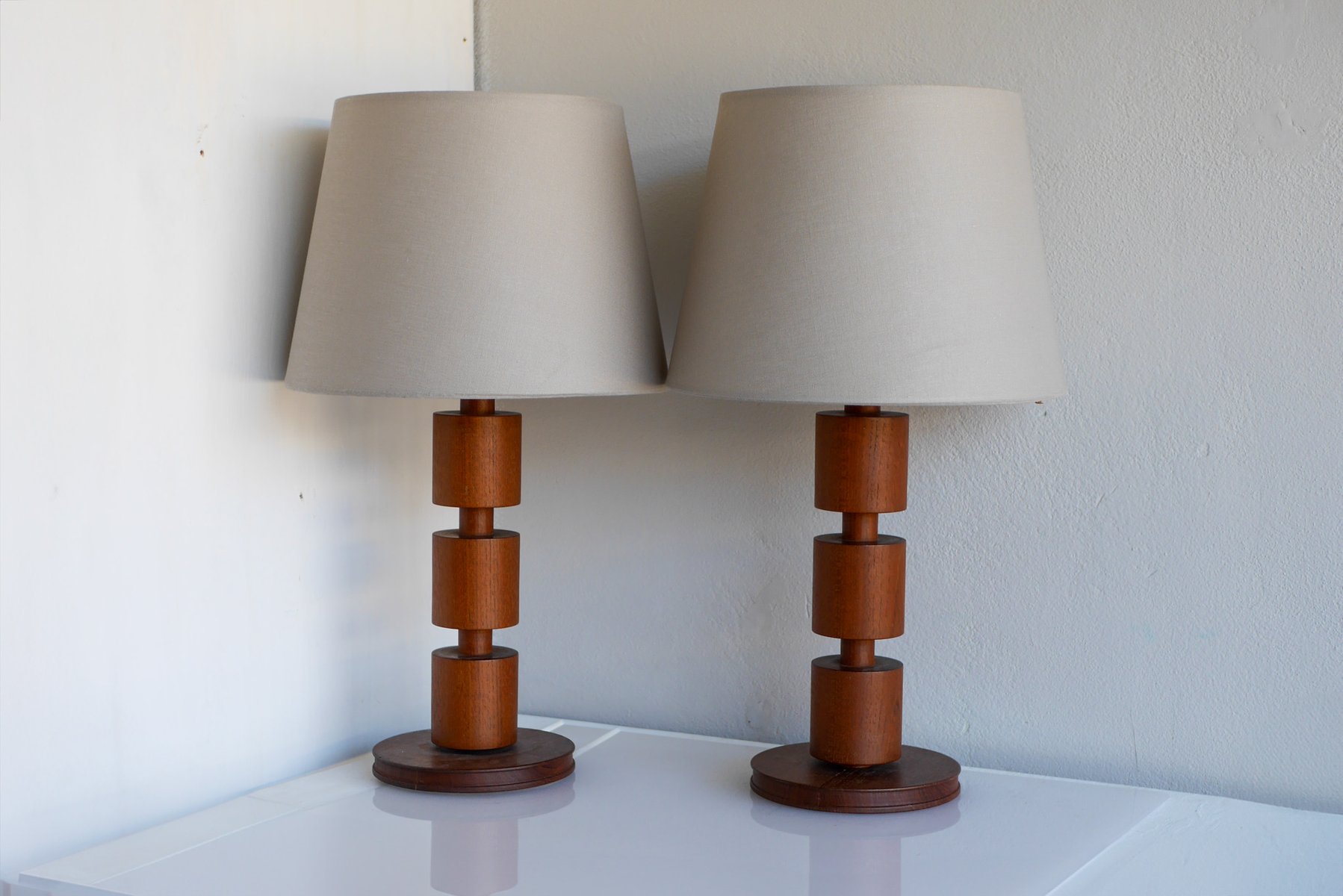 - They are 44cm (17.32") high with the lamp fitting and around 18cm (7.08") in diameter at the base. NOTE that these lamps have been newly rewired with electric plugs currently suitable for Sweden and most EU countries. There are some minor shallow dents and a very faint mark, yet overall, of a fantastic condition. The lampshades are not included. Note that we are not able to sell teak pruducts to Australia nor New Zealand due to import regulations, all orders will be canceled.