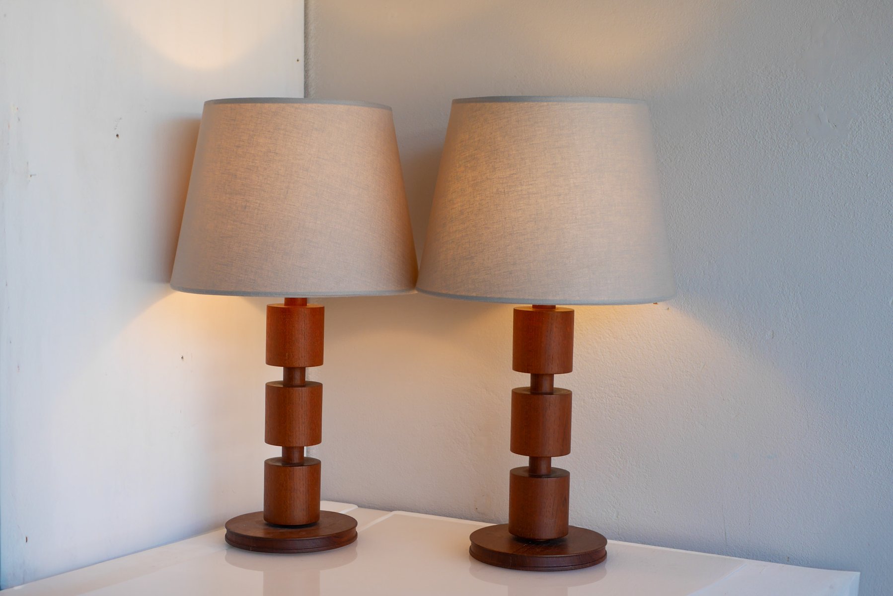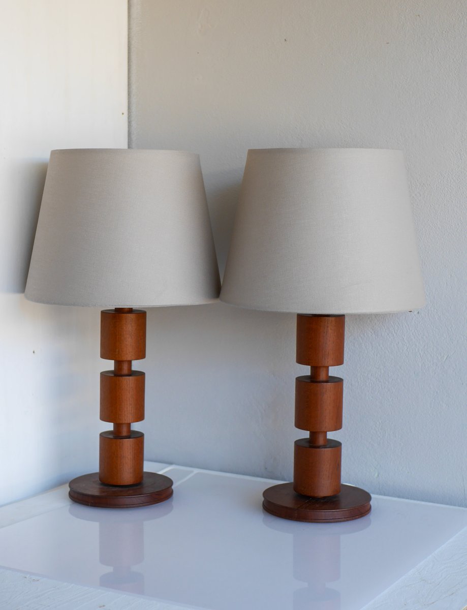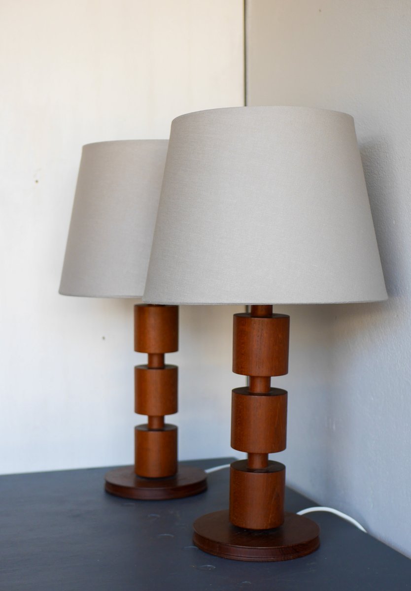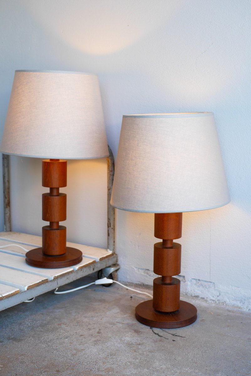 A stunning and rather large pair of vintage Scandinavian design teak lamps from the 60s. These lamps were made by Möllers Armatur, Eskilstuna, Sweden and has a fantastic lamp base, in a classic shape. They have been turned into three tiers, in a simple yet very effectful design, which makes these lamps both very useful, but also very elegant and sophisticated, as well as fantastic mid-century modern statement pieces, which will be an astonishing addition in any interior setting. They are in a really good condition and sold as a pair.