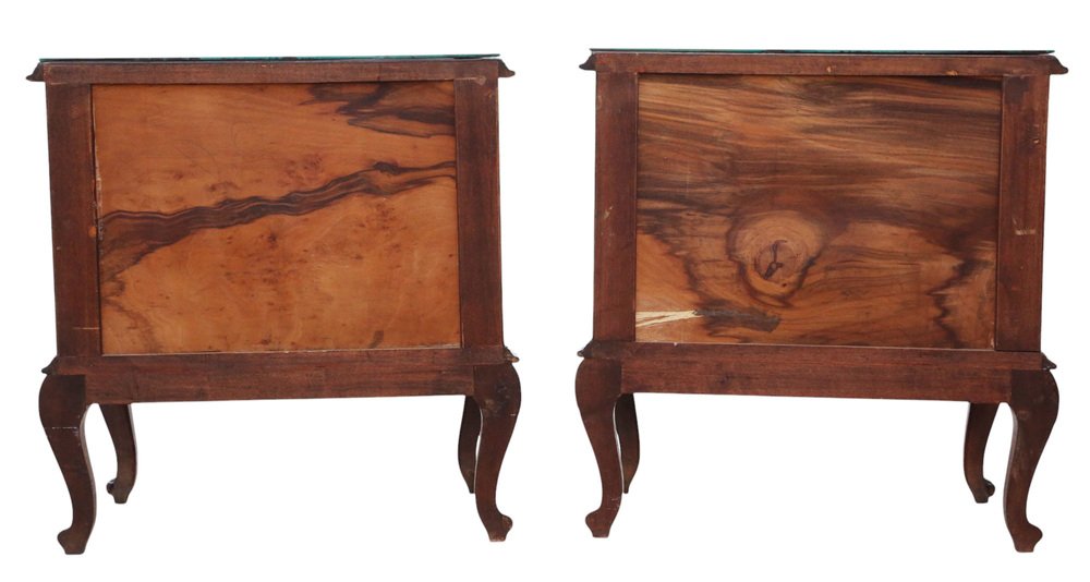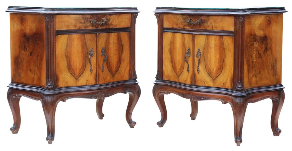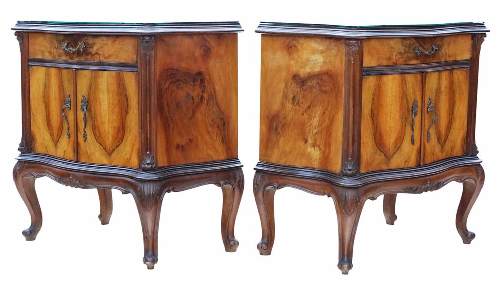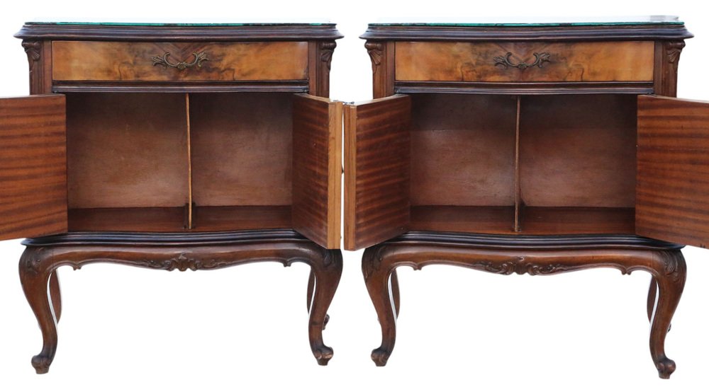 A rare and elegant pair of antique figured walnut bedside tables / cupboards, dating from the first half of the 20th century. These refined nightstands feature attractive walnut veneers with a serpentine front, carved cabriole legs, and decorative brass handles. Each table is topped with a quality loose marble glass cover, adding both practicality and style.