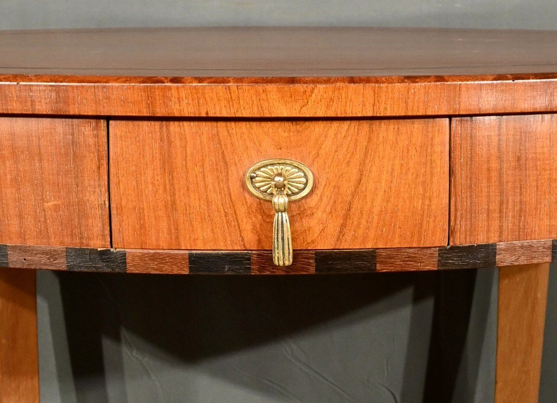 Elle se distingue par son petit tiroir en ceinture, orné d’une poignée tombante en bronze à décor de cordelette.