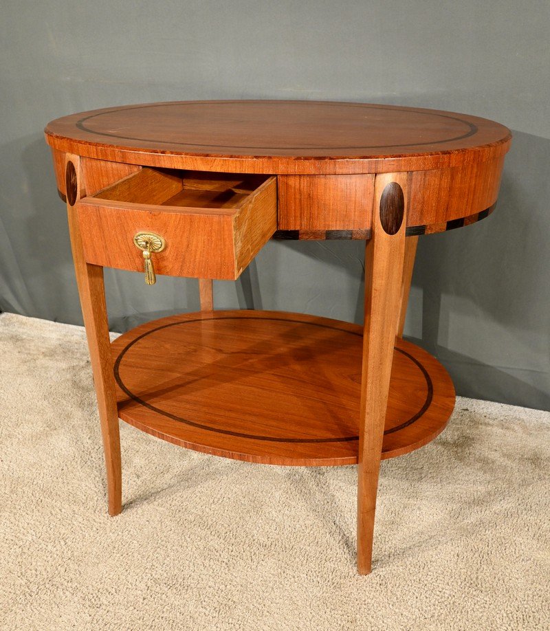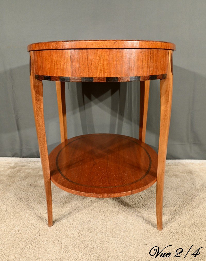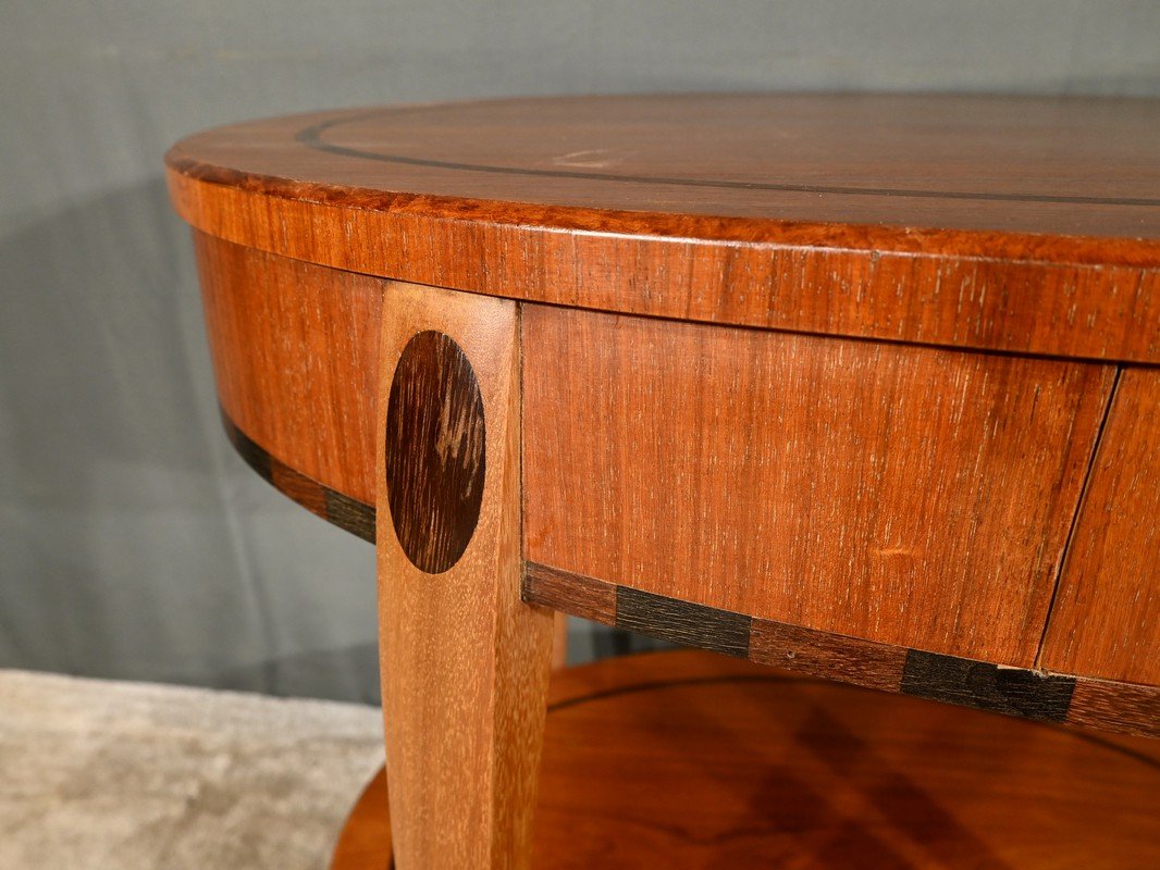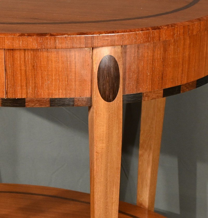 La ceinture de la table est embellie par une marqueterie alternant des rectangles de bois teinté, ajoutant une touche de sophistication.