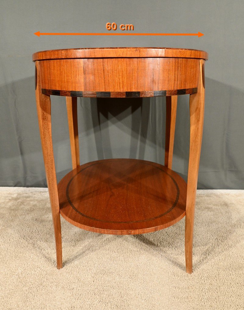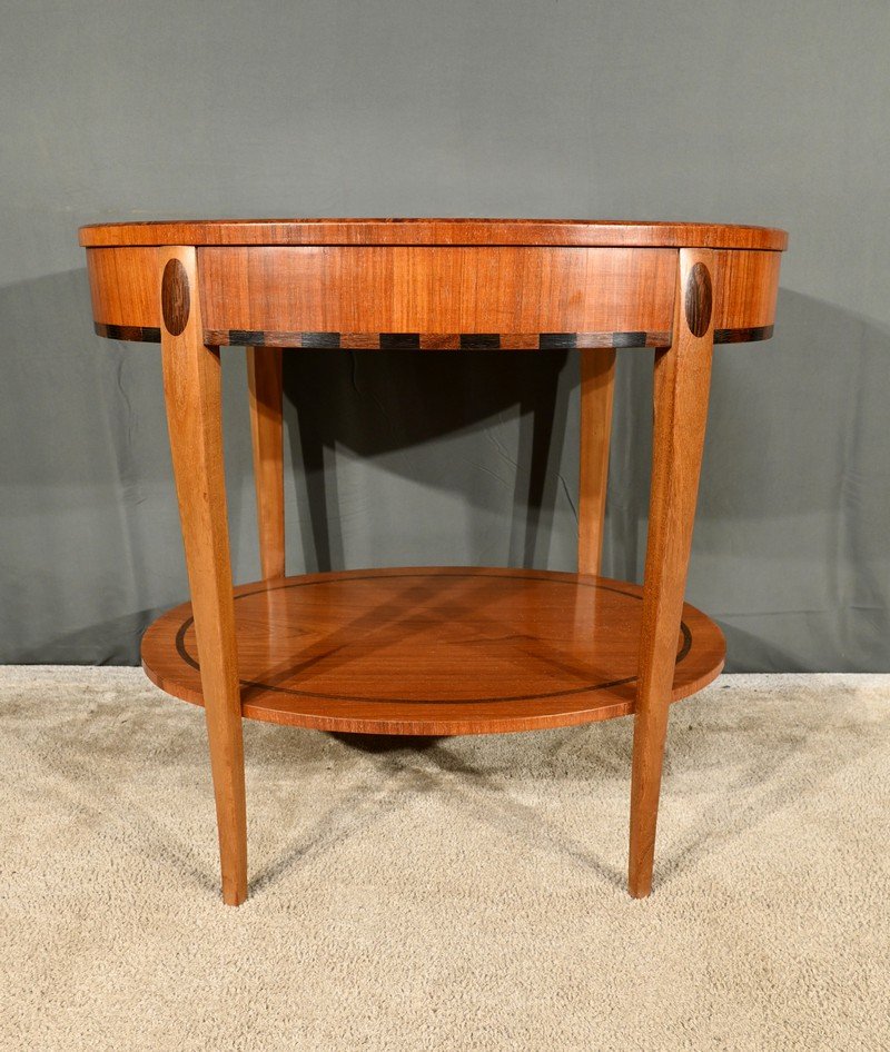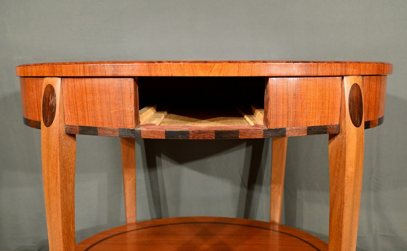 The table surround is embellished with marquetry alternating rectangles of stained wood, adding a touch of sophistication.
