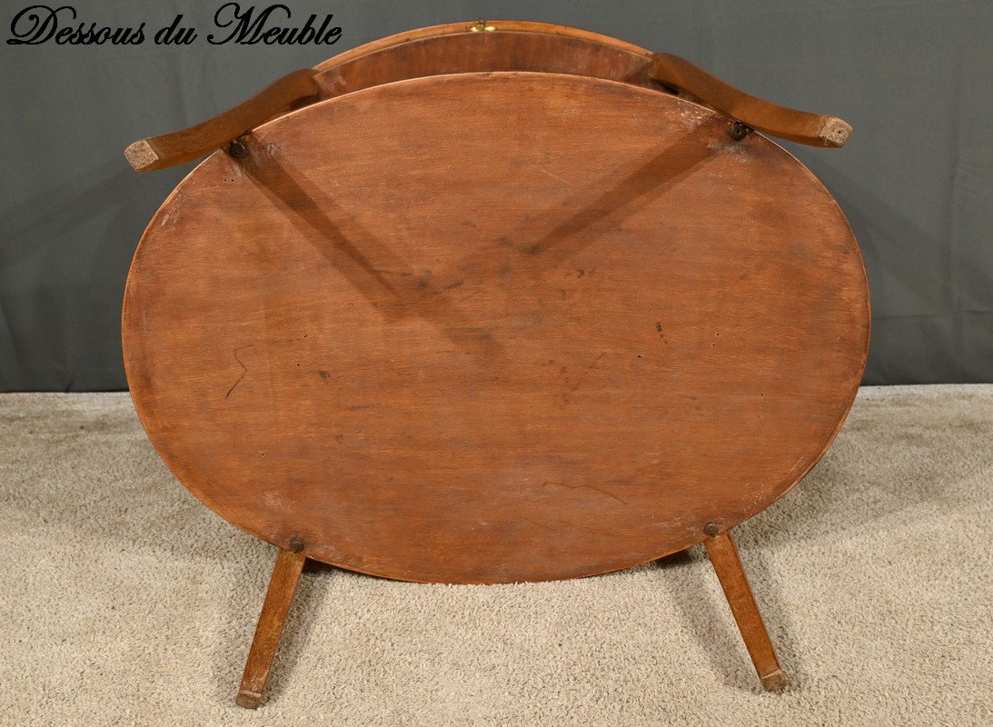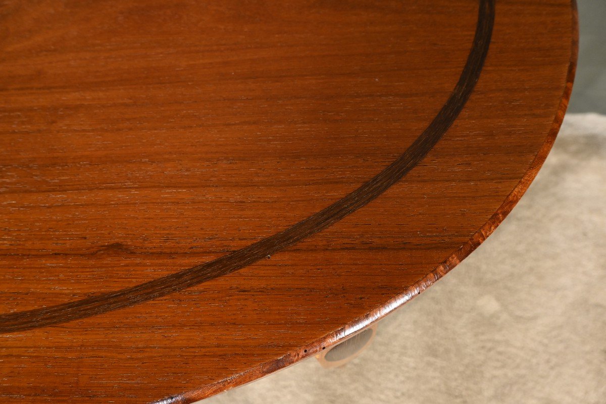 Les pieds, qui s’affinent vers le bas, sont ornés d’ovales en palissandre, ajoutant une dimension esthétique supplémentaire.