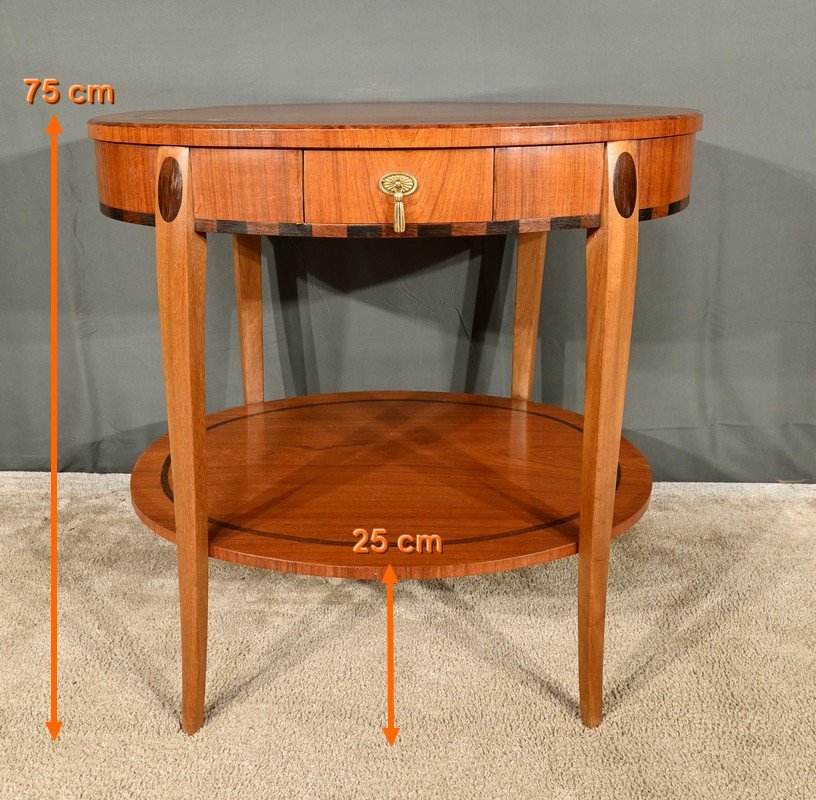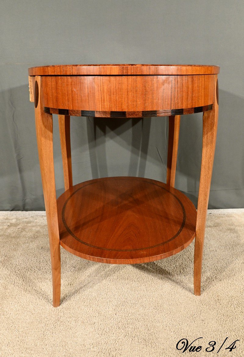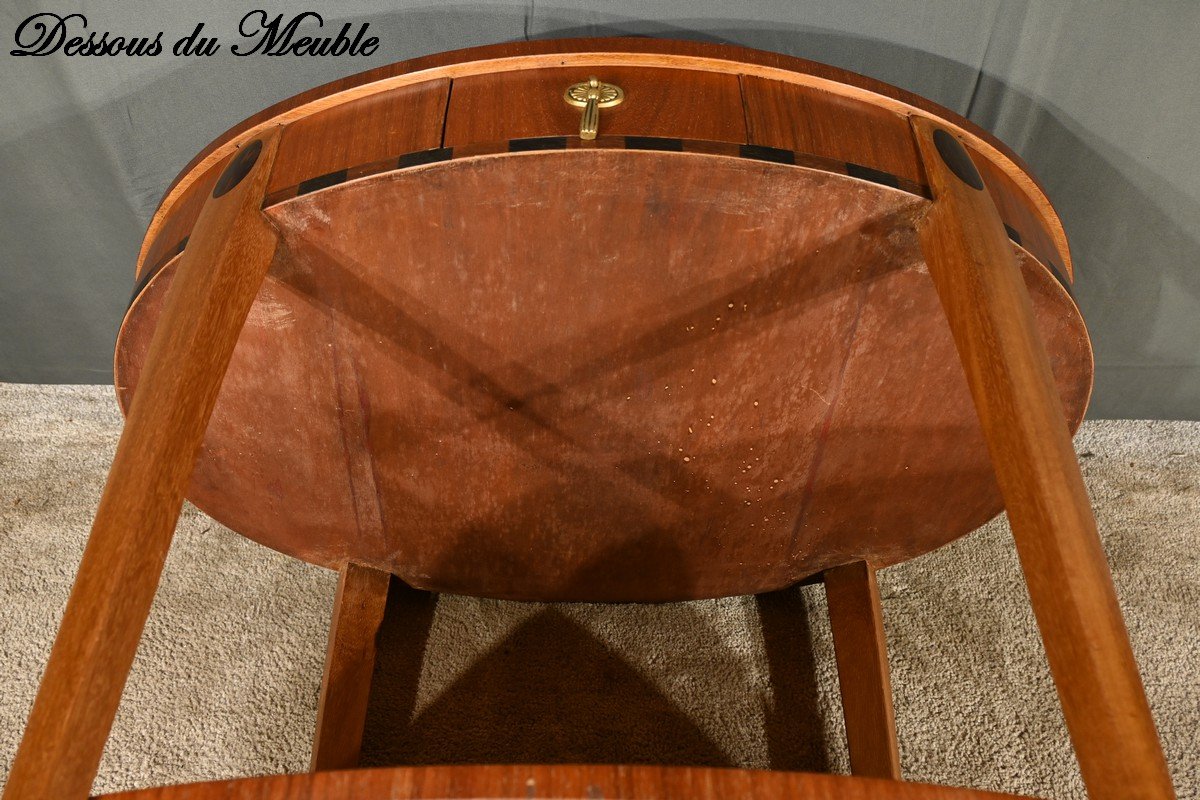 Cette table guéridon incarne parfaitement l’esprit de l’art déco, alliant fonctionnalité et esthétique avec des matériaux luxueux et des formes géométriques épurées.
