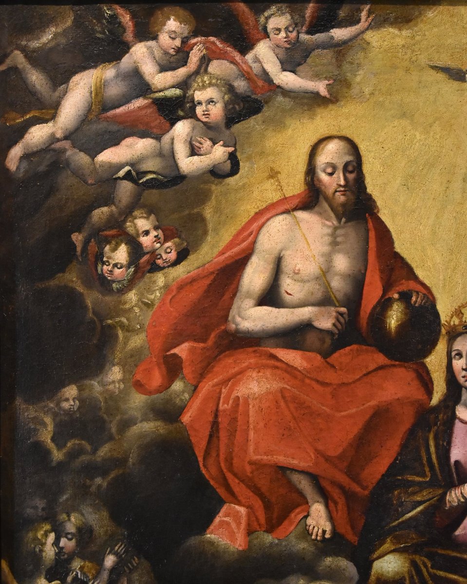 What makes our composition precious is the depiction of the crowned Marian seated on a throne of clouds, flanked by the three members of the Holy Trinity: God the Father blessing, Christ with the globus cruciger, and the white dove of the Holy Spirit.