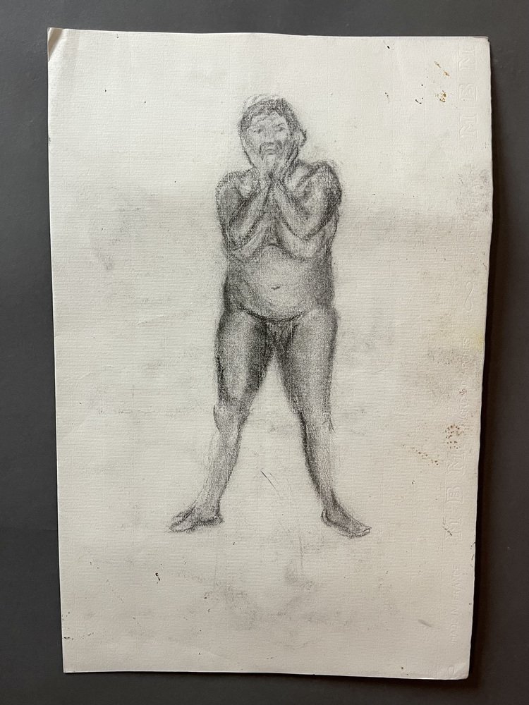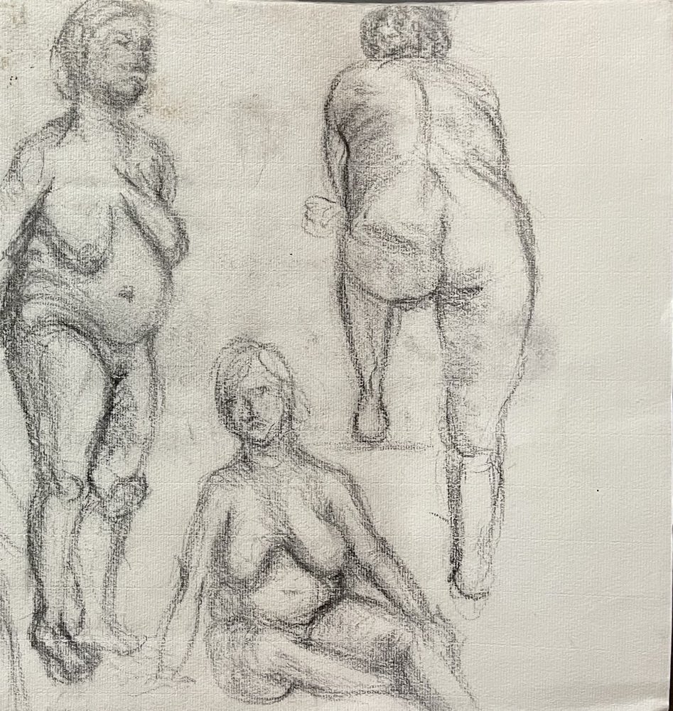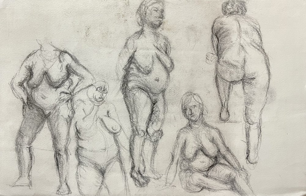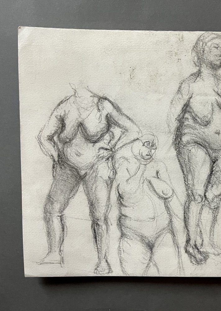 Intéressant et important dessin recto-verso d'un disciple du grand artiste anglais Henry Moore. Il représente avec beaucoup d'intensité et de profondeur expressive une série de nus photographiés dans différentes poses et expressions