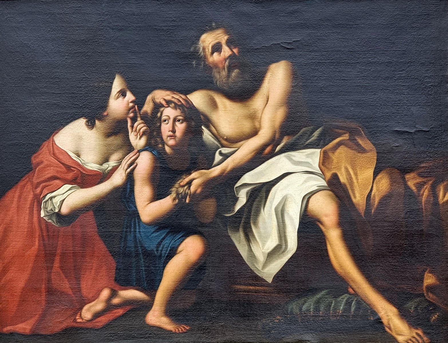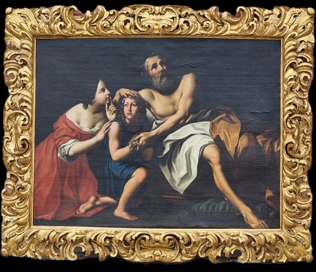 The work depicts the biblical moment in which Isaac, blind and wrapped in sheets and blankets, blesses Jacob. Sitting on the bed, Isaac holds his hands on the head and hands of the young Jacob, kneeling in front of him. To the left of the scene, Rebecca, also kneeling, encourages Jacob to carry out the deception against his father, holding a finger to her lips as a sign of silence.