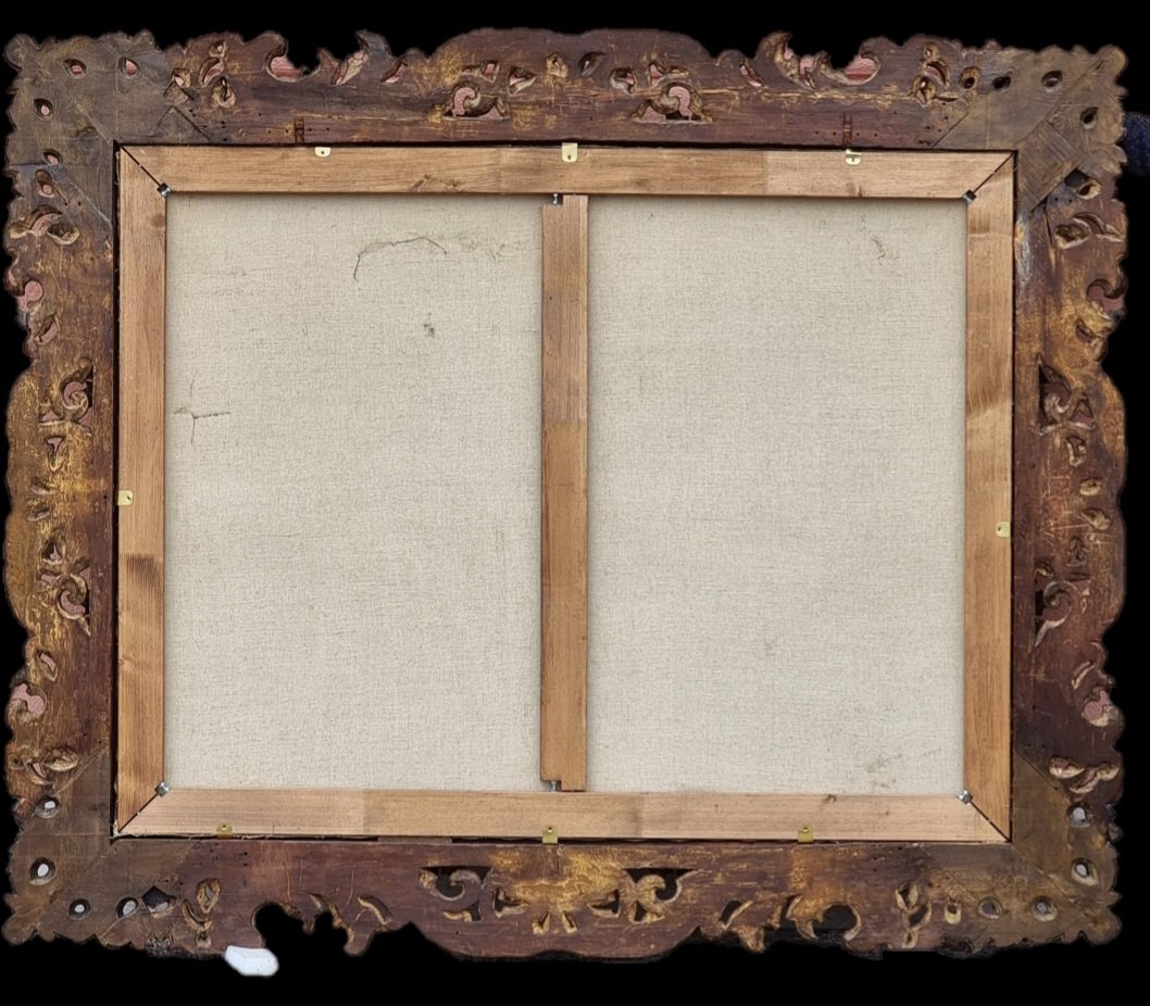 The application of color is meticulous and uniform, a distinctive feature of classical art, which gives depth and solemnity to the scene. The elaborate frame further enhances the importance of the work, framing it with elegance and grandeur.