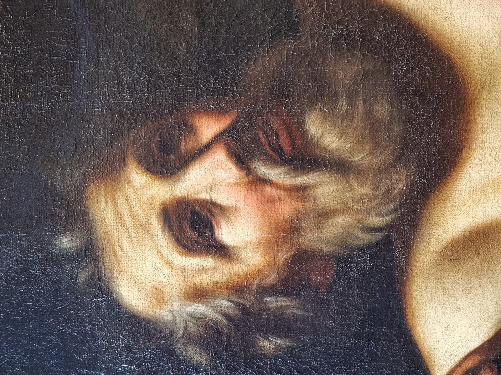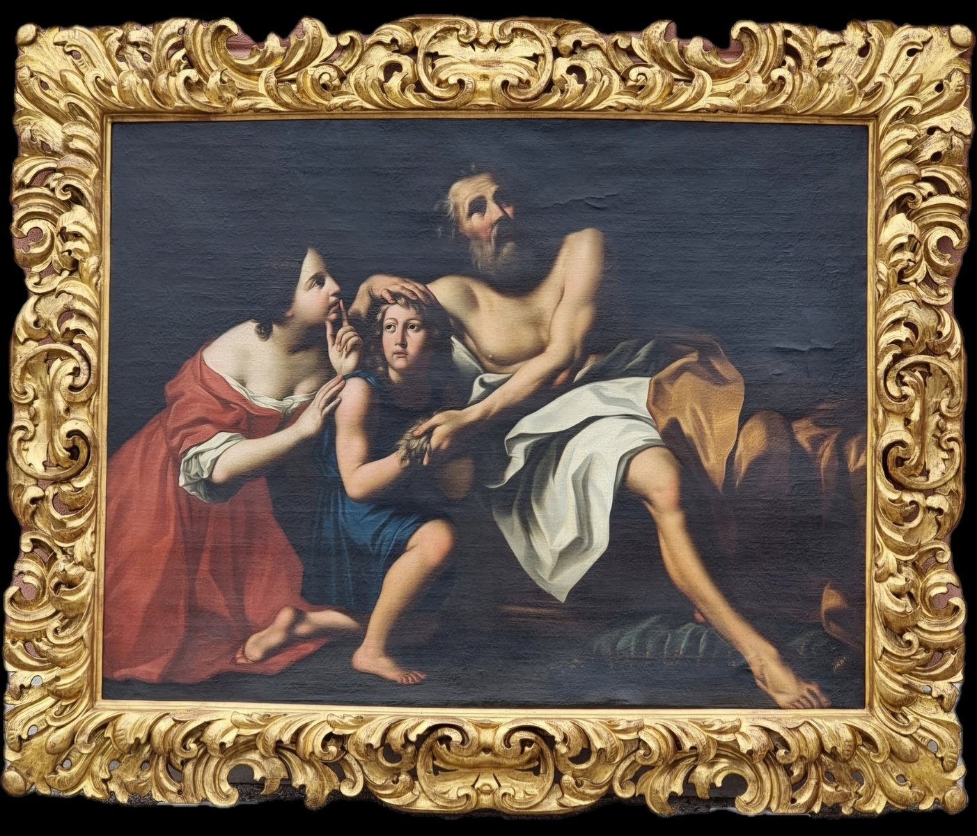 The painting, an eighteenth-century copy of the famous masterpiece by Carlo Cignani (Bologna, 15 May 1628 – Forlì, 6 September 1719), measures 120x155 cm without frame and is embellished with a majestic gilded and carved frame, which brings the overall dimensions to 160x197 cm.