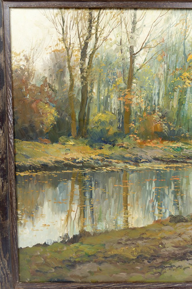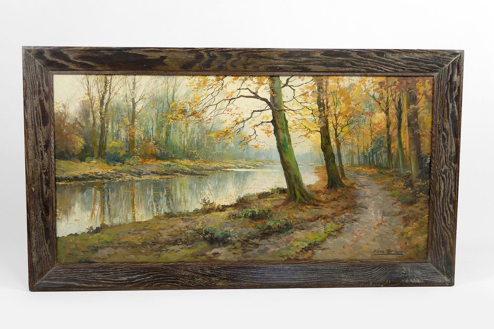 Superbe et grande toile/peinture encadrée représentant un paysage d'automne : nous voyons une promenade/un chemin de halage dans la forêt, bordé d'arbres perdant leurs feuilles, et le long d'un ruisseau. Les arbres de l'autre rive se reflètent dans la rivière/le canal.