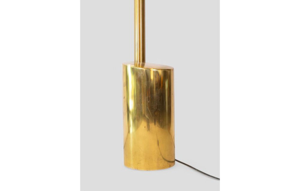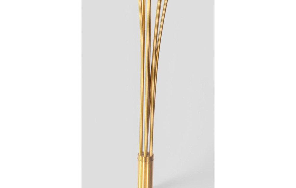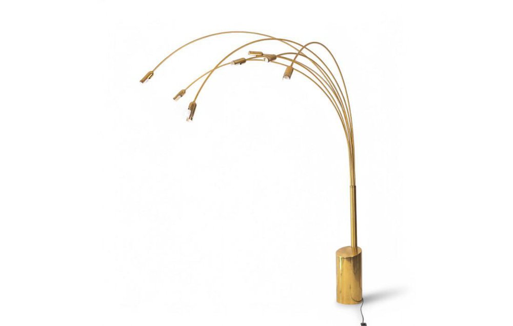 Iconique et saisissant, ce lampadaire arc est une présence sculpturale qui capte l'attention et définit l'espace. Son design, typique des années 1970, se distingue par sa structure en laiton doré et par l'élégant mouvement de sept bras arqués, chacun doté d'une tête réglable, qui se déploient comme une chorégraphie lumineuse à différentes hauteurs. L'effet visuel est celui d'une grande fleur stylisée, dynamique et harmonieuse, capable de diffuser la lumière de manière sophistiquée et enveloppante. La base solide et façonnée assure la stabilité sans compromettre l'esthétique, en conservant un profil épuré et contemporain. La structure dorée entièrement métallique reflète la lumière naturelle et artificielle, créant des reflets chauds et profonds qui enrichissent n'importe quel environnement. Avec ses dimensions impressionnantes - 250 cm de hauteur et 175 cm de largeur - cette lampe s'impose gracieusement dans les salons, les espaces ouverts ou les lieux de travail, devenant instantanément un point de mire. Elle est en parfait état de fonctionnement et conserve tout le charme authentique de son époque, avec des signes naturels d'âge qui racontent son histoire et rehaussent sa valeur décorative.