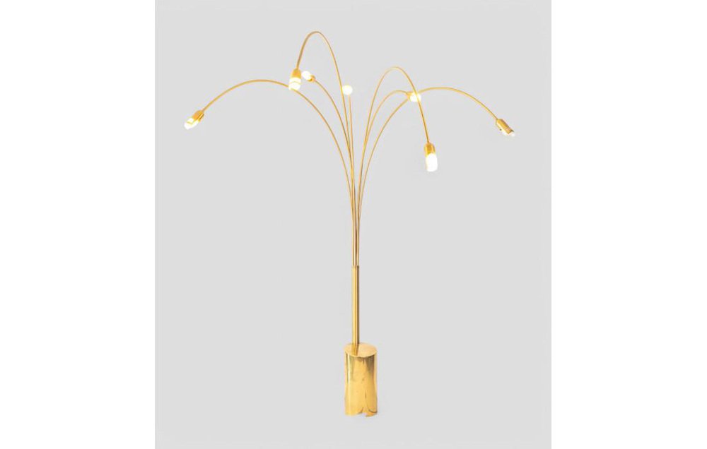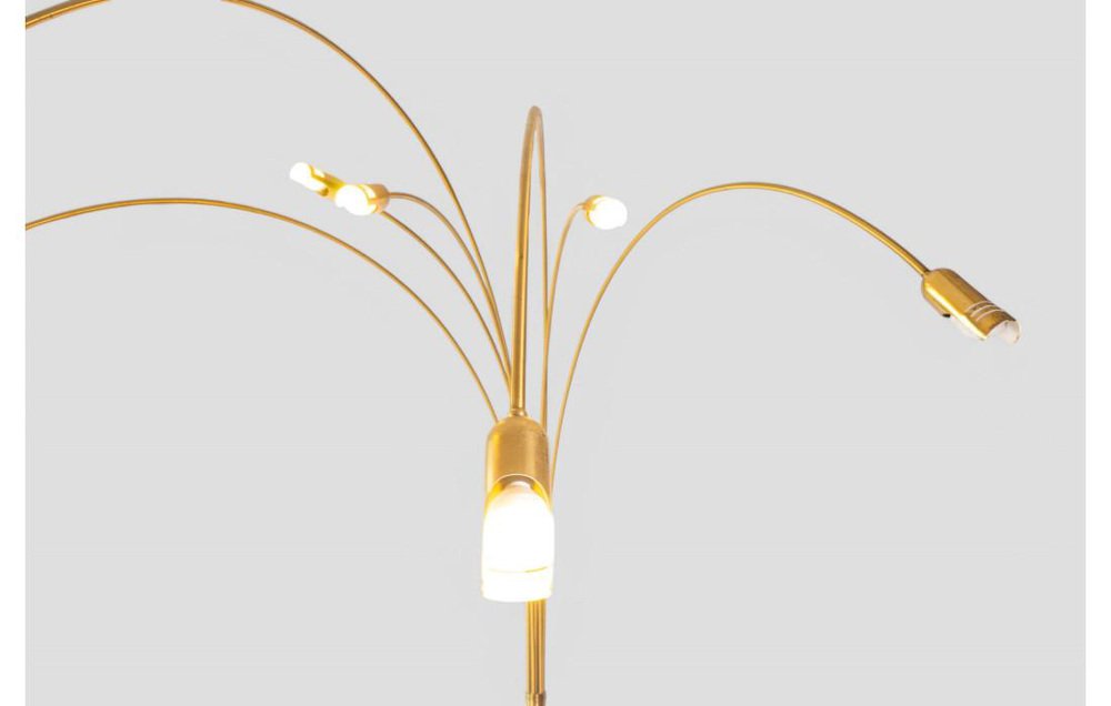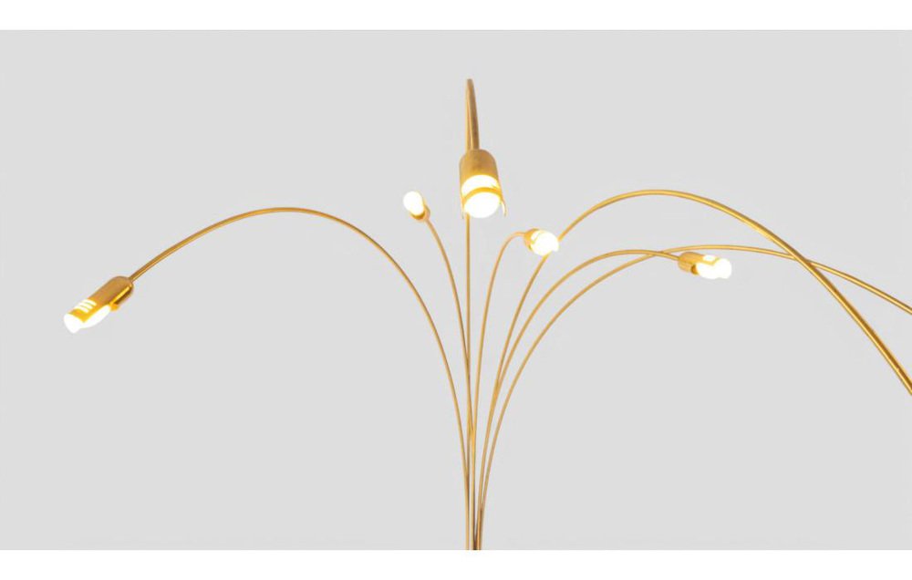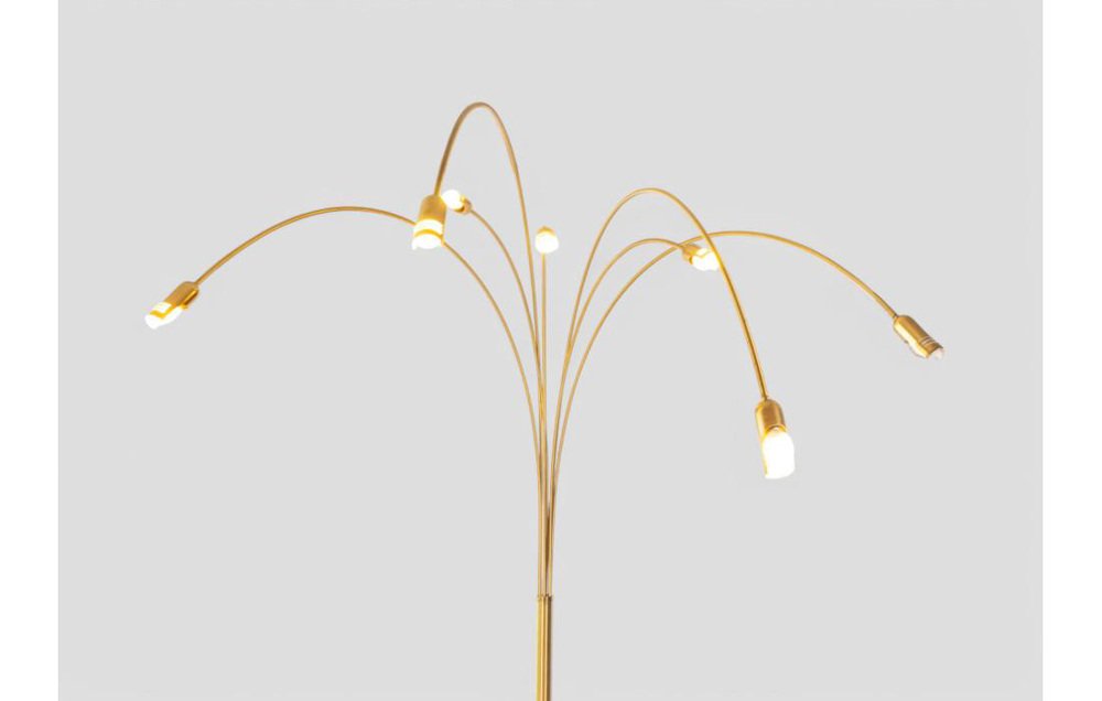 Iconic and striking, this arc floor lamp is a sculptural presence that captures attention and defines the space. Its design, typical of the 1970s, stands out for its golden brass structure and the elegant sweep of seven arched arms, each with an adjustable head, unfolding like a luminous choreography at varying heights. The visual effect is that of a large stylized flower—dynamic and harmonious—able to diffuse light in a sophisticated and enveloping way. The shaped, solid base ensures stability without compromising aesthetics, keeping a clean and contemporary profile. The all-metal golden structure reflects both natural and artificial light, creating warm, deep reflections that enrich any setting. with its impressive dimensions—250 cm in height and 175 cm in width—this lamp makes a graceful statement in living rooms, open spaces, or contract settings, becoming an instant focal point. It is in perfect working condition and retains all the authentic charm of its era, with natural signs of age that tell its story and enhance its decorative value.