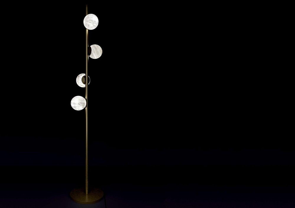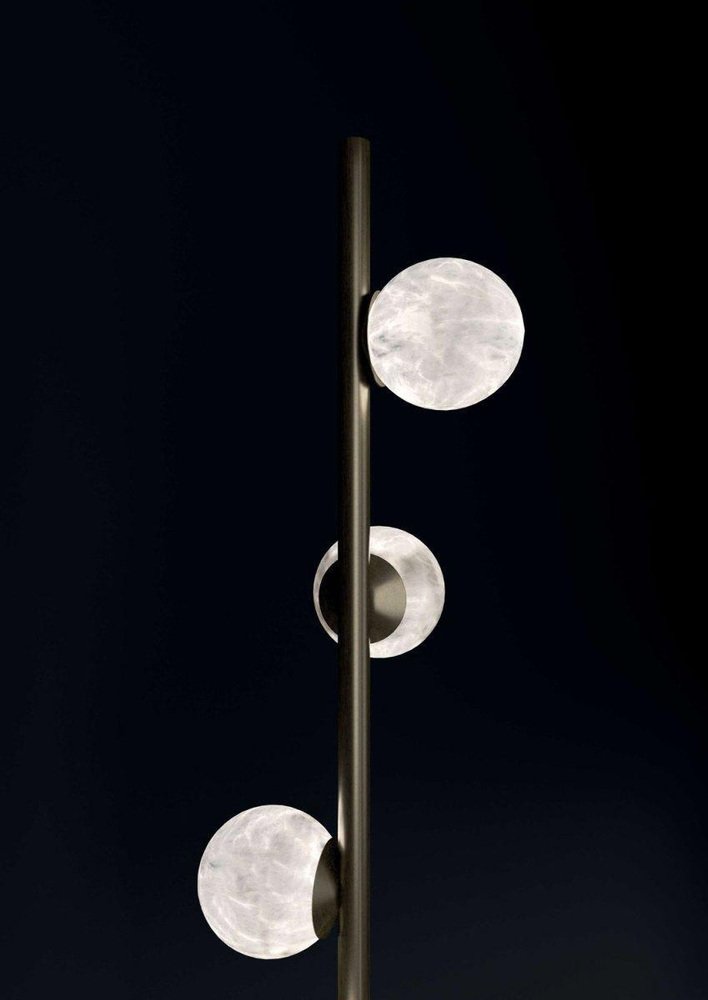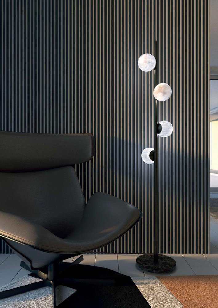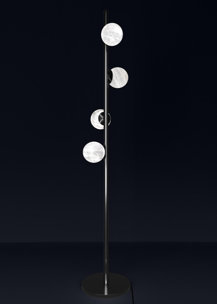 Ofione Shiny Black Metal Floor Lamp by Alabastro Italiano Dimensions: D 50 x W 50 x H 170 cm. Materials: White alabaster and metal. All our lamps can be wired according to each country. If sold to the USA it will be wired for the USA for instance. Ofione was the first king of the Titans and the heavens, his figure is nevertheless shrouded in mystery and little is known of his history. His grandeur was always associated with that of his wife Eurinome, and his life was characterized by this indissoluble bond. Likewise, this series is made up of horizontal and vertical lines that gently intertwine with precious alabaster spheres. After years of experience in the family business, which specializes in design and lighting, Riccardo and Alberto Ongarato found the brand Alabastro Italiano. Each project is conceived and designed to give a strong sign of recognizability and uniqueness. The use of precious materials such as alabaster, brass, leather and blown glass, worked by the skilful hands of our craftsmen, are combined to create “timeless” objects. from the depths of the earth to the light of the sun.