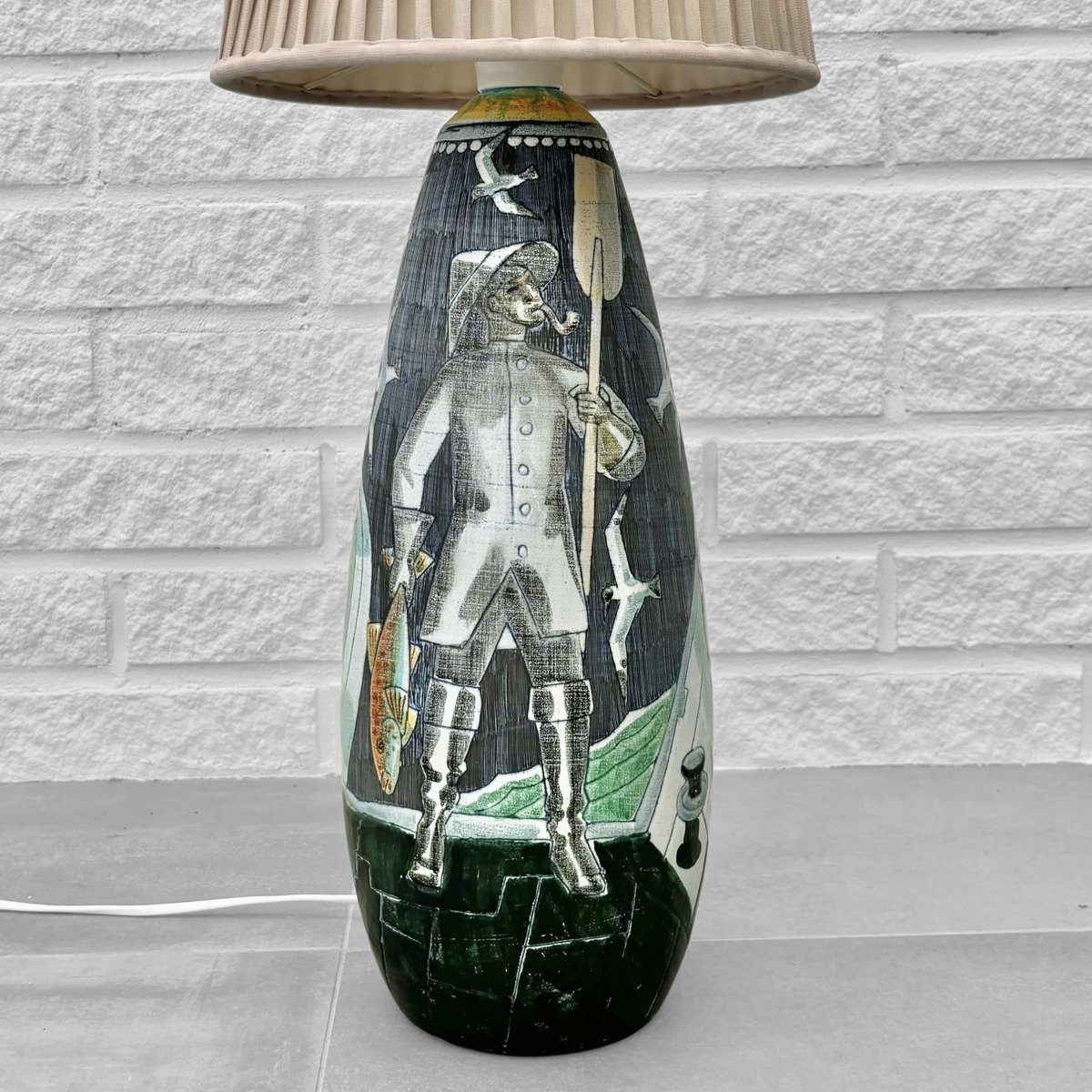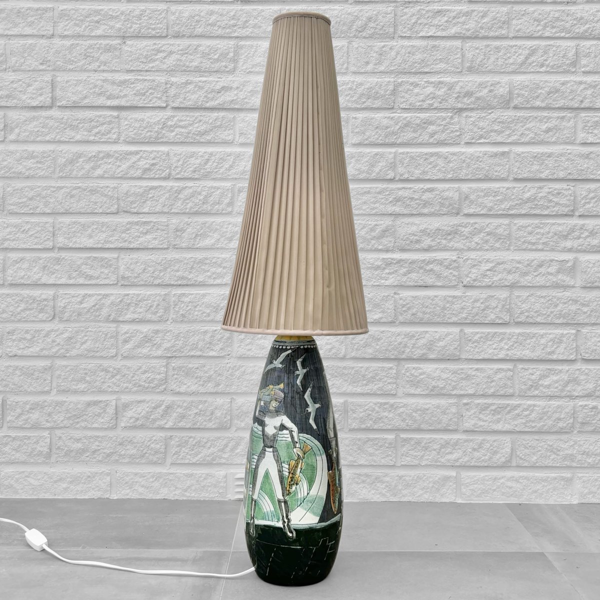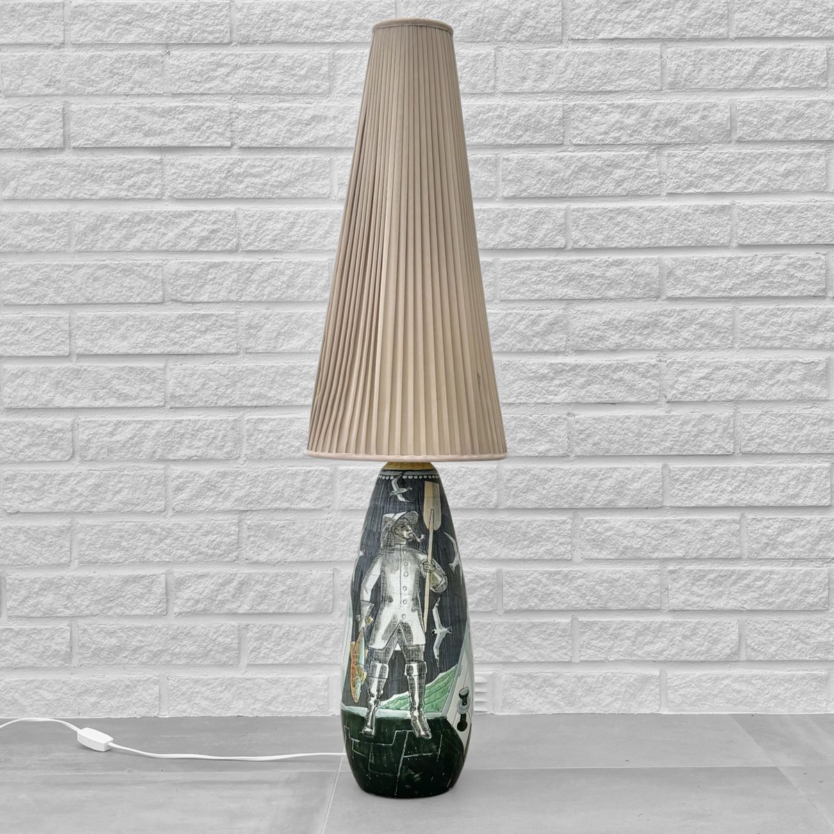 A large and impressive ceramic floor lamp crafted by the Polish-Swedish artist Marian Zawadzki for Tilgmans Keramik in Gothenburg, Sweden. The ceramic base is decorated with a polychrome scene depicting fishermen with their catch. It is signed and dated 1961 and stamped with the manufacturer’s hallmark underneath. The lamp retains its original cone-shaped shade, covered in beige pleated textile. Total height including shade 100 cm, height foot 50 cm, diameter shade 27 cm. The Swedish ceramics studio Tilgmans was founded in Gothenburg in the late 1940s by Finnish-born ceramicist Paul Harald Tilgmann. After a few years of mainly producing animal figurines, the Polish-born artist Antoni Marian Zawadzki was hired to expand the range of products. Zawadzki soon started producing lamps, vases, and even tabletops, primarily using the sgraffito technique. He stayed with the company until 1970 when he left to start his own studio. Paul Harald Tilgmann died in 1974, and Antoni Marian Zawadzki passed away in 1978 at the age of 66.