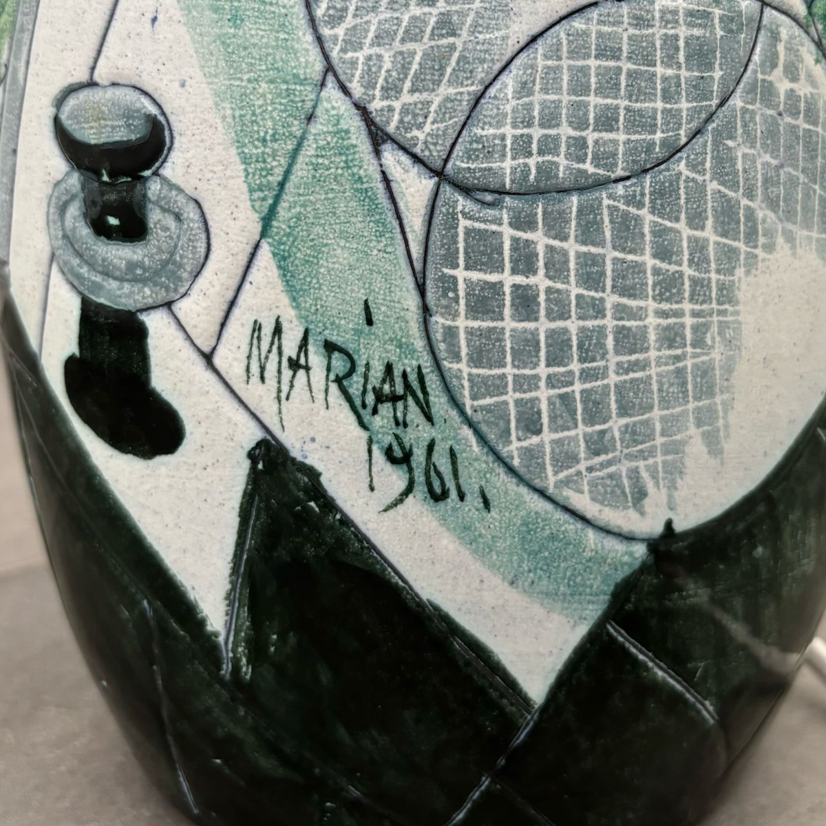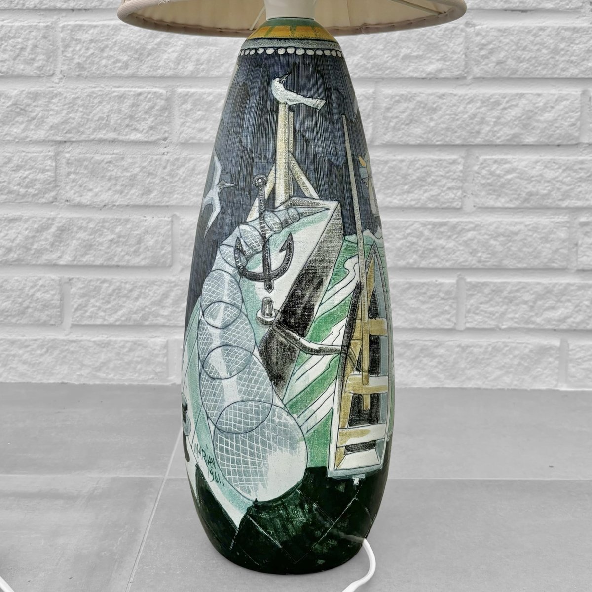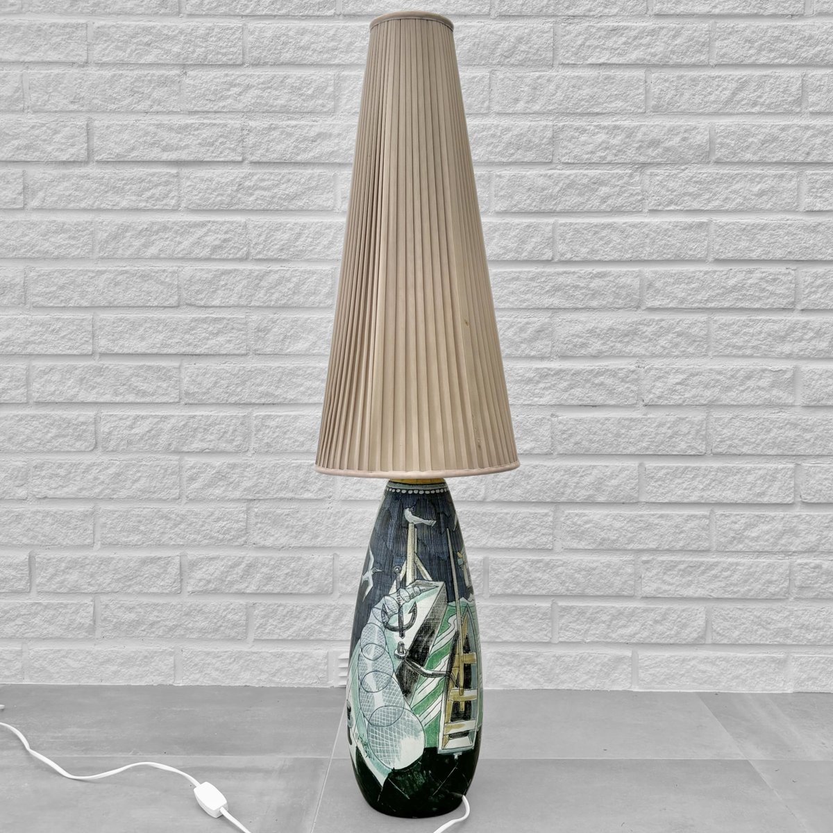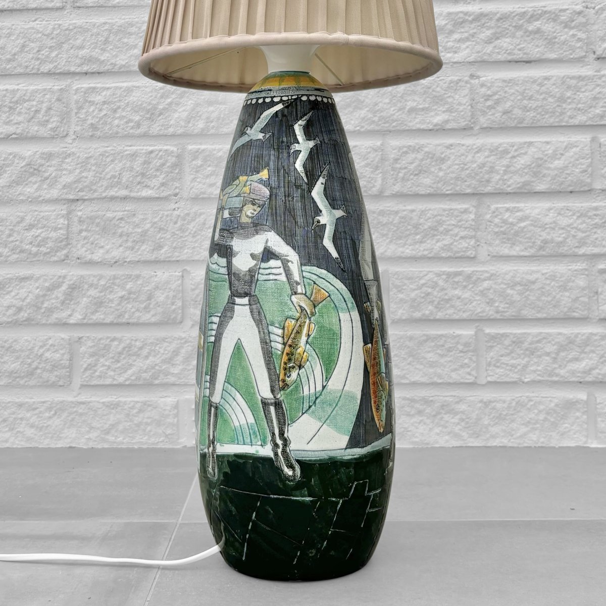 A large and impressive ceramic floor lamp crafted by the Polish-Swedish artist Marian Zawadzki for Tilgmans Keramik in Gothenburg, Sweden. The ceramic base is decorated with a polychrome scene depicting fishermen with their catch. It is signed and dated 1961 and stamped with the manufacturer’s hallmark underneath. The lamp retains its original cone-shaped shade, covered in beige pleated textile. Total height including shade 100 cm, height foot 50 cm, diameter shade 27 cm. The Swedish ceramics studio Tilgmans was founded in Gothenburg in the late 1940s by Finnish-born ceramicist Paul Harald Tilgmann. After a few years of mainly producing animal figurines, the Polish-born artist Antoni Marian Zawadzki was hired to expand the range of products. Zawadzki soon started producing lamps, vases, and even tabletops, primarily using the sgraffito technique. He stayed with the company until 1970 when he left to start his own studio. Paul Harald Tilgmann died in 1974, and Antoni Marian Zawadzki passed away in 1978 at the age of 66.