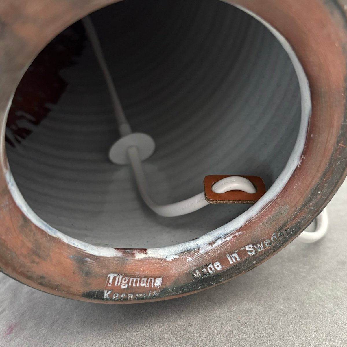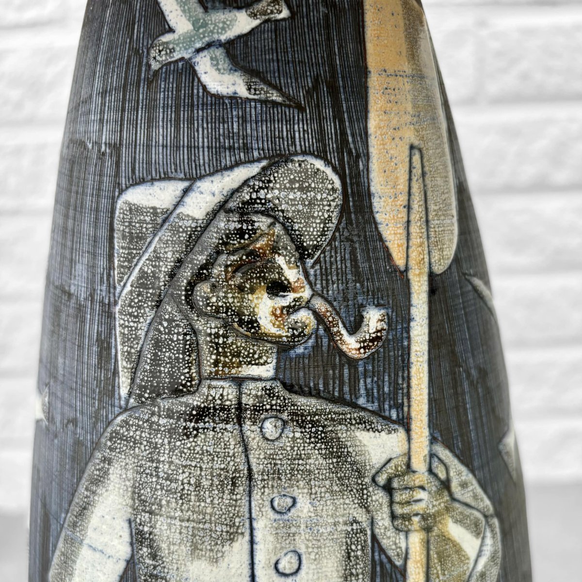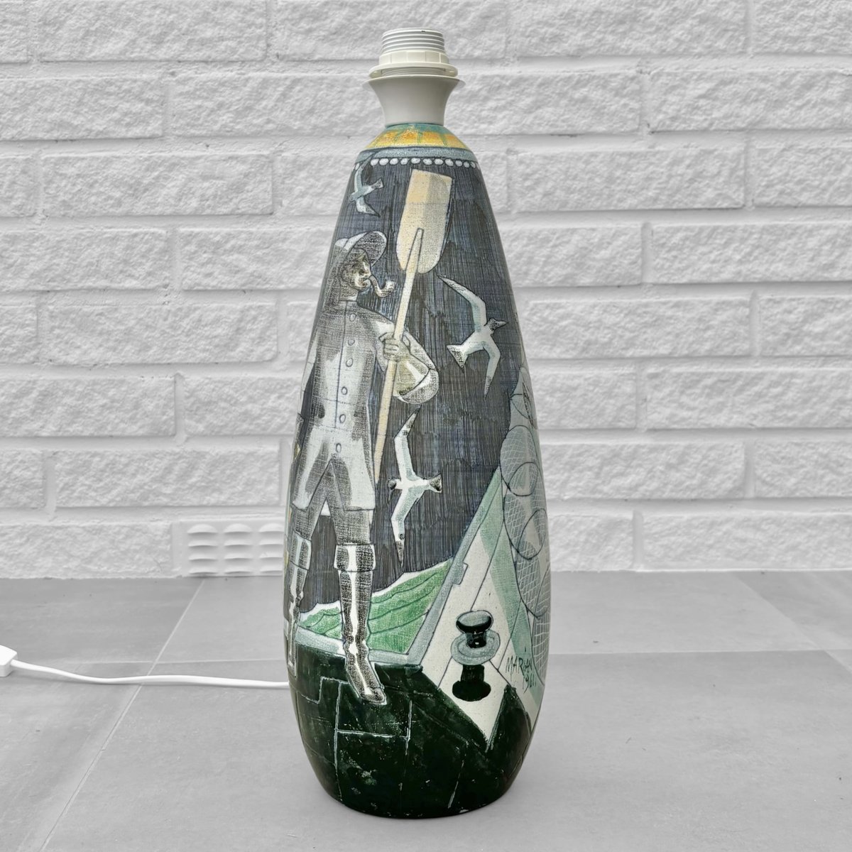 Un grand et impressionnant lampadaire en céramique créé par l'artiste polono-suédois Marian Zawadzki pour Tilgmans Keramik à Göteborg, en Suède. La base en céramique est décorée d'une scène polychrome représentant des pêcheurs avec leur prise. La lampe est signée et datée de 1961 et porte le poinçon du fabricant. La lampe a conservé son abat-jour conique d'origine, recouvert d'un textile plissé beige. Hauteur totale, abat-jour compris, 100 cm, hauteur du pied 50 cm, diamètre de l'abat-jour 27 cm. Le studio de céramique suédois Tilgmans a été fondé à Göteborg à la fin des années 1940 par le céramiste d'origine finlandaise Paul Harald Tilgmann. Après quelques années de production de figurines animales, l'artiste d'origine polonaise Antoni Marian Zawadzki a été engagé pour élargir la gamme de produits. Zawadzki commence bientôt à produire des lampes, des vases et même des plateaux de table, principalement en utilisant la technique du sgraffite. Il reste dans l'entreprise jusqu'en 1970, date à laquelle il quitte l'entreprise pour créer son propre studio. Paul Harald Tilgmann décède en 1974 et Antoni Marian Zawadzki s'éteint en 1978 à l'âge de 66 ans.