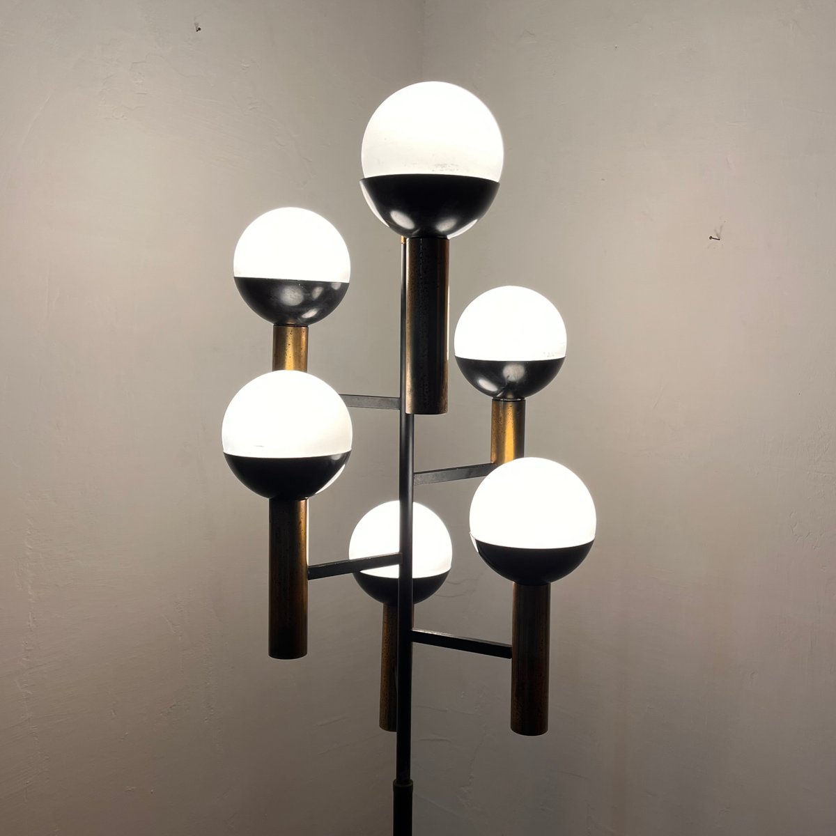 Ce lampadaire extraordinaire, fabriqué en Italie dans les années 1950 et attribué à Stilnovo, une célèbre marque de design italienne d'après-guerre, est d'une grande élégance. Cette pièce se caractérise par un cadre élancé en métal laqué noir, des détails en laiton poli et des diffuseurs sphériques en verre opale, disposés sur plusieurs niveaux dans une composition sculpturale et équilibrée.