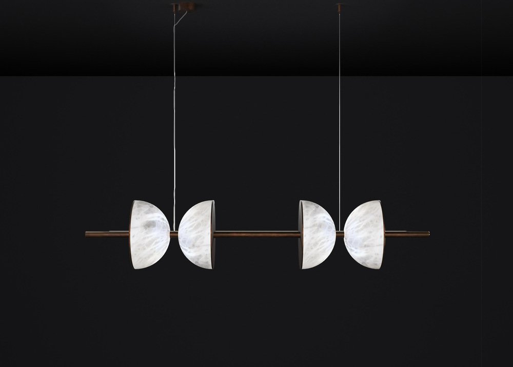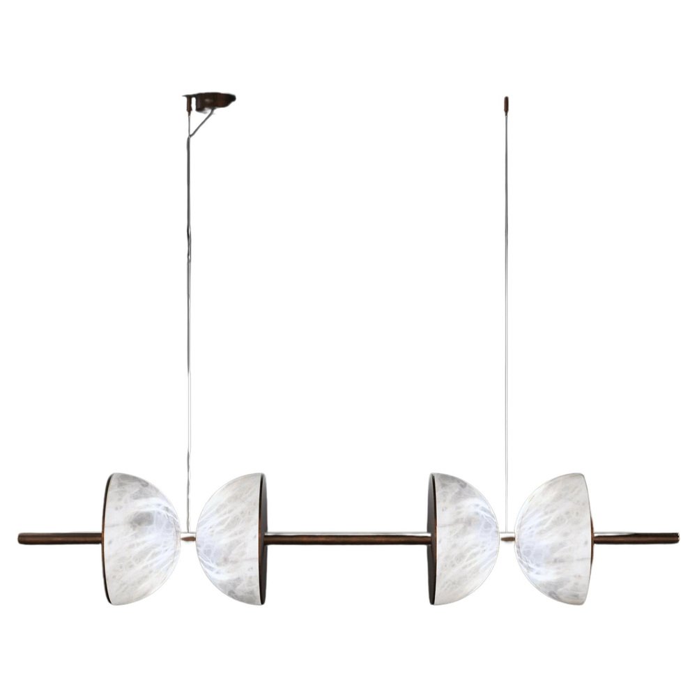 Ermes Ruggine Of Florence And Alabaster Pendant Light 2 by Alabastro Italiano Dimensions: D 30 x W 150 x H 300 cm. Materials: White alabaster and Ruggine of Florence metal. Available in different finishes: Shiny Silver, Bronze, Brushed Brass, Ruggine of Florence, Brushed Burnished, Shiny Gold, Brushed Black, Freedom Green, Shiny Black and Copper. Please contact us. All our lamps can be wired according to each country. If sold to the USA it will be wired for the USA for instance. Ermes, known as the messenger of the gods, is the deity this line is inspired by. A tubular element supports and connects four alabaster half spheres, through this play of symmetries and correspondences we want to reproduce the idea of communication, a moment of meeting between division and union; it is also no coincidence that Hermes is the god of travel and borders. After years of experience in the family business, which specializes in design and lighting, Riccardo and Alberto Ongarato found the brand Alabastro Italiano. Each project is conceived and designed to give a strong sign of recognizability and uniqueness. The use of precious materials such as alabaster, brass, leather and blown glass, worked by the skilful hands of our craftsmen, are combined to create “timeless” objects. from the depths of the earth to the light of the sun. ALABASTRO ITALIANO care about these extremes and transcends them in a creative dynamic that emphasizes simplicity and clean-cut lines. The company has created an entirely new project MADE IN ITALY, revolutionizing the previously existing collections into eternal and evergreen lighting elements. By designing clean-cut and original lines, built-in with the latest technology and continuously innovating, ALABASTRO ITALIANO has never lost sight of its goal: perfection. The result of this work is an extraordinary collection of alabaster lightings. Alabaster needs human hands to come to life. The charm of these stone objects comes from their uniqueness, from the fact that they come from the hand of those who has left a mark and a memory with their work, each grain makes each piece unique. Alabaster needs human hands to come to life. The charm of these stone objects comes from their uniqueness, from the fact that they come from the hand of those who has left a mark and a memory with their work, each grain makes each piece unique. Alabaster is a Material that leaves little traces of magic all around it. It is difficult to identify the exact point where the Material ends and its reflection begins. It is impossible to understand how far the light sinks in its soft transparency. It changes according to the positions in which it is placed, depending on the point of view. Alabaster is a compact and rare stone that lays down very precise laws requires a familiarity that only Italian craftsmen possess. Alabastro Italiano collaborates with each client to create a unique project. Starting from the advice for better architectural lighting, it brings its know-how, materials, design and creative inspiration to interior architects and interior designers.