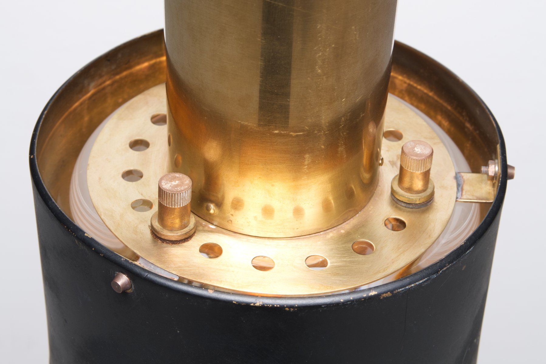 By the 1950s, Lyfa had built an international reputation for original, high-quality, modernist lamps. In the postwar era, the company collaborated with esteemed architects and designers to produce minimalist, sculptural, "Space Age" table lamps, wall lights, and pendants, especially in colored glass, plastic, and enameled aluminum.