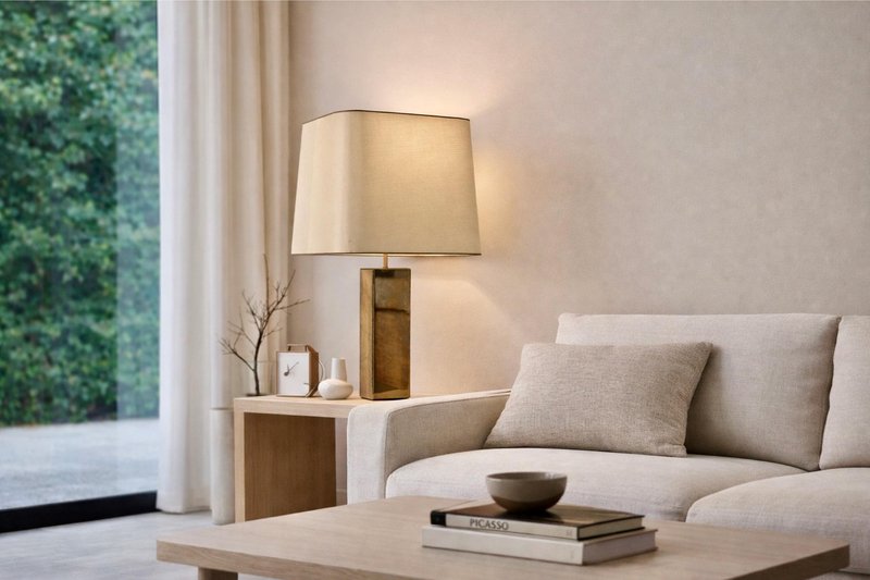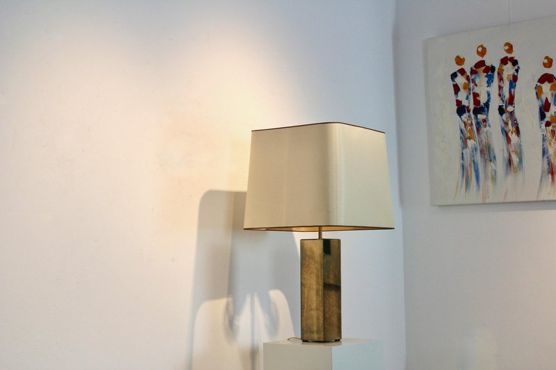 This refined Italian mid-century modern table lamp embodies the era’s mastery of proportion, material, and understated elegance. Crafted in Italy during the mid-20th century, the lamp features a striking architectural base with a clean rectangular form, clad in richly patinated brass. The surface has developed a warm, nuanced finish over time, lending depth and character while preserving its crisp modernist lines. The sculptural base is paired with a tailored, gently tapered fabric shade that softens the geometry and casts a warm, atmospheric light. This balance between strong structure and subtle refinement is characteristic of Italian lighting design of the period, where craftsmanship and modern aesthetics were seamlessly united. The height of the shade is adjustable between 62-76 cm. Elegant yet restrained, the lamp works beautifully as a statement piece on a console, desk, or side table. Its timeless design allows it to complement both mid-century interiors and contemporary spaces seeking a touch of authentic vintage sophistication. A compelling example of Italian modern lighting, combining functional illumination with sculptural presence.