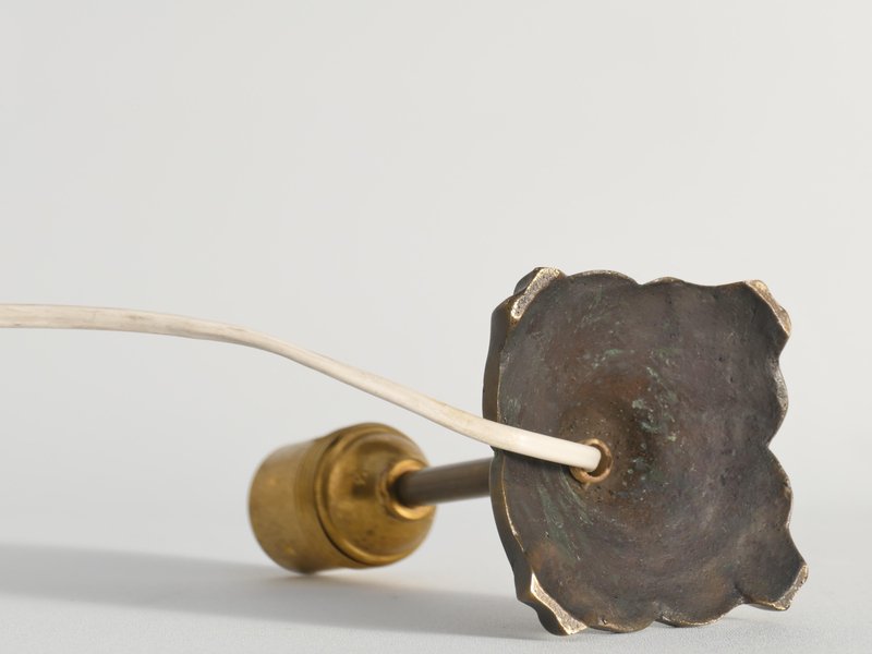 Cette charmante petite lampe de table incarne l'élégance du design Art nouveau. Fabriquée en laiton massif, la lampe présente une base moulée de manière complexe avec des motifs organiques et fluides caractéristiques de l'époque. La finition en laiton antique a développé une patine riche et usée par le temps, ce qui renforce son attrait vintage. La tige est simple et élancée, complétant la base ornée. Parfaite comme pièce d'accent sur une table de nuit, un bureau ou une table d'appoint, cette lampe exsude une sophistication discrète et un style intemporel. Dimensions de la lampe : Hauteur : 23 cm (9 in) Diamètre de la base : 10 cm (4 in) Condition : Excellent état vintage avec une légère usure due à l'âge et à l'utilisation. Patine présente sur le laiton. Prise électrique murale suédoise. Peut être remplacée par une prise murale américaine, européenne ou britannique. L'abat-jour n'est pas inclus.