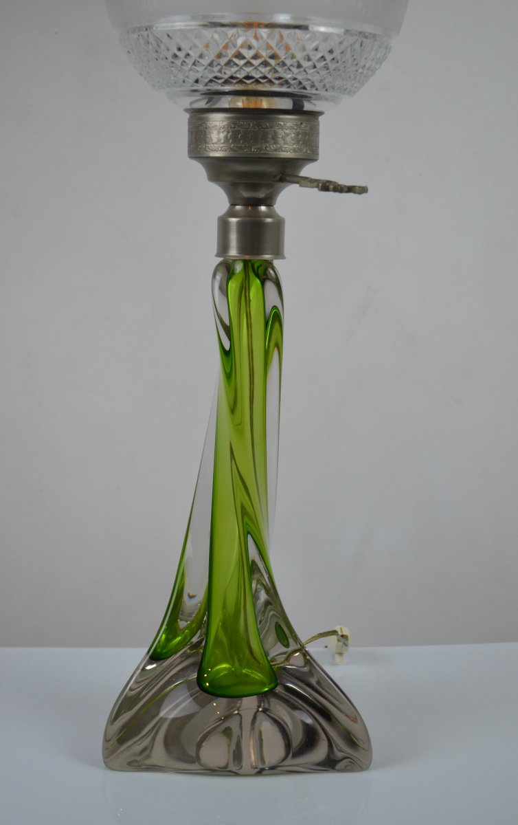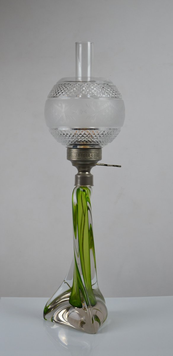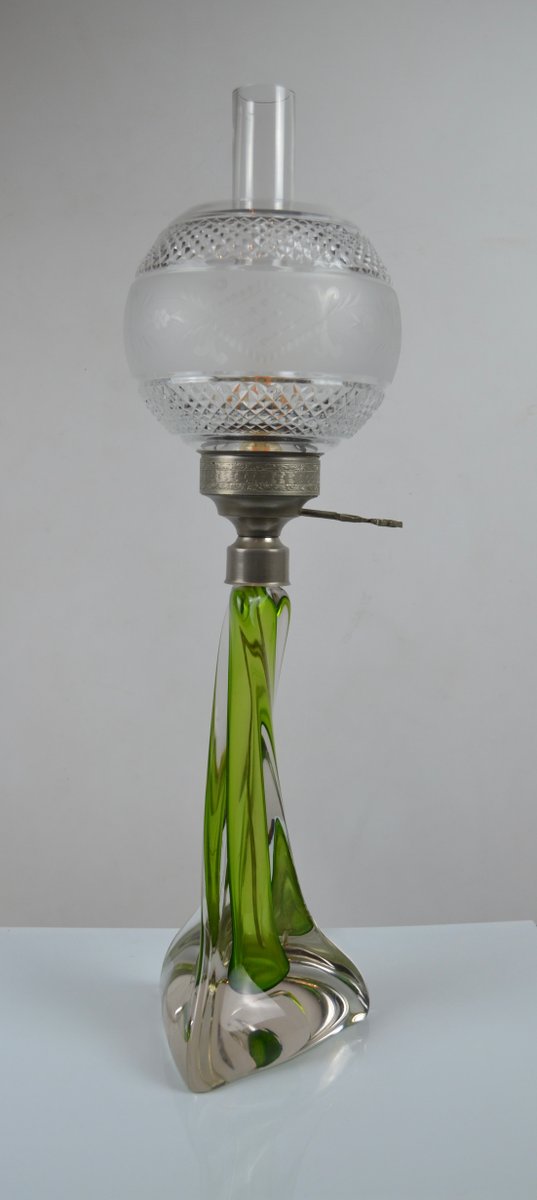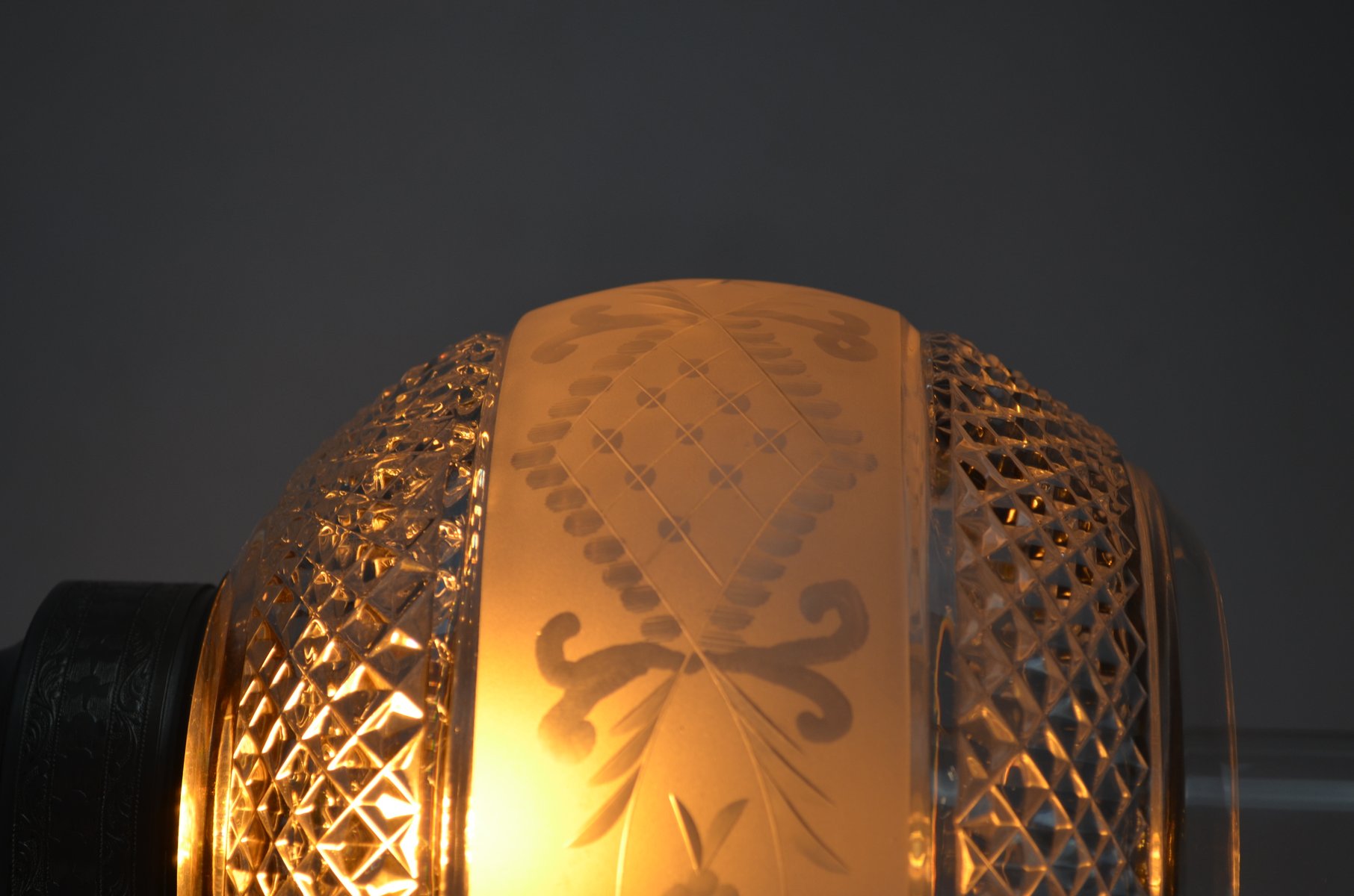 La partie supérieure présente un abat-jour en cristal taillé et dépoli avec une bande florale finement gravée. Conçue dans l'esprit esthétique des lampes à huile traditionnelles, cette pièce était à l'origine une lampe électrique.