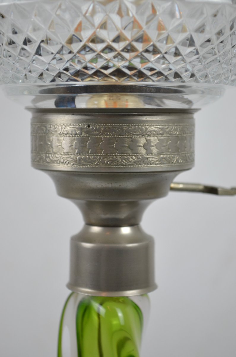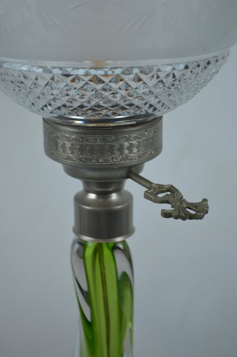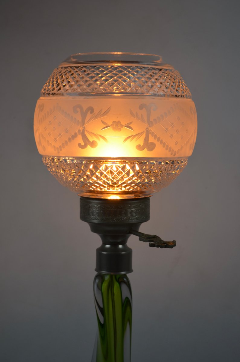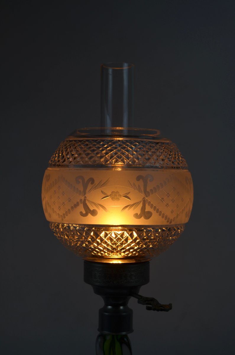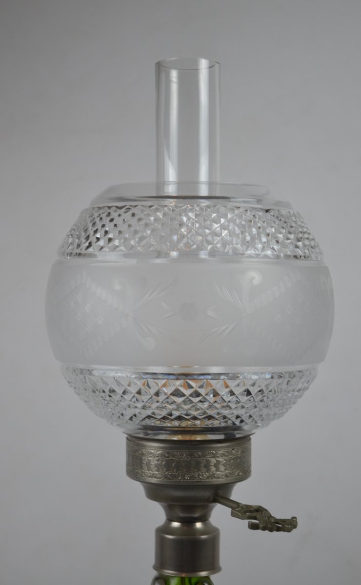 The upper section features a cut and frosted crystal shade with a finely engraved floral band. Designed in the aesthetic spirit of traditional oil lamps, this piece was originally made as an electric lamp.