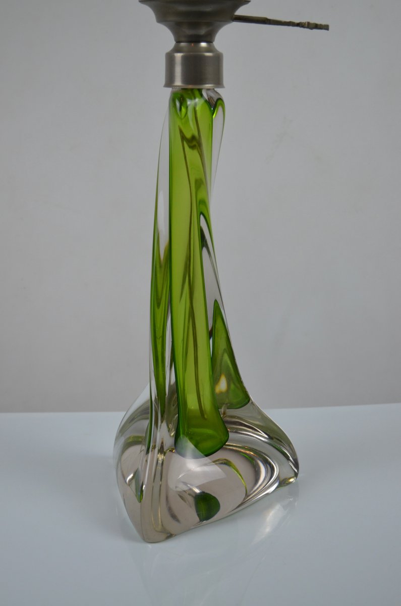 La base est en verre soufflé avec un effet Sommerso, avec un cœur vert entouré de verre transparent. Cette technique crée de la profondeur et de la fluidité, soulignées par l'élégante forme torsadée de la tige.