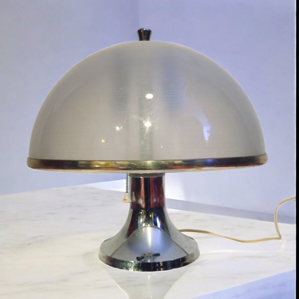 Le design de cette lampe suit la ligne des grands créateurs du Mid-Century Modern, avec une base courbée et un dôme translucide qui fournit un éclairage diffus et enveloppant. Sa combinaison de matériaux et de finitions la rend idéale pour les environnements inspirés par le futurisme des années 1960, le style Pop Art ou les intérieurs authentiques du milieu du siècle.