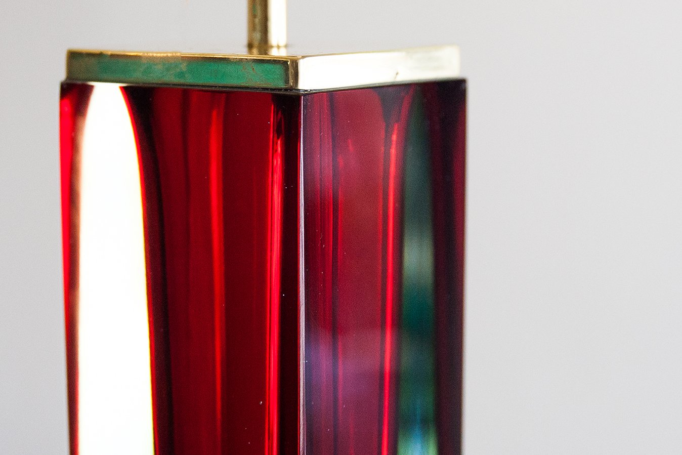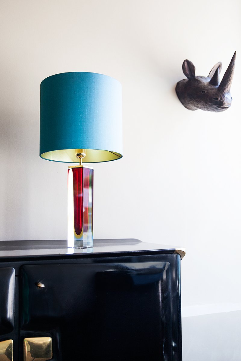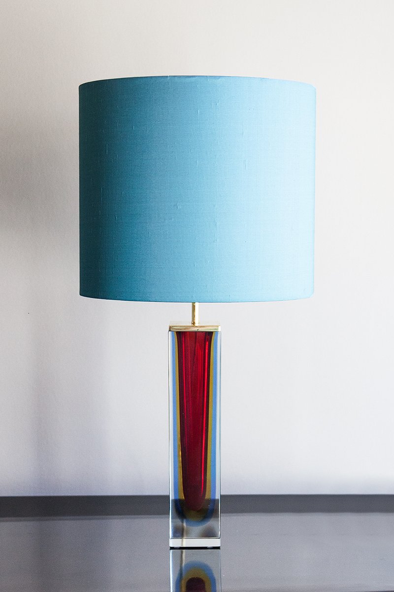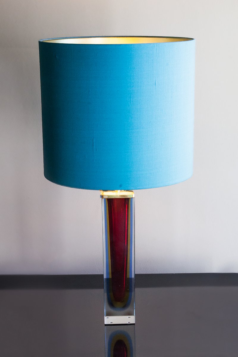 Lampe de table, beau bloc de verre de Murano multicolore (transparent, bleu, rouge, jaune) à facettes, Italie, vers 1965, attr. Prod. Seguso, Murano, support d'ampoule en laiton, nouvel abat-jour en soie turquoise, intérieur or. Hauteur dans l'abat-jour 64 cm, diamètre 32 cm, hauteur de la base 41 cm, longueur 7 cm, 7 cm. Recâblé avec un nouveau cordon lumineux en soie dorée, fiche et interrupteur dorés. Excellent état. Pas d'éclats, pas de fissures à remarquer.
