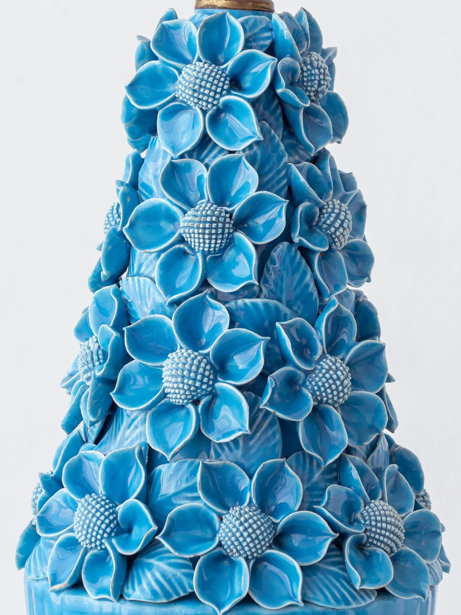 Sculptural mid-century table lamp from Manises, Spain (1960s). A vivid turquoise glazed bouquet of hand-carved ceramic blossoms climbs a cone-shaped form from an urn foot, set on a gilt plinth. Petal rims and textured centers catch the light, so the surface reads as richly layered and dimensional even when the lamp is off—classic Manises character from the 1960s.The new dark-terracotta silk drum shade with Houles trim brings a warm complimentary counterpoint to the cool glaze.