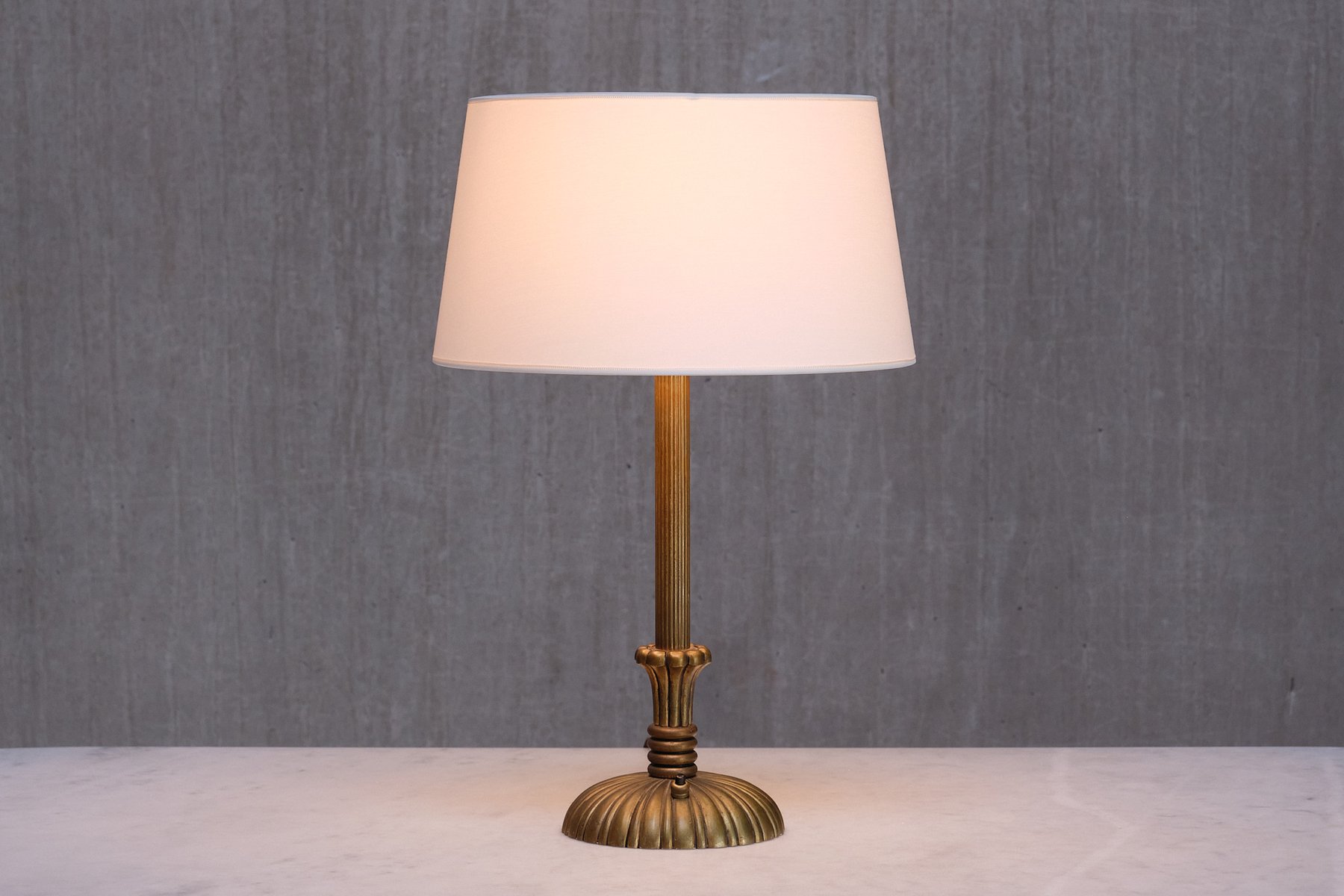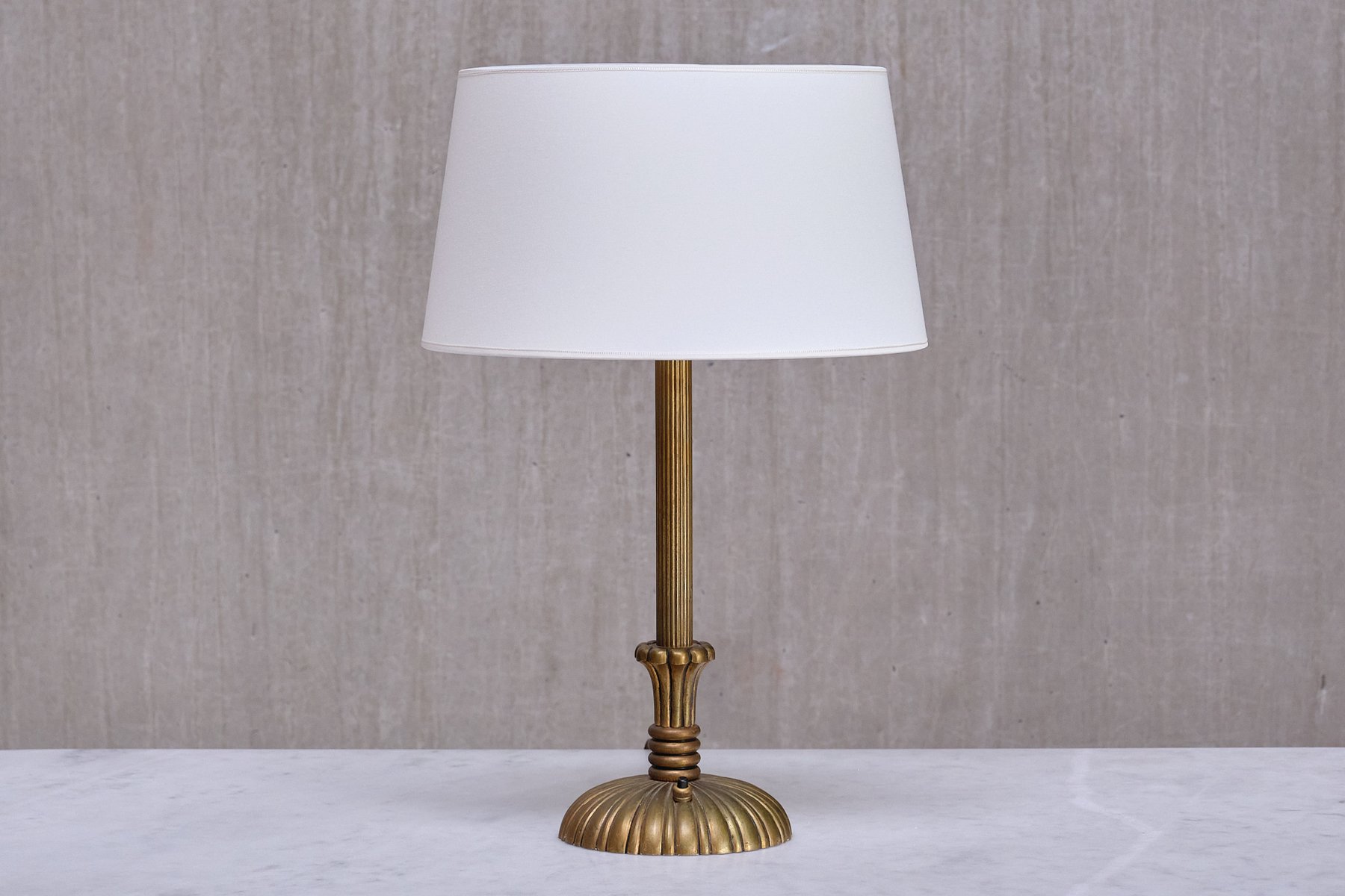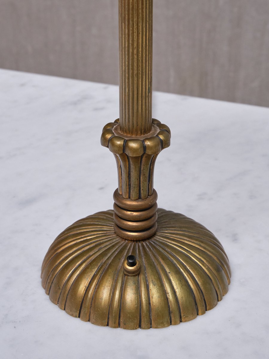 The decorative design is crafted entirely from solid brass, which has developed a beautiful, even patina over time, creating a more matte look. The central column features a finely reeded brass design that leads to a circular base. The base is adorned with fluted brass detailing, forming a sophisticated sunburst pattern that widens gracefully toward the edges. The craftsmanship and techniques used in the brass design reflect the high quality of the material and the expertise of its maker. The drum shaped shade, custom made in a smooth, ivory-colored fabric, is resting on the original brass shade holder.