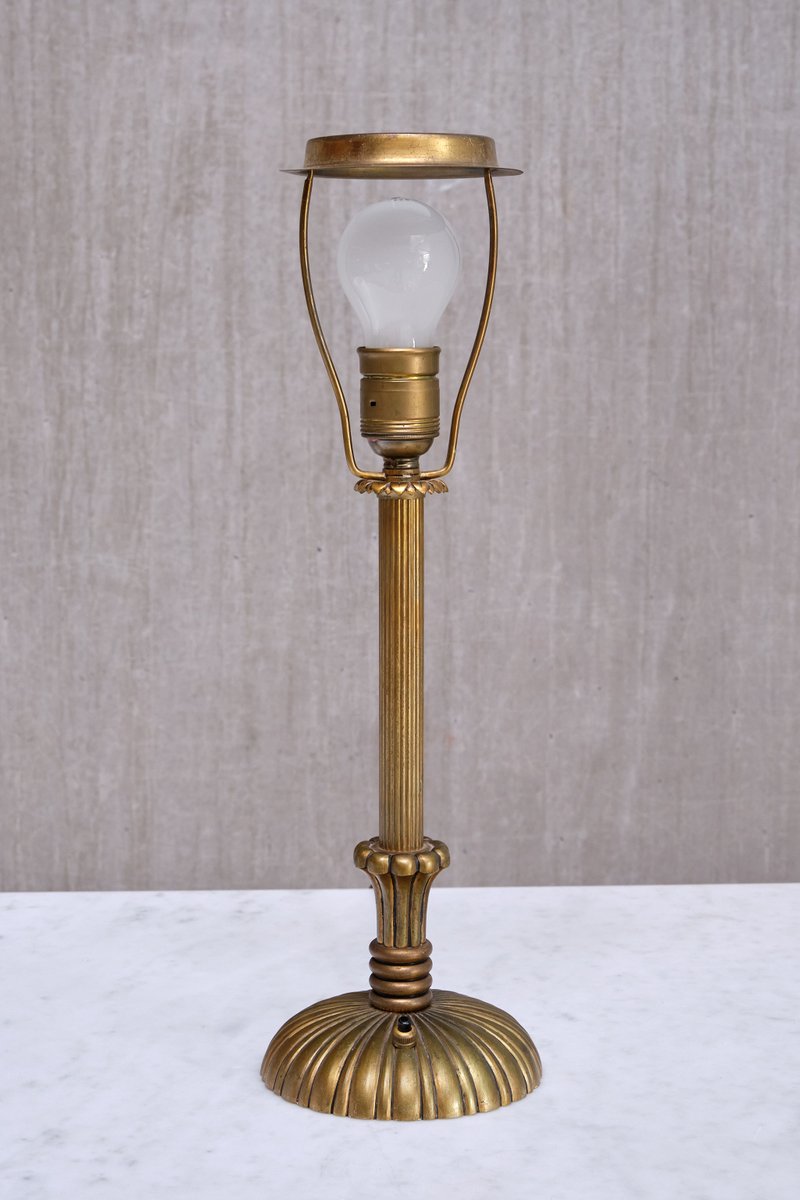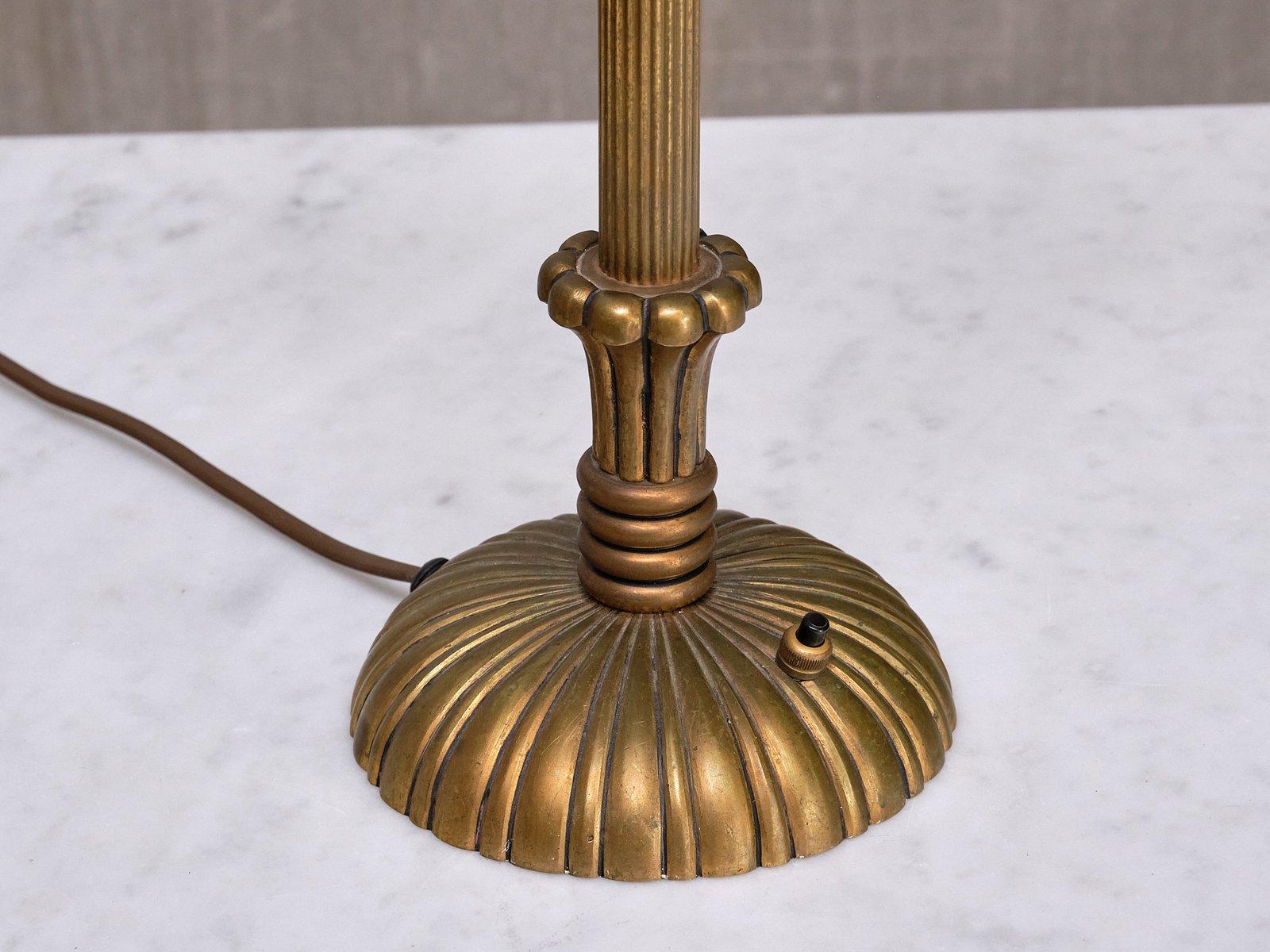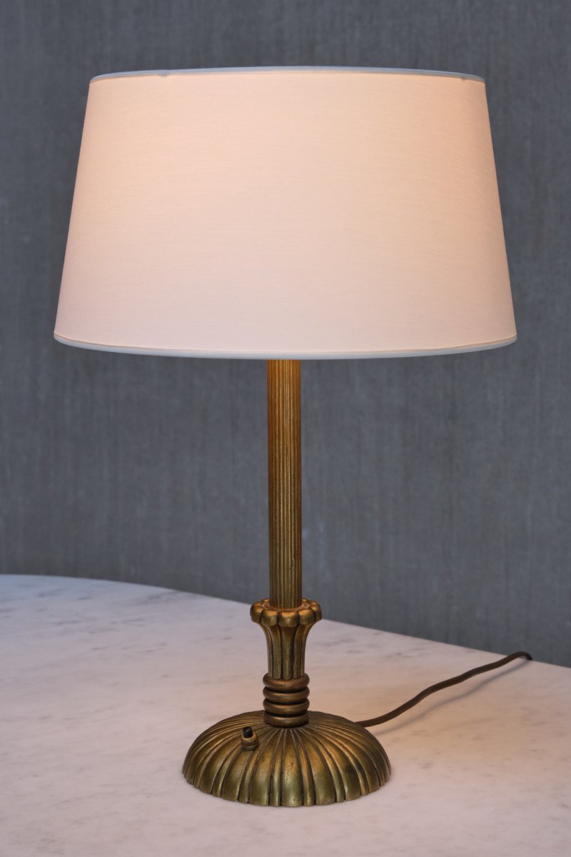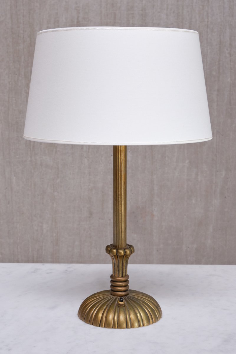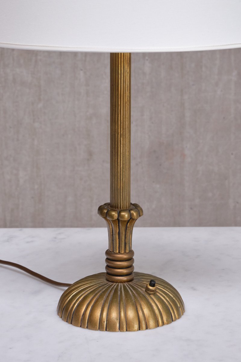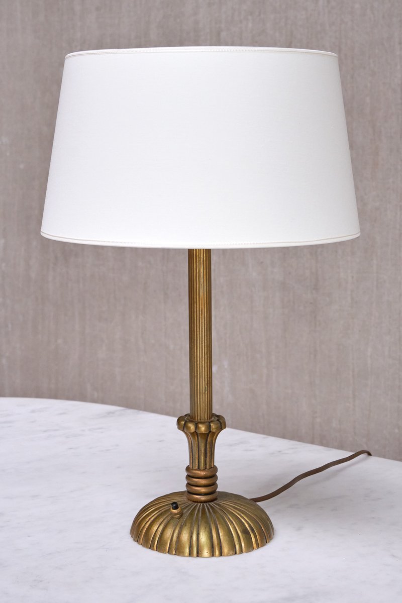 Le design décoratif est entièrement réalisé en laiton massif, qui a développé une belle patine uniforme au fil du temps, créant un aspect plus mat. La colonne centrale est ornée d'un motif en laiton finement cannelé qui mène à une base circulaire. Cette dernière est ornée de cannelures en laiton, formant un motif sophistiqué en forme de soleil qui s'élargit gracieusement vers les bords. Le savoir-faire et les techniques utilisés dans le design en laiton reflètent la haute qualité du matériau et l'expertise de son fabricant. L'abat-jour en forme de tambour, fabriqué sur mesure dans un tissu lisse de couleur ivoire, repose sur le support d'abat-jour en laiton d'origine.