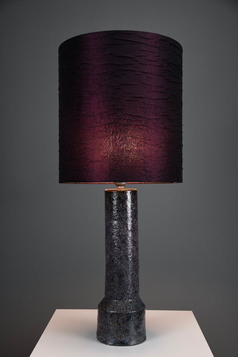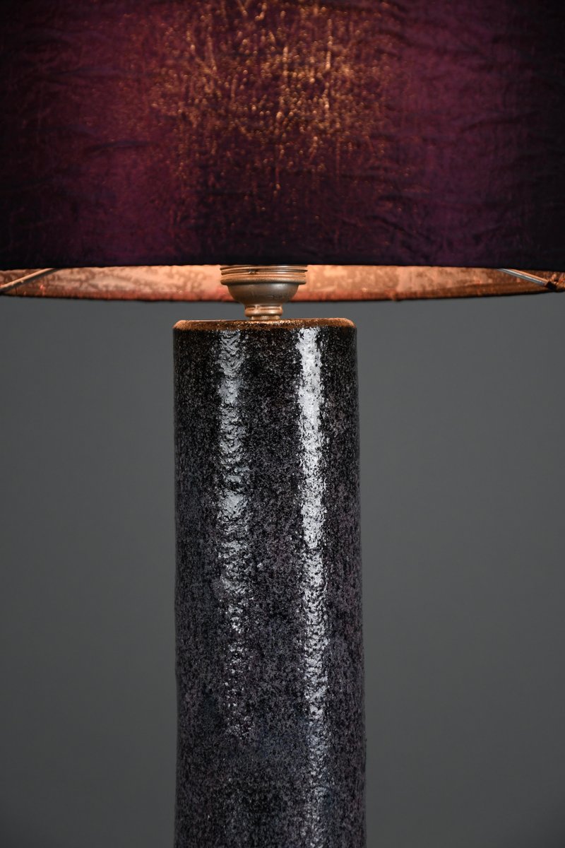 A striking and rare mid-century modern table lamp by renowned Dutch ceramicist Pieter Groeneveldt, featuring a subtly textured, deep purple ceramic base with beautifully nuanced glazing. The cylindrical body is hand-thrown and finished in Groeneveldt’s signature lava-like glaze, which exudes understated elegance and depth. It is paired with a custom-made pleated silk lampshade in a rich aubergine hue, providing a harmonious contrast and a warm, ambient glow when lit.