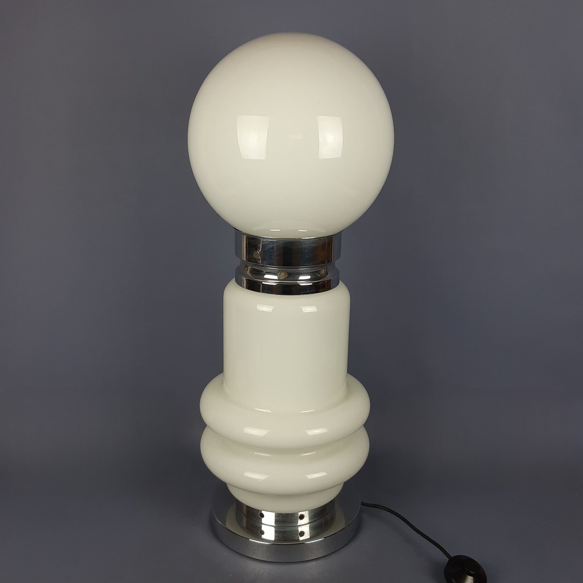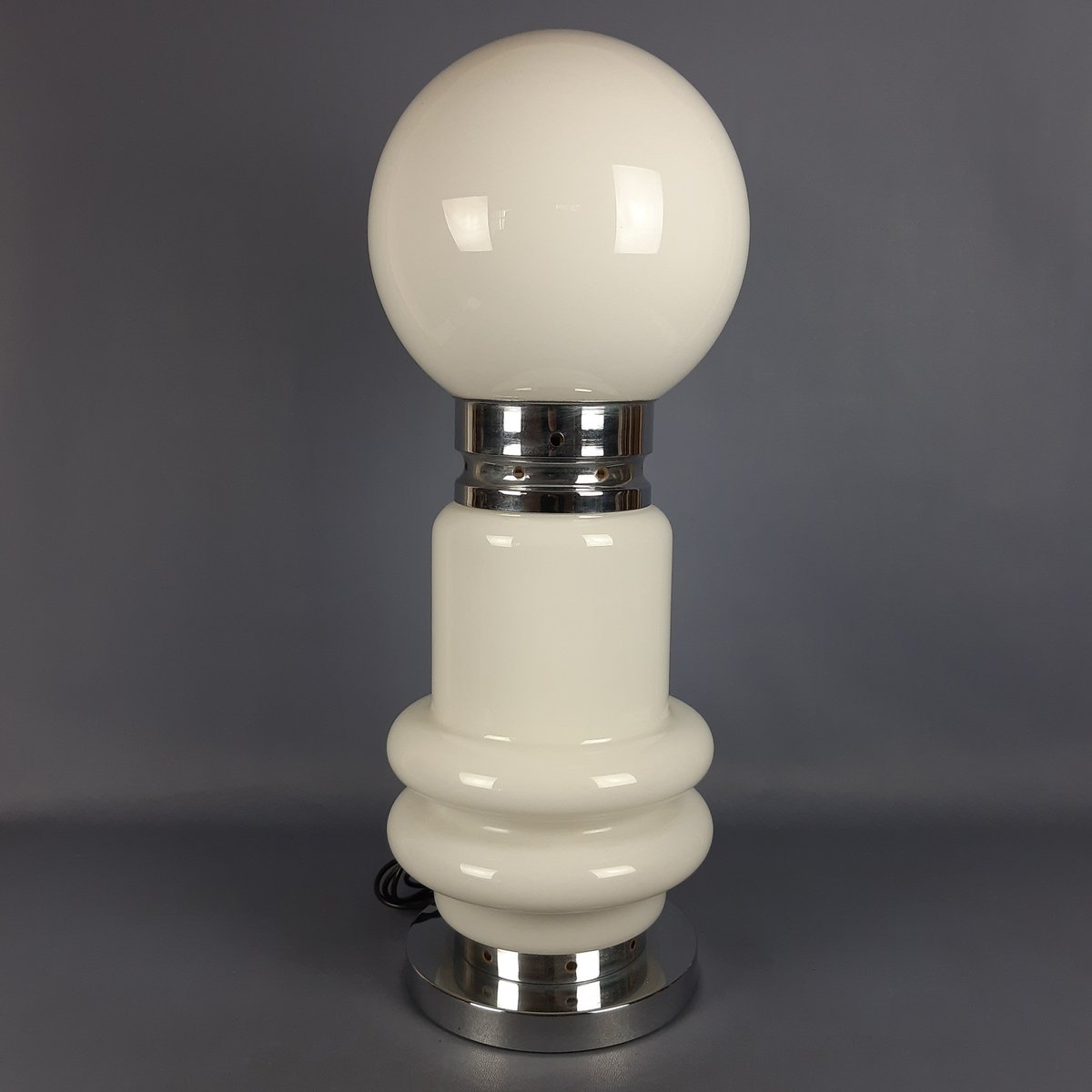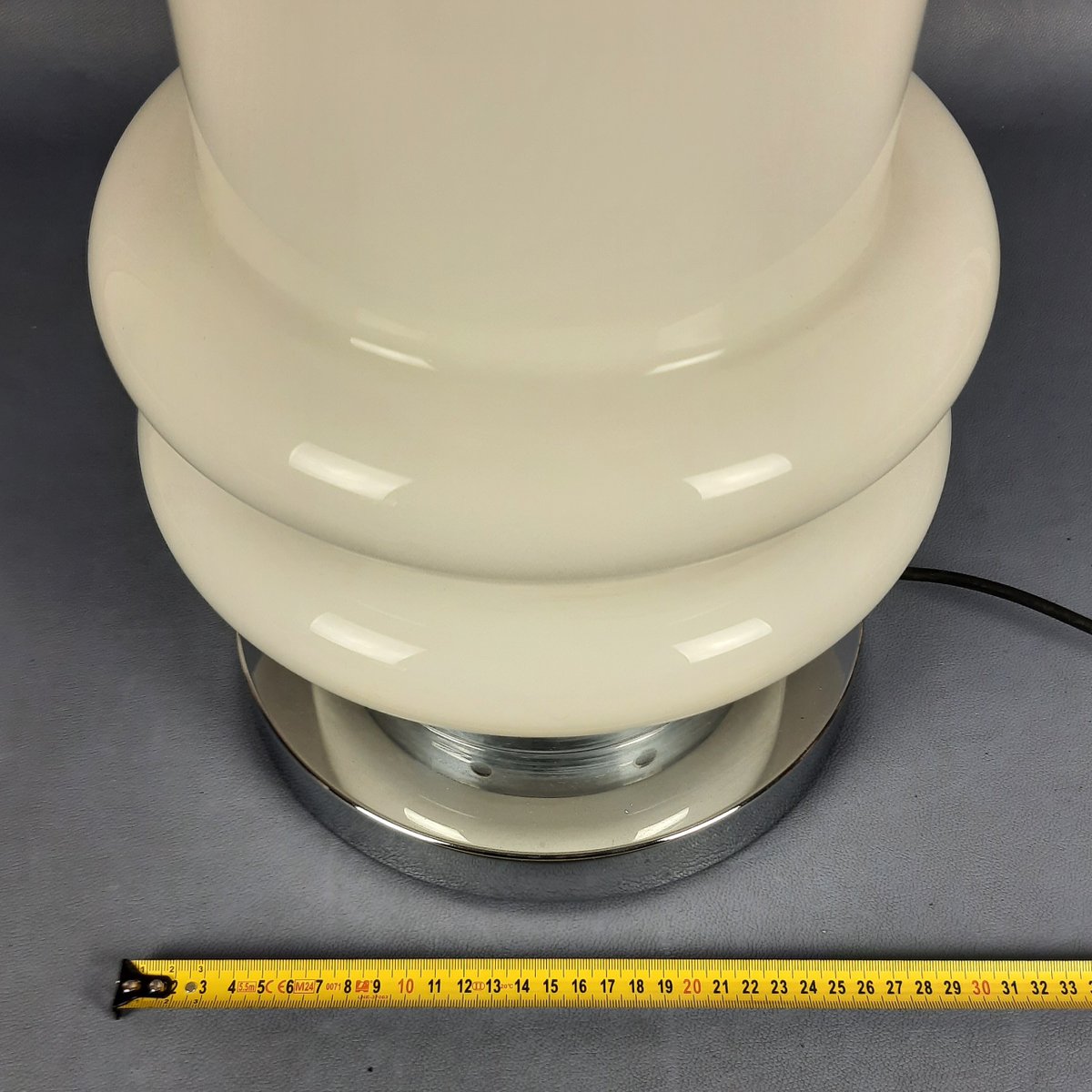 Add an icon of Italian design to your home with this charming vintage table lamp, a piece that perfectly embodies the bold and elegant style of the 1970s. The lamp stands out for its unique design, composed of a matte white glass body in the shape of a "skittle" with chromed metal details and base that enhance its modernity.
