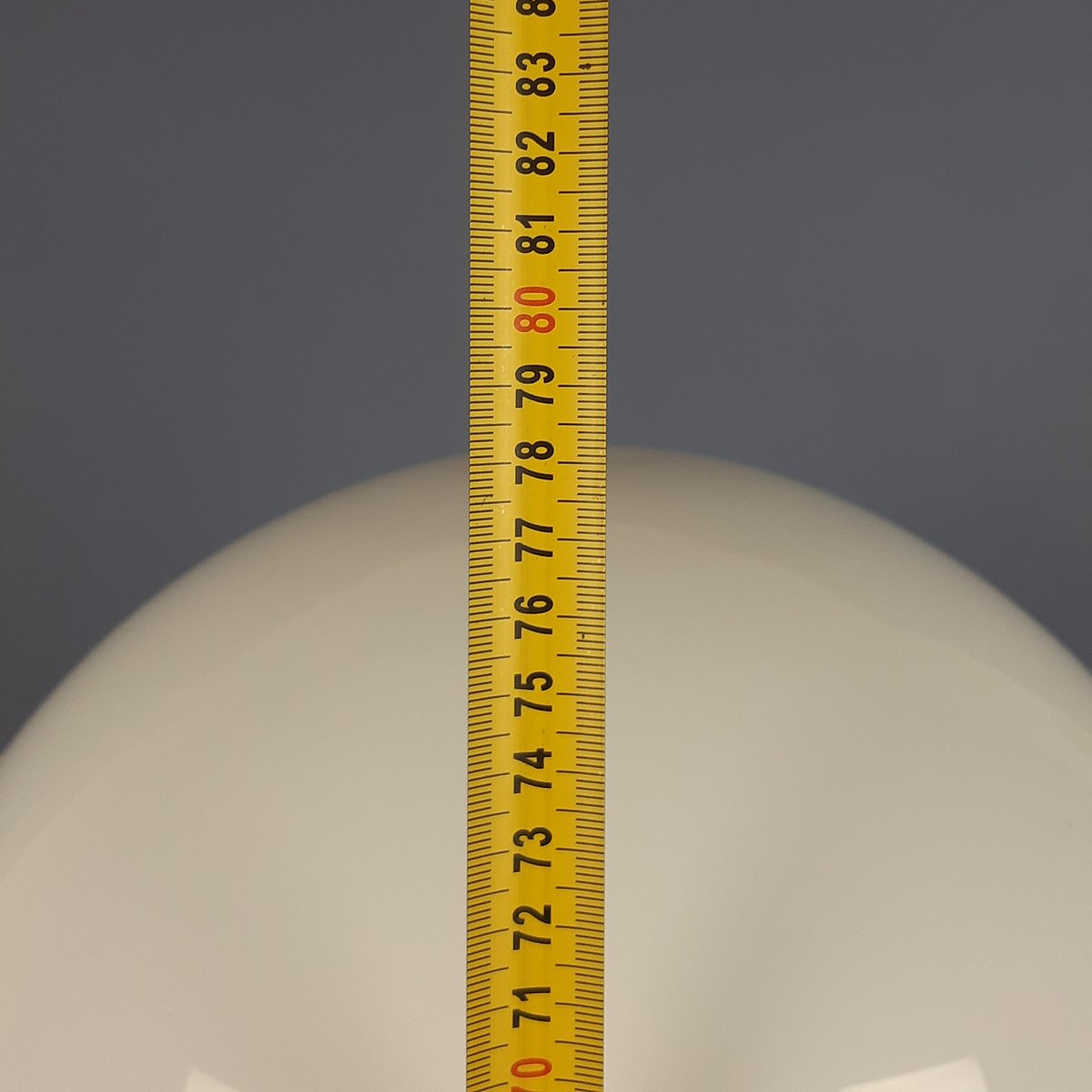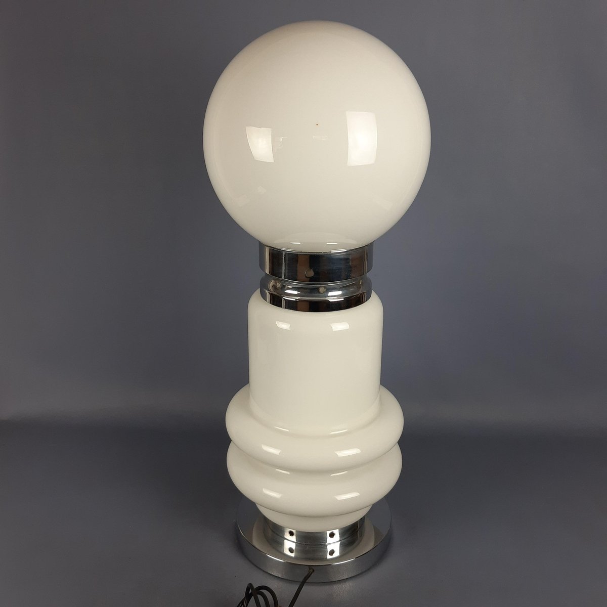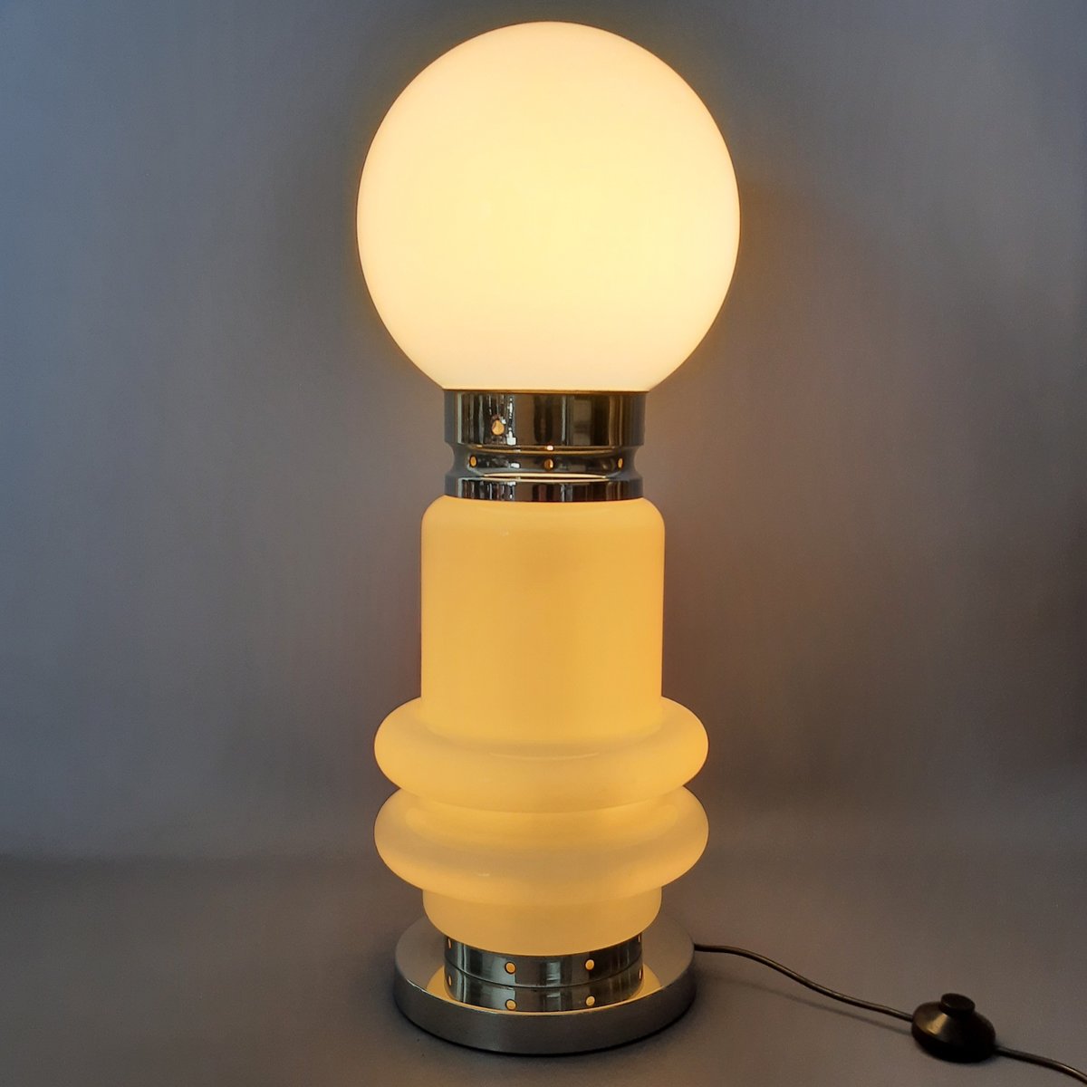 Add an icon of Italian design to your home with this charming vintage table lamp, a piece that perfectly embodies the bold and elegant style of the 1970s. The lamp stands out for its unique design, composed of a matte white glass body in the shape of a "skittle" with chromed metal details and base that enhance its modernity.