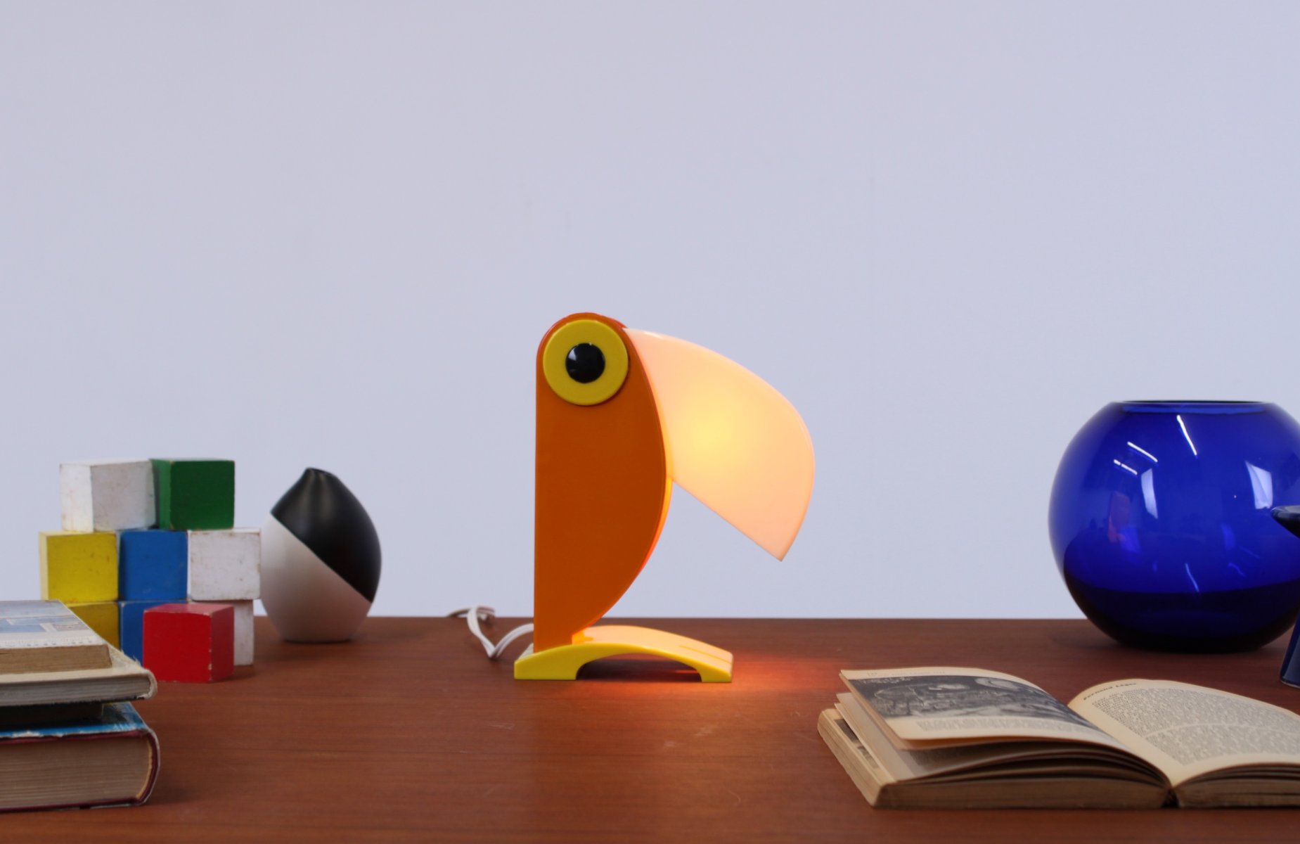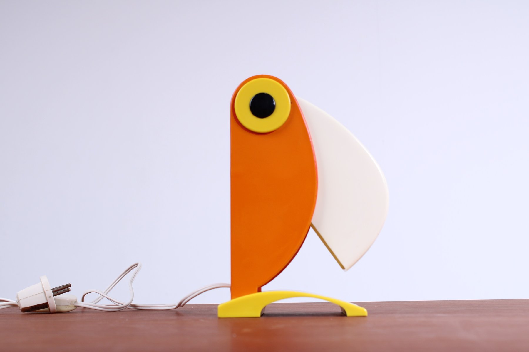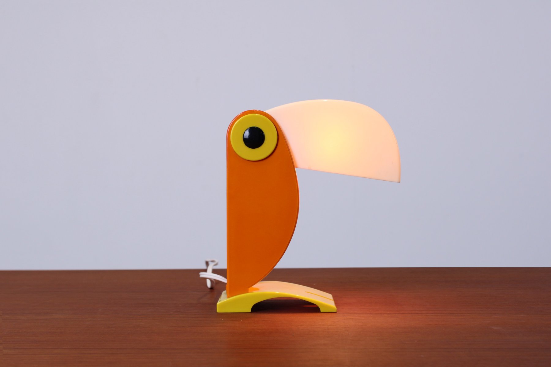 Icône du design italien, cette petite lampe de table caractéristique en forme de toucan (ou de perroquet), fabriquée par le "vieux routier Ferrari / Vérone, Italie", fin des années 1960. Le design coloré et figuratif prédit le mouvement italien Memphis des années quatre-vingt. Il n'est pas signé du logo du fabricant mais, d'après les recherches effectuées, les pièces marquées et non marquées sont des productions originales de la FTO. Le bec peut s'ouvrir et se fermer pour varier l'intensité de la lumière (une douille E14 normale, nécessite une petite ampoule de 7 à 15 watts, également disponible en LED). Lorsqu'elle est ouverte, la lampe mesure 27 cm de haut.