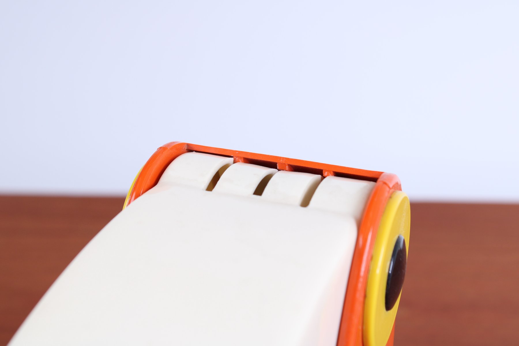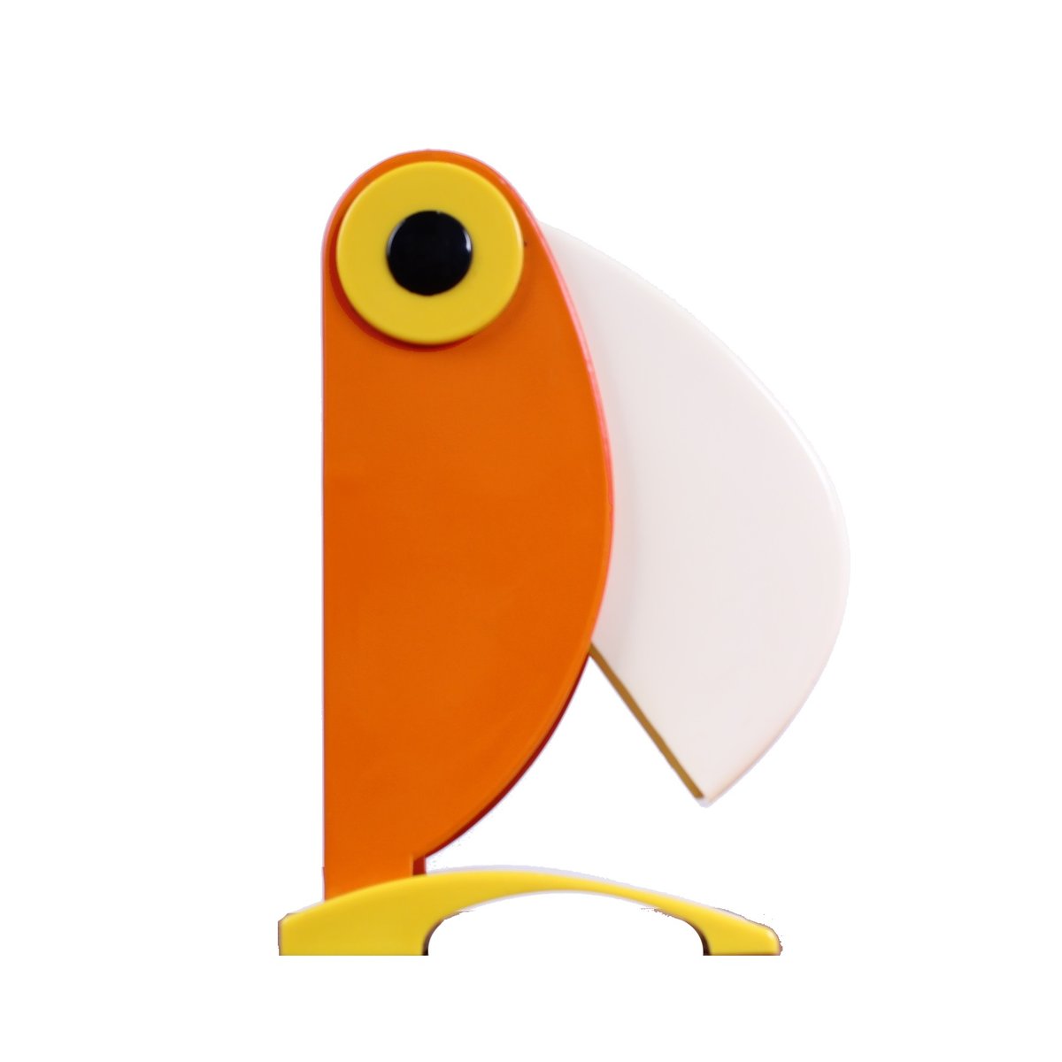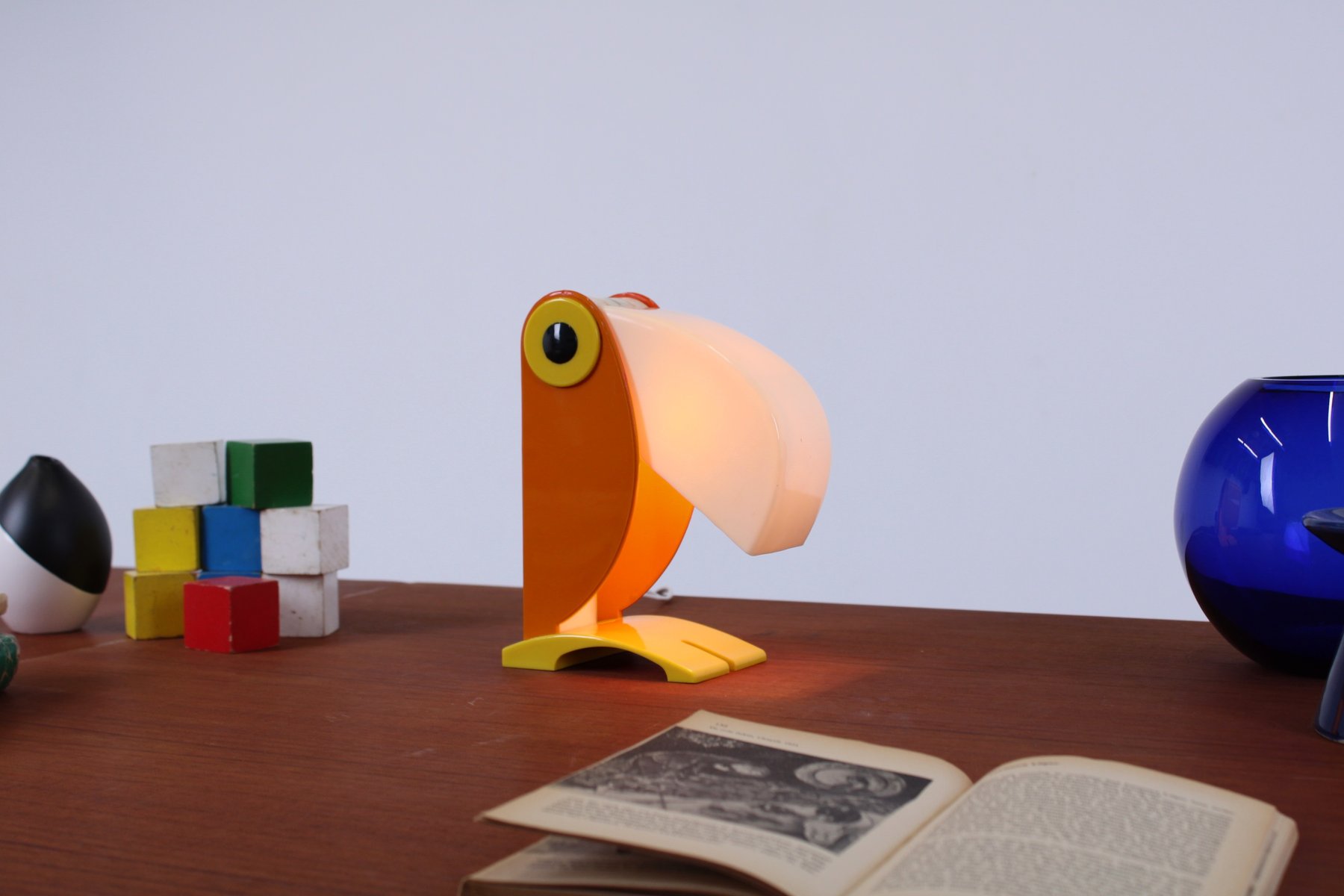 Icône du design italien, cette petite lampe de table caractéristique en forme de toucan (ou de perroquet), fabriquée par le "vieux routier Ferrari / Vérone, Italie", fin des années 1960. Le design coloré et figuratif prédit le mouvement italien Memphis des années quatre-vingt. Il n'est pas signé du logo du fabricant mais, d'après les recherches effectuées, les pièces marquées et non marquées sont des productions originales de la FTO. Le bec peut s'ouvrir et se fermer pour varier l'intensité de la lumière (une douille E14 normale, nécessite une petite ampoule de 7 à 15 watts, également disponible en LED). Lorsqu'elle est ouverte, la lampe mesure 27 cm de haut.