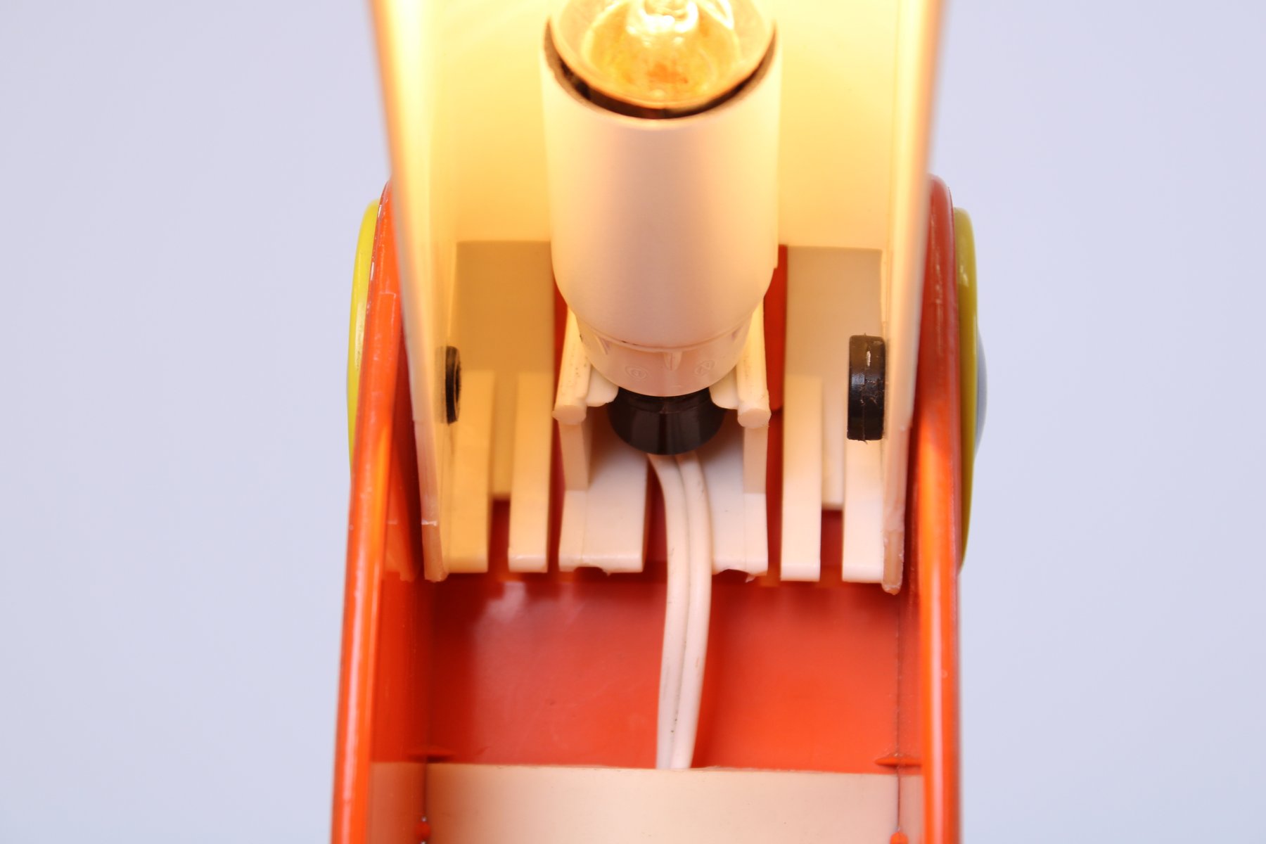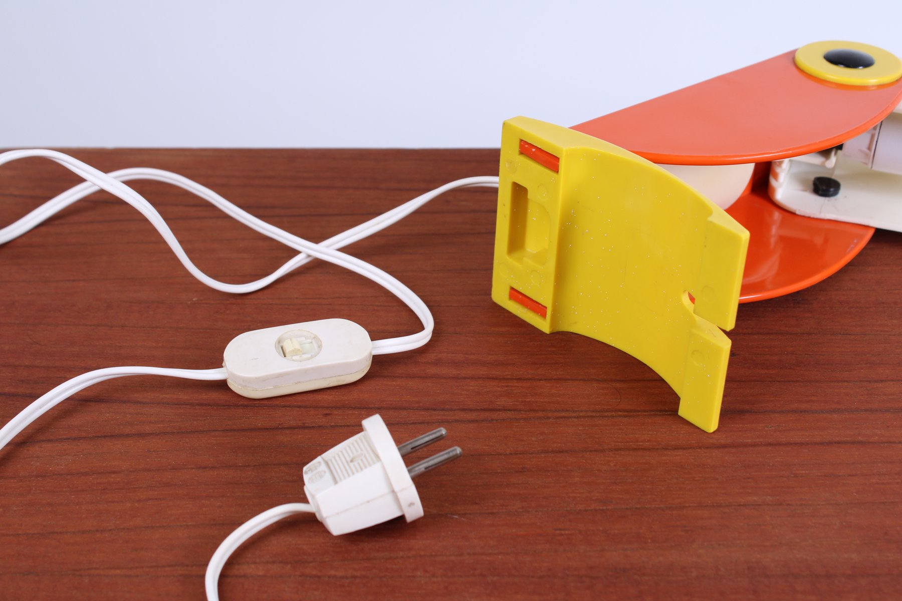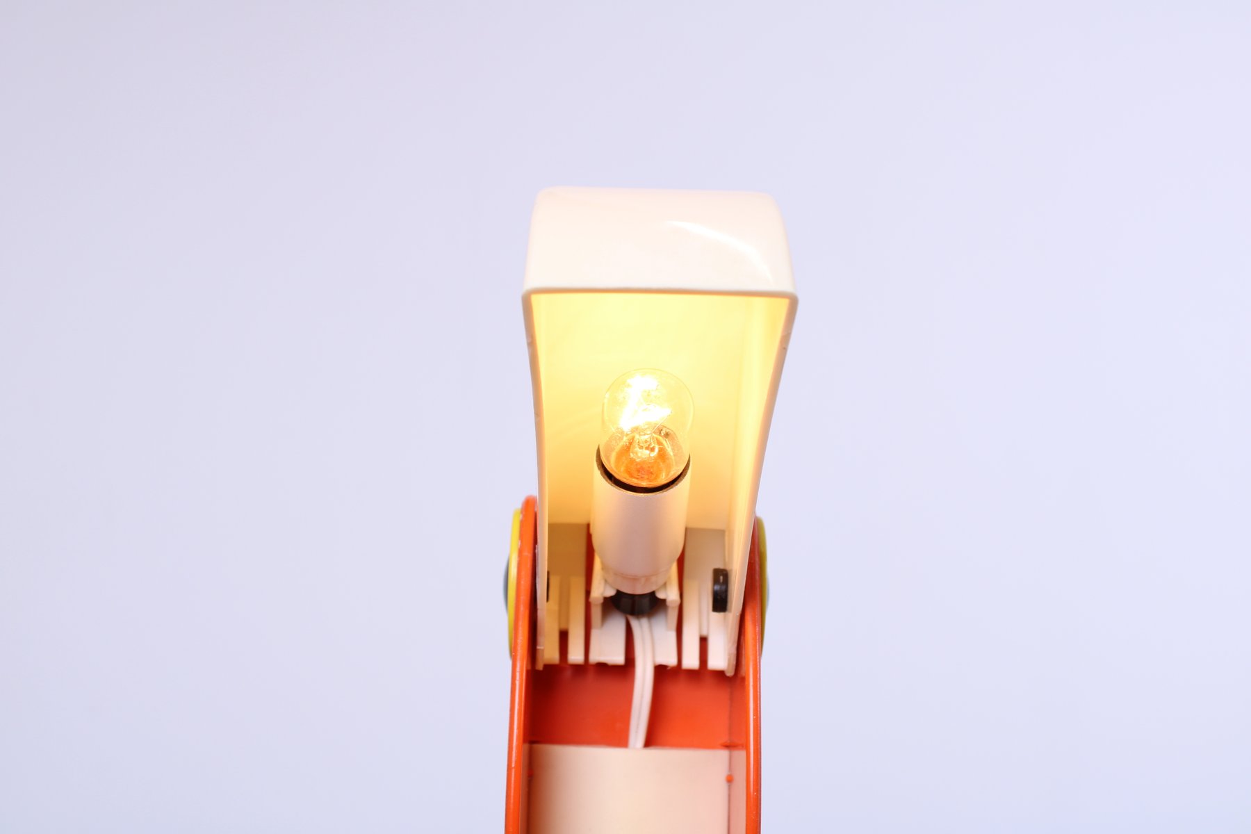 Des lampes très recherchées de nos jours. État : pas de zones de fusion, pas de marques de brûlure, pas de fissures dans le bec ou dans le corps orange. Légère décoloration. En état de marche, tous les éléments électriques ont été vérifiés, le câblage est en bon état.