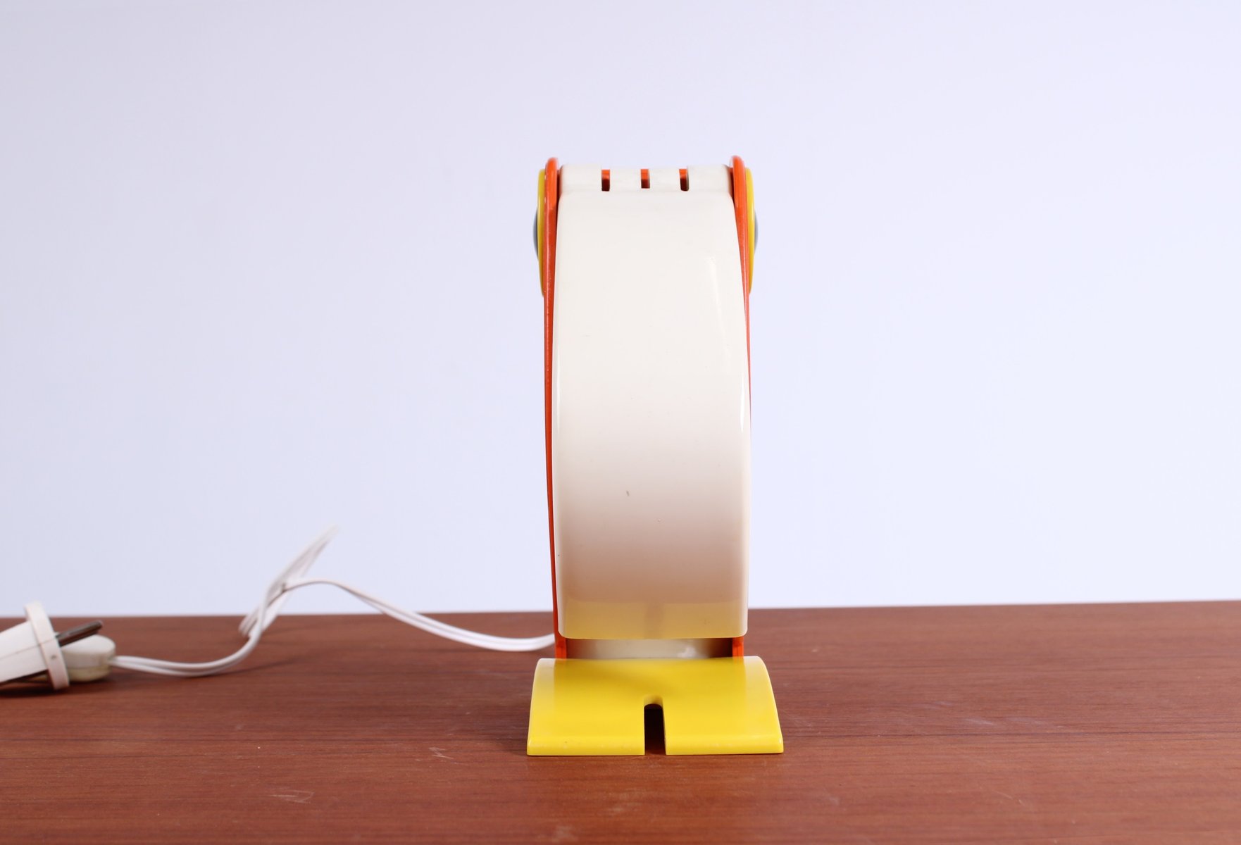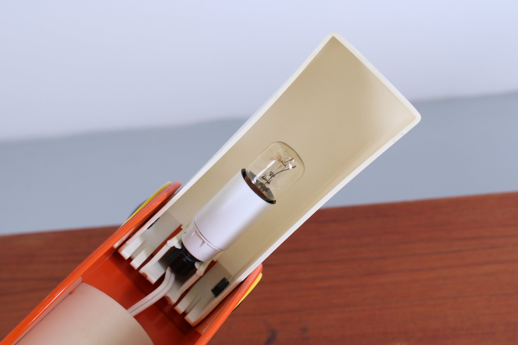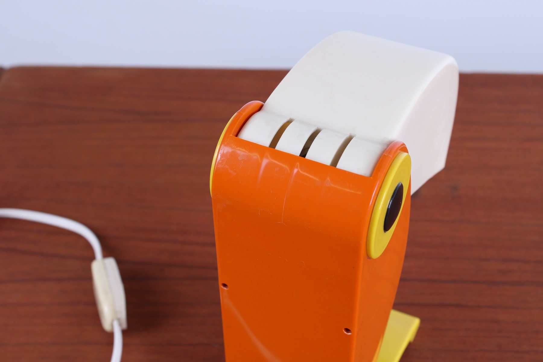 Des lampes très recherchées de nos jours. État : pas de zones de fusion, pas de marques de brûlure, pas de fissures dans le bec ou dans le corps orange. Légère décoloration. En état de marche, tous les éléments électriques ont été vérifiés, le câblage est en bon état.