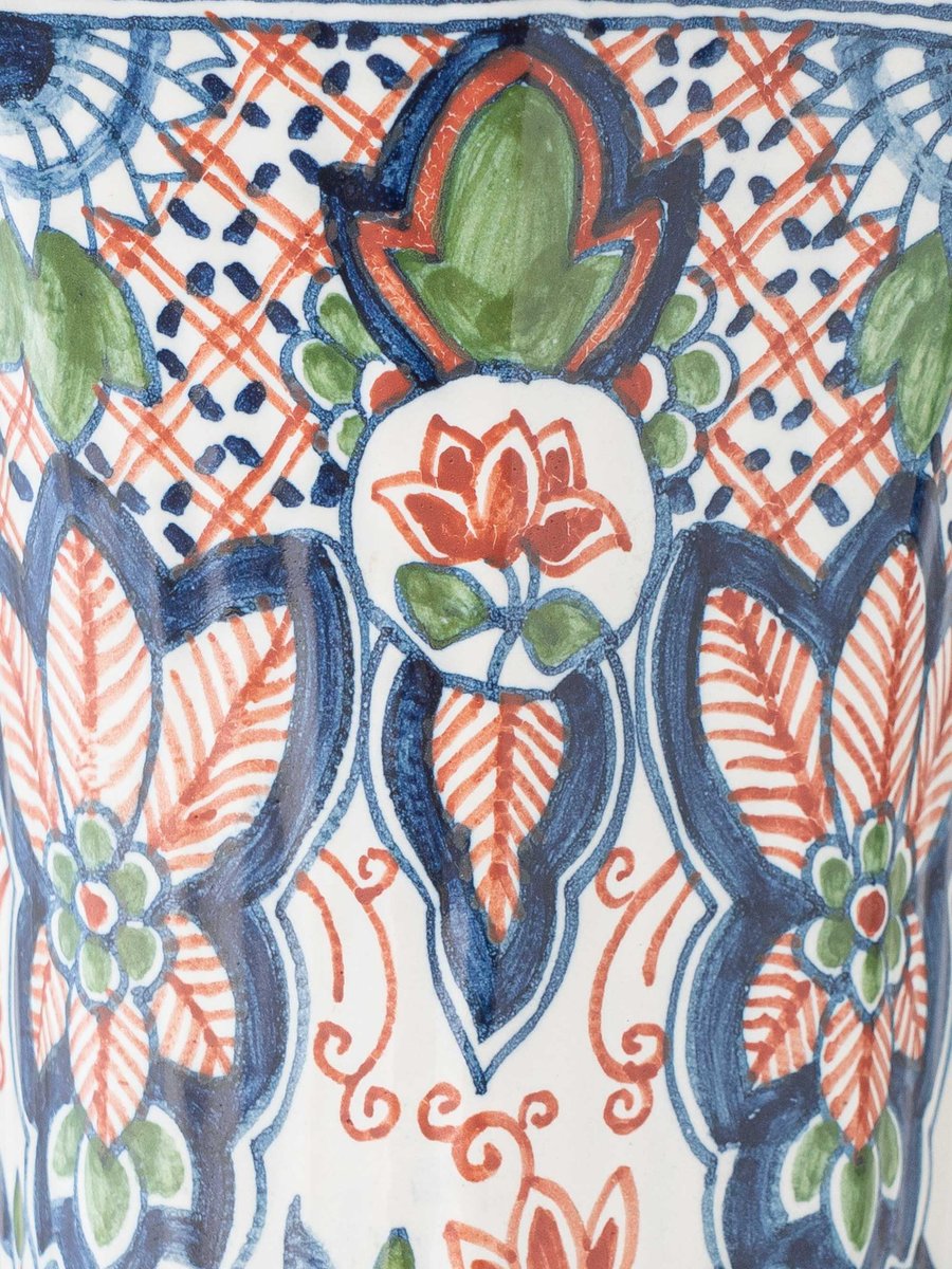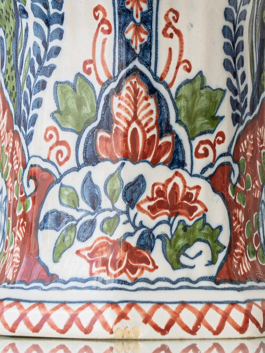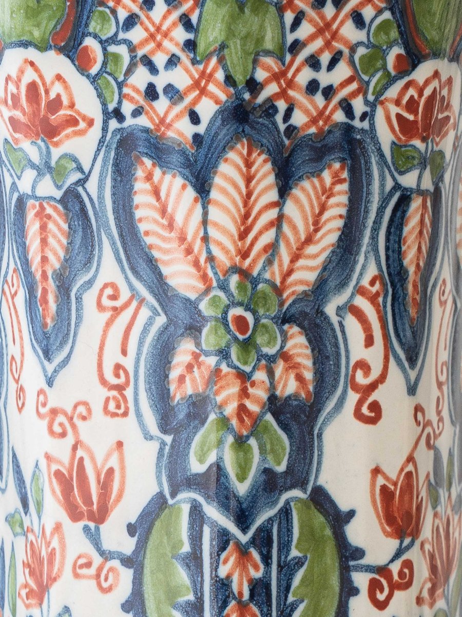 A beautifully balanced pair of mid-20th-century Dutch Delft (Delftware) table lamps made from hand-painted ceramic by Koninklijke (Royal) Tichelaar Makkum. The bases feature a vivid polychrome Delft palette—cobalt blue, brick red, and green—arranged in stylized florals and symmetrical scrolling motifs that read classic, collected, and lively.